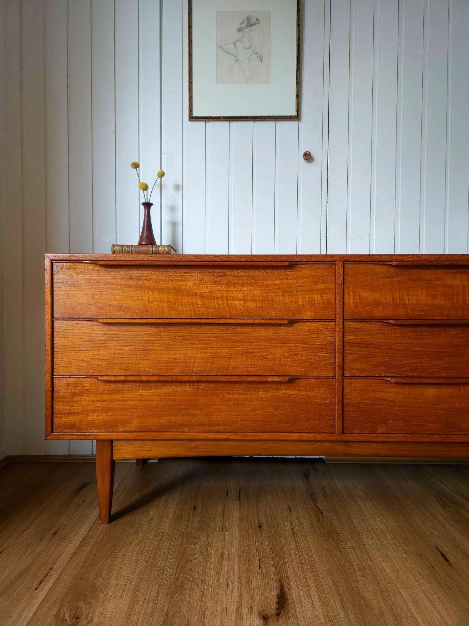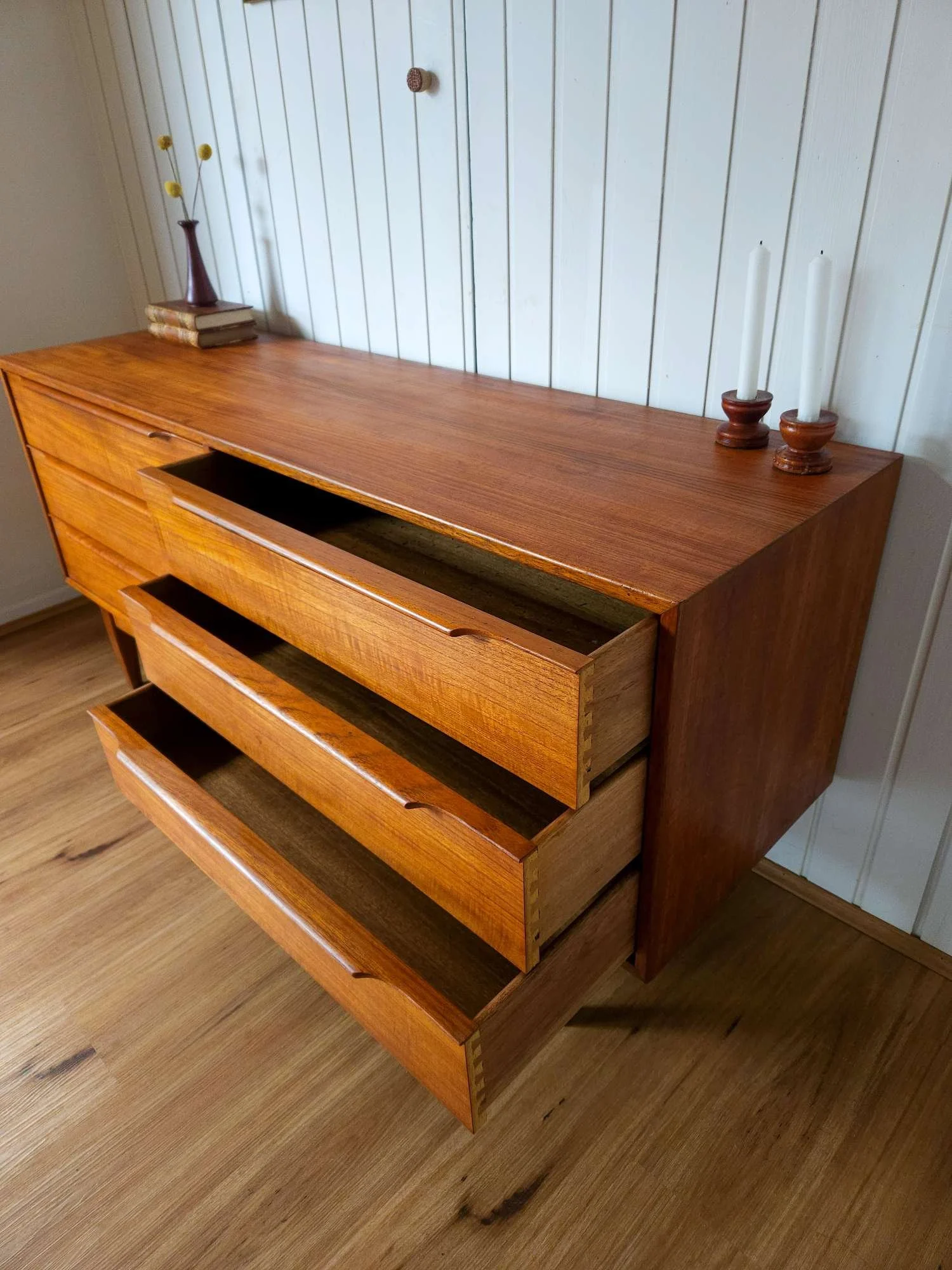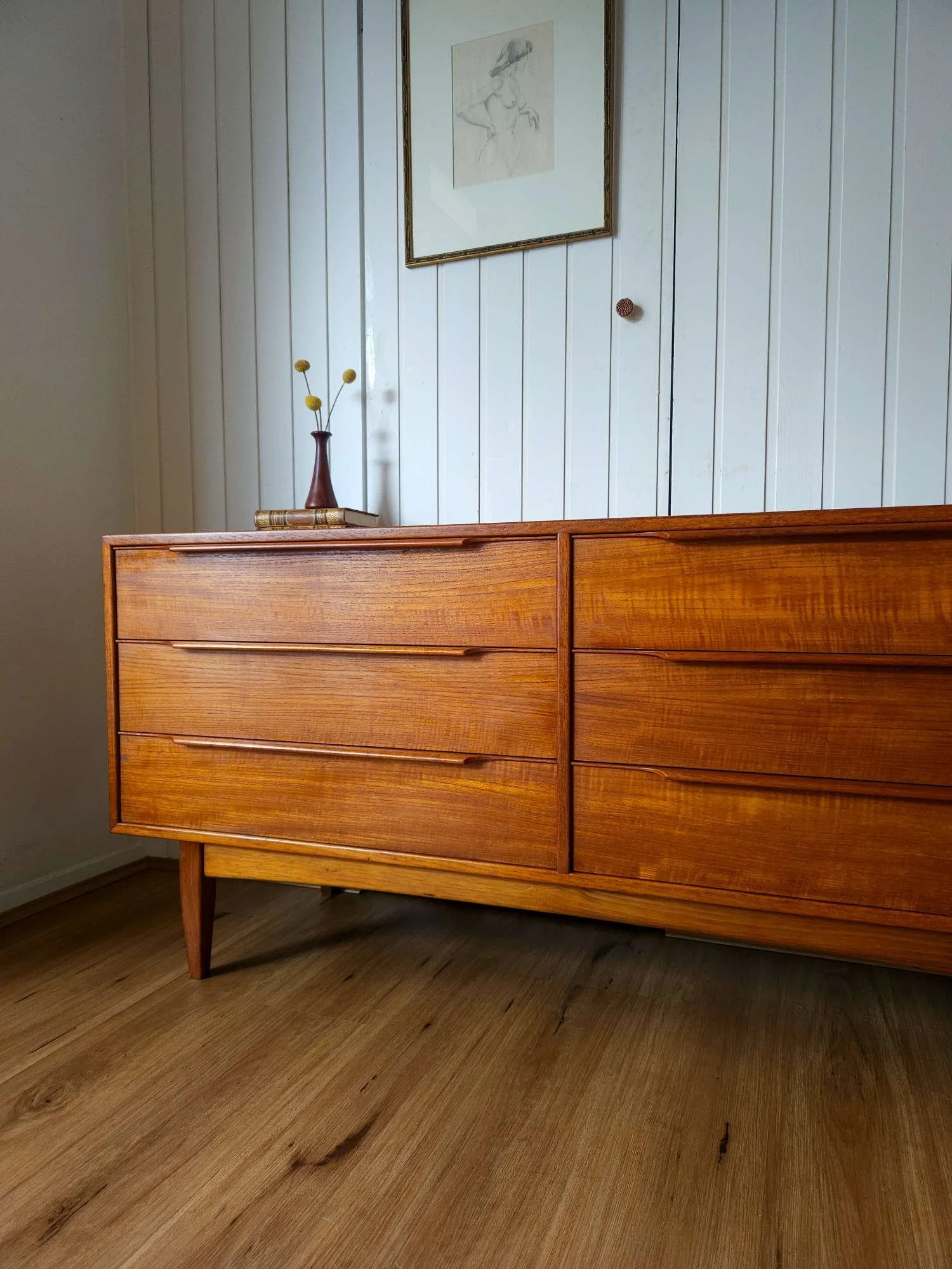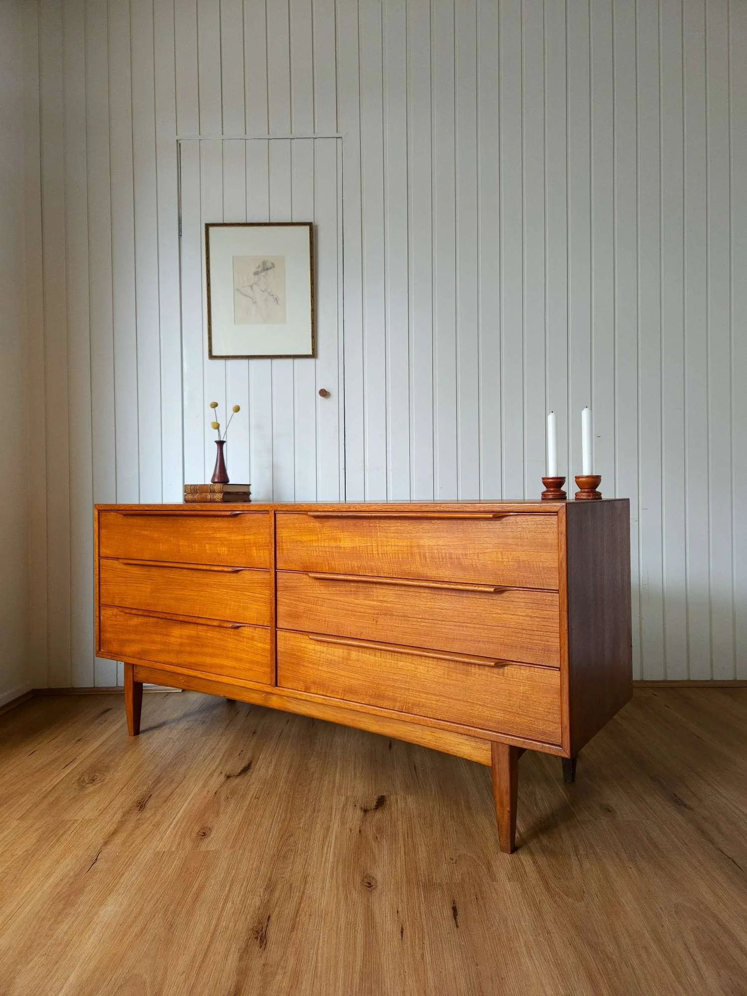 Classic mid century vintage dresser sideboard by Hans Hayson Furniture in teak and Blackwood.