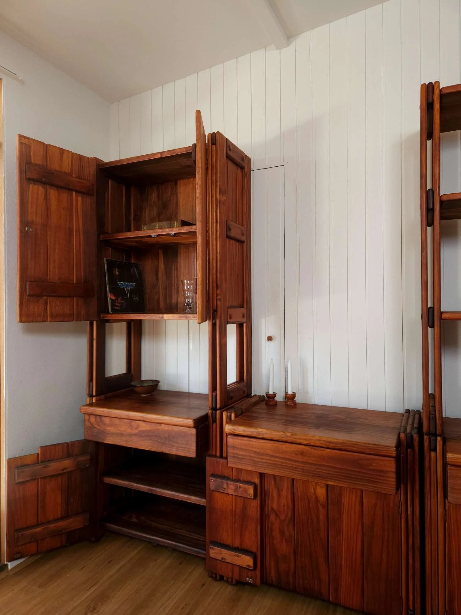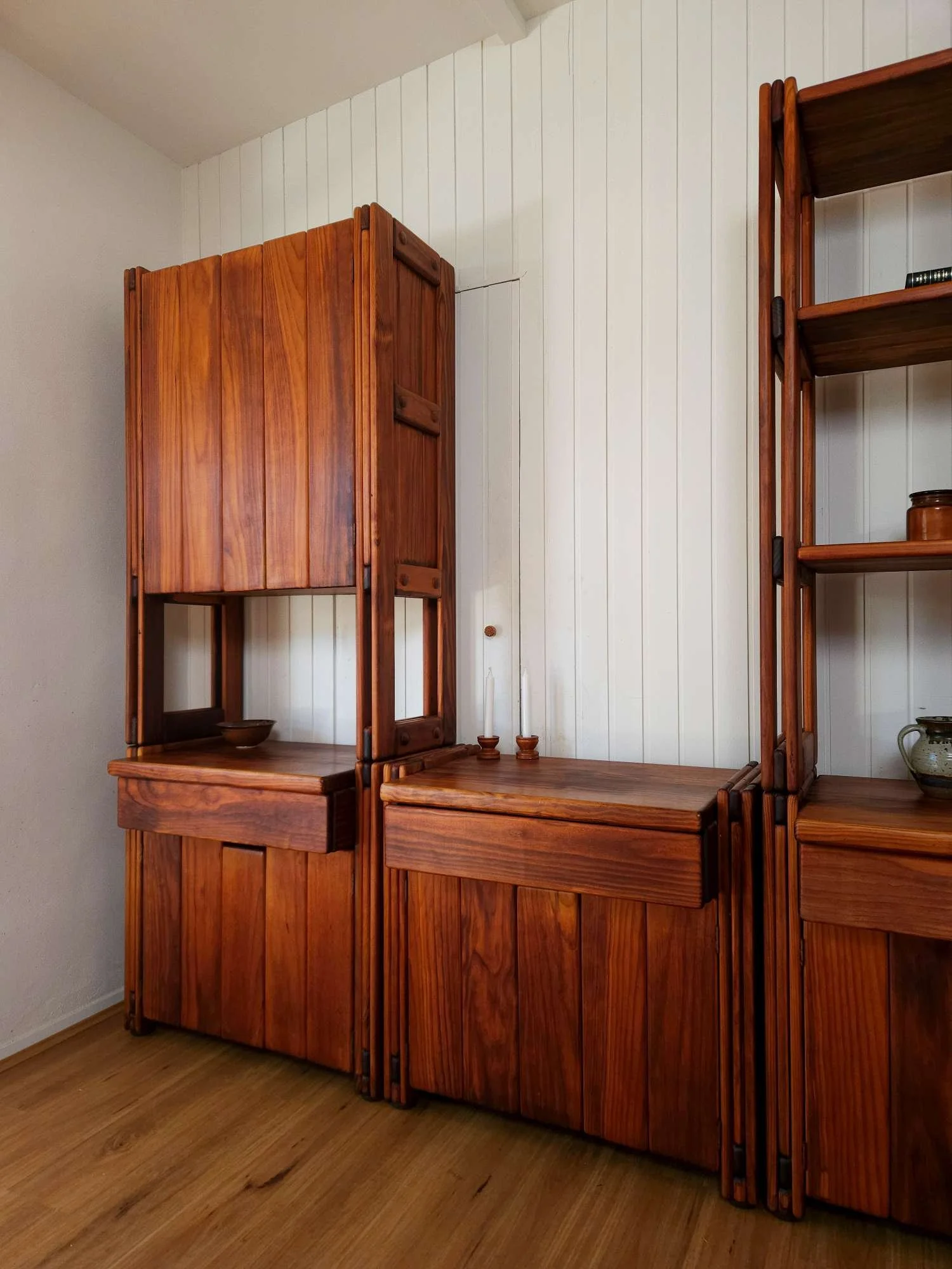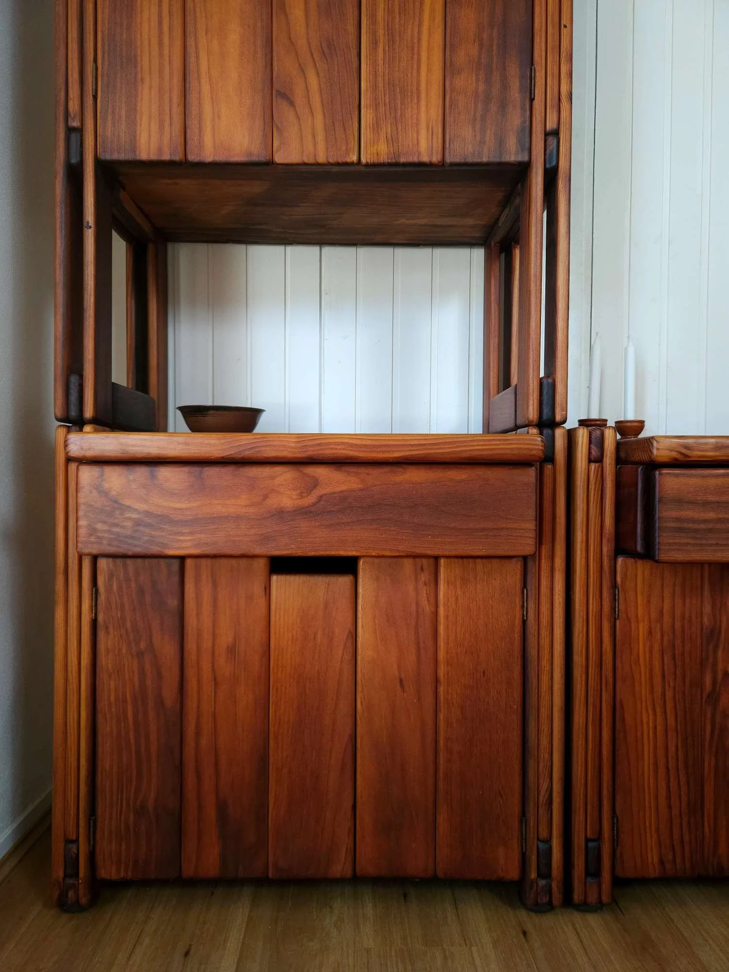 Features three base units and two top pieces. Can be adjusted and separated according to needs. The base units all have drawers and doors with internal shelves. All components are solid cedar wood througout.