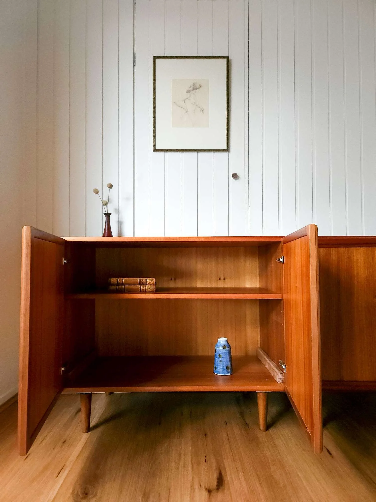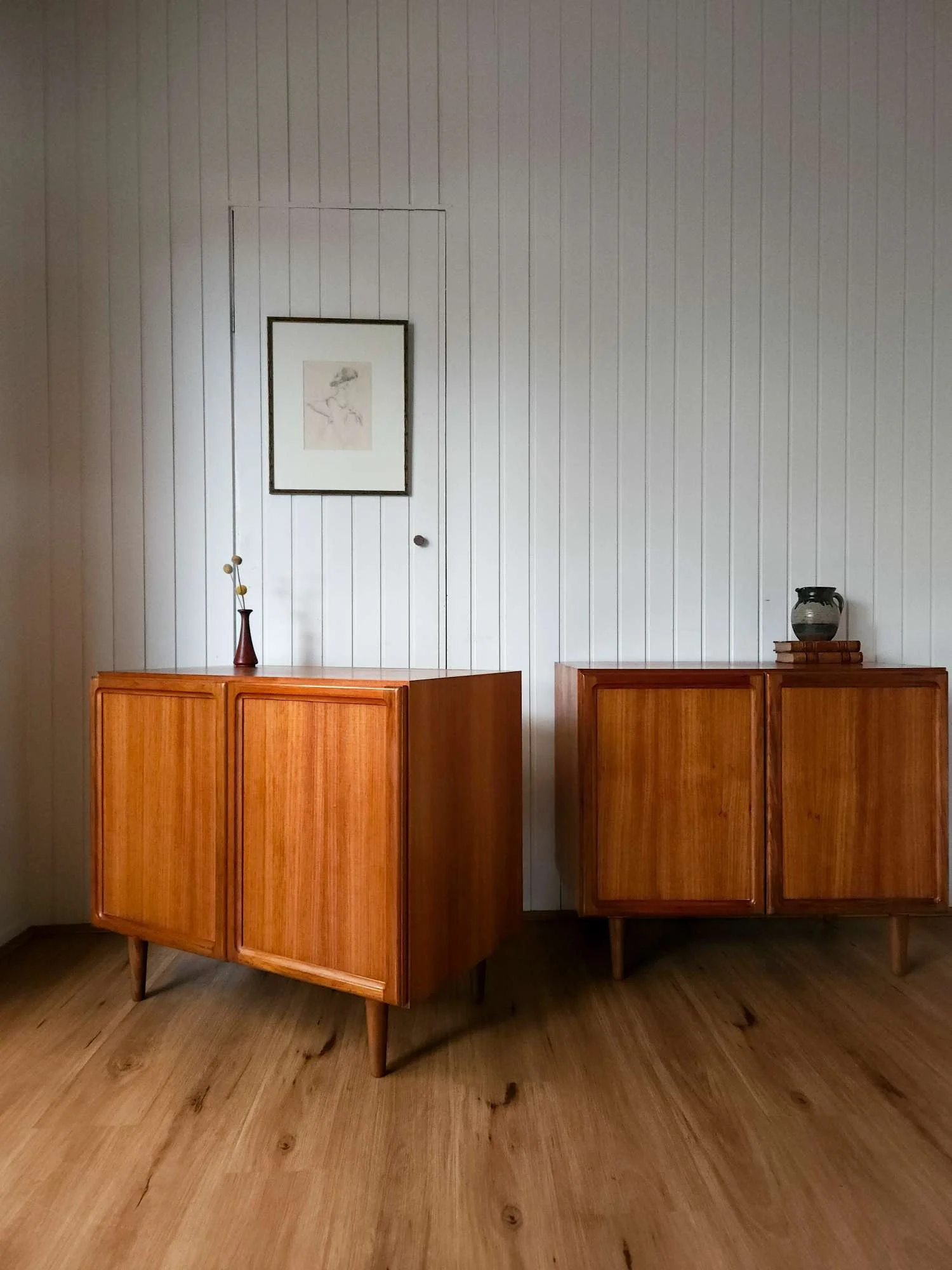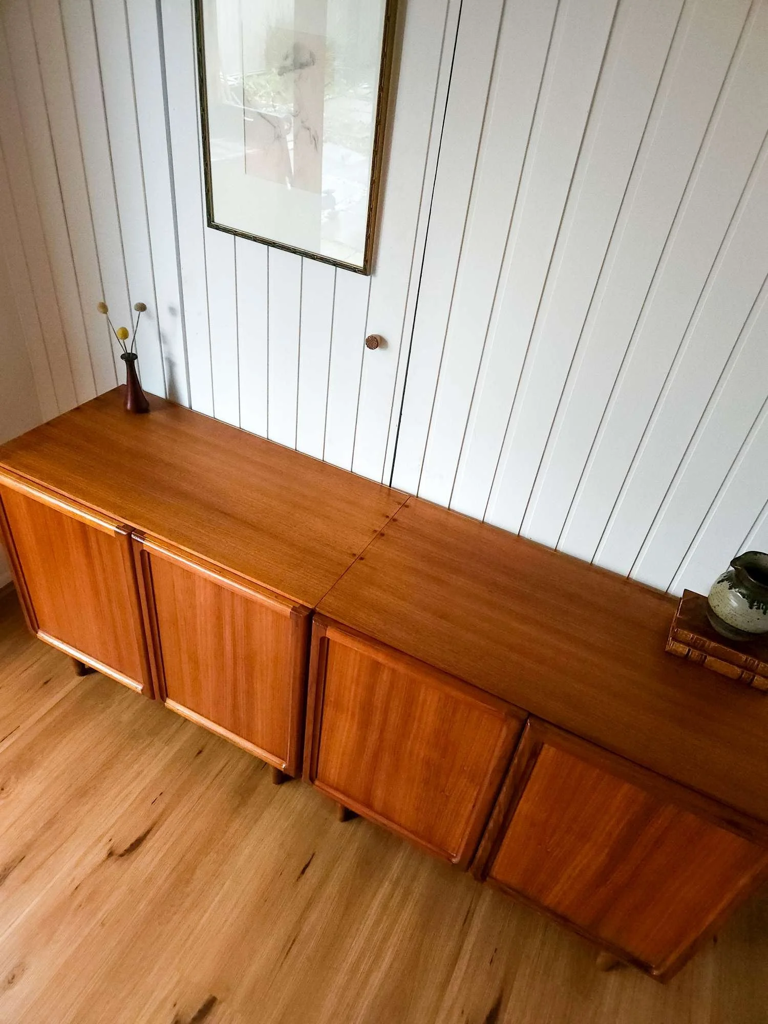 Classic mid century teak cabinets circa 1960s. Can be put together as a sideboard or placed separately.