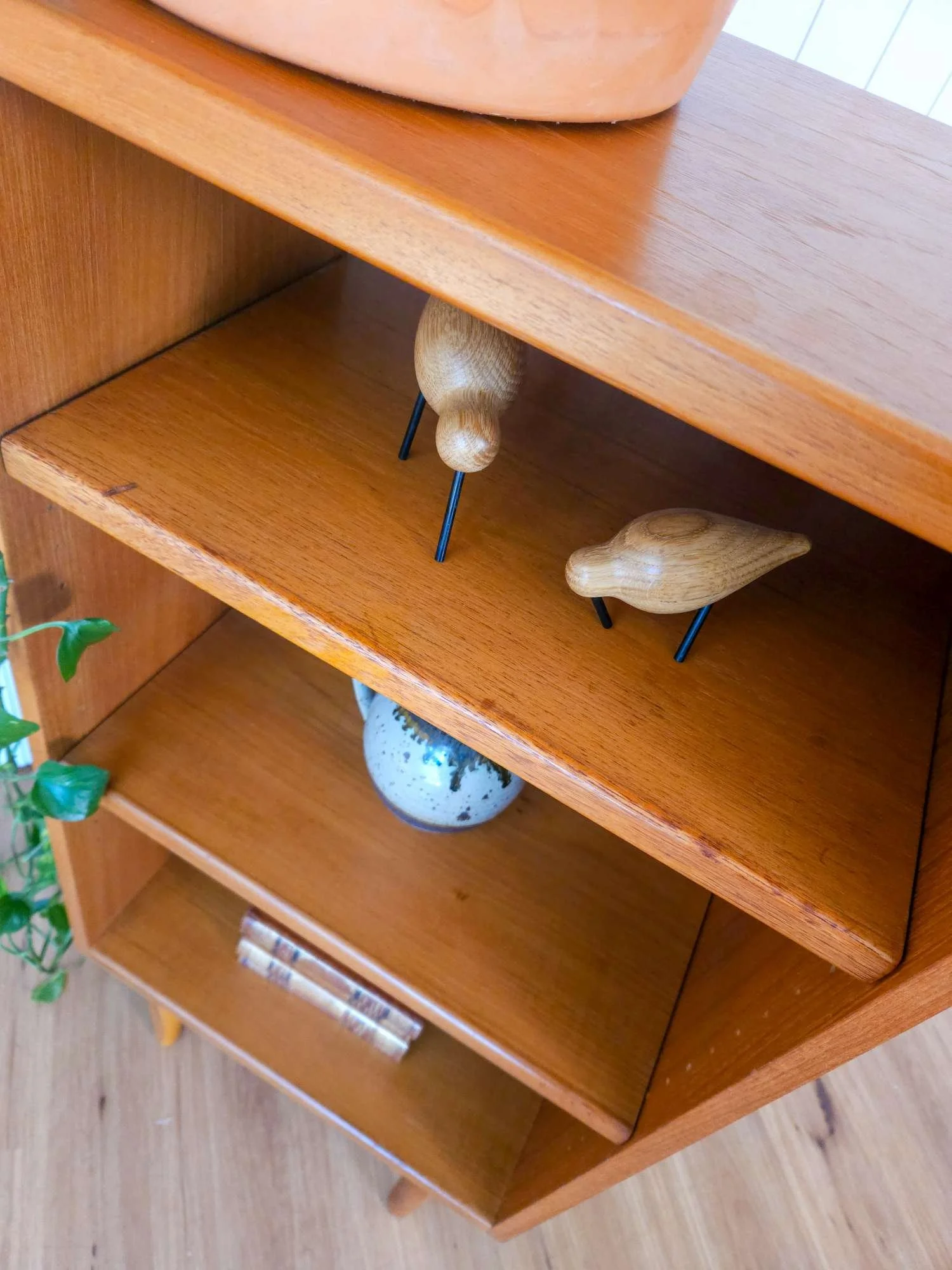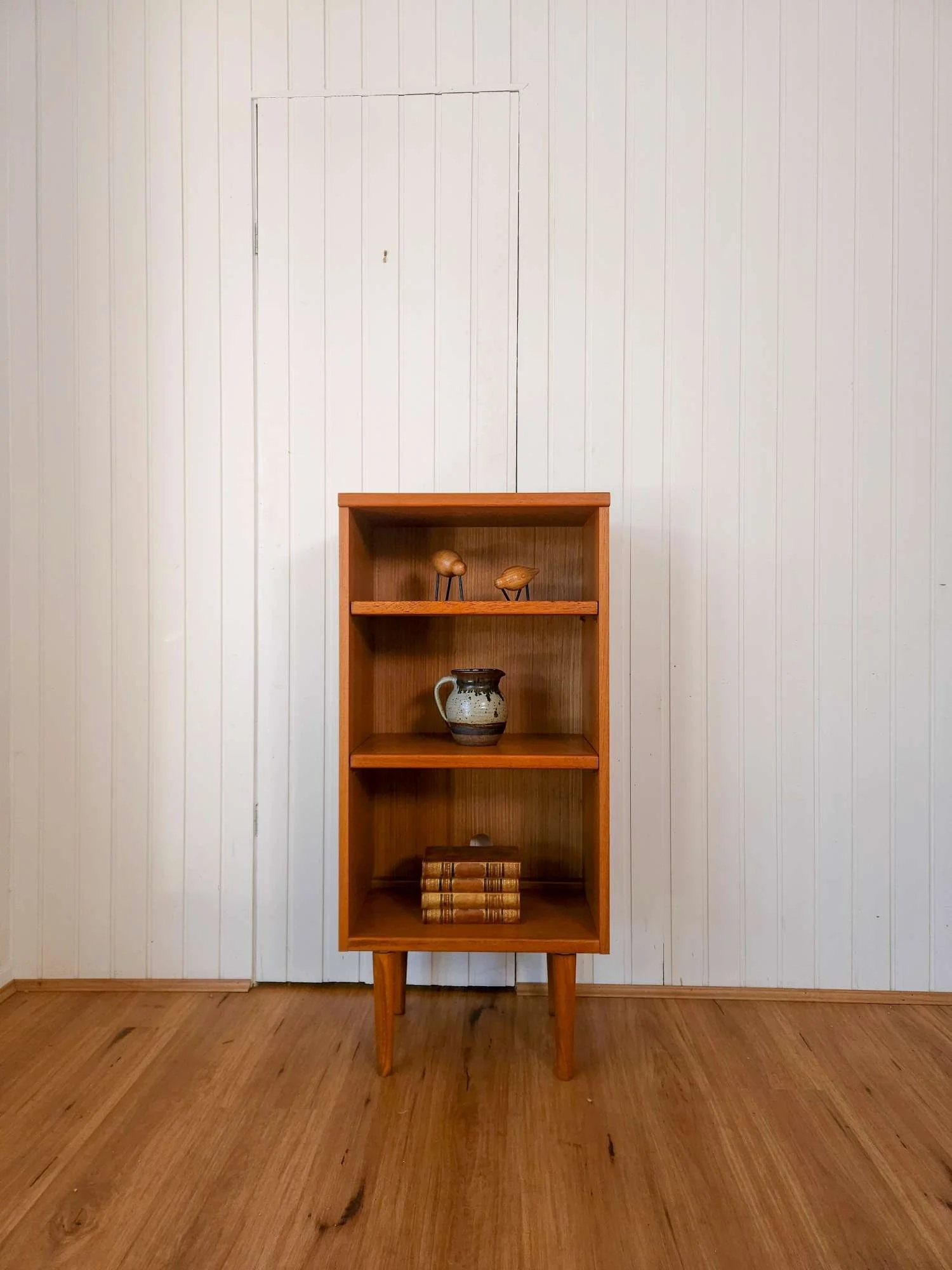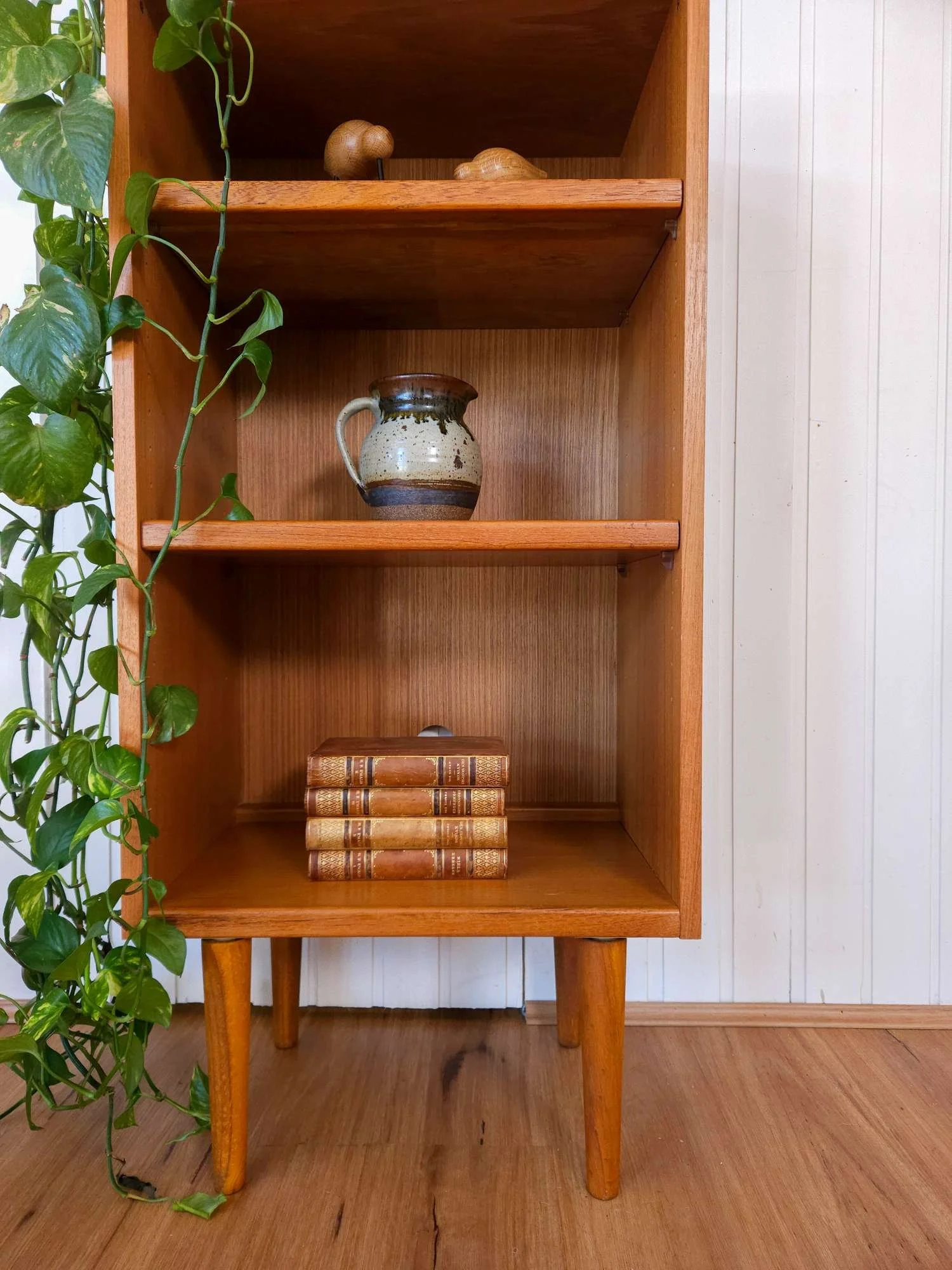 Fabulous teak bookcase crafted by Noblett Furniture and elevated on tapered legs. Comes with adjustable shelves and is good for vinyls or to display items.