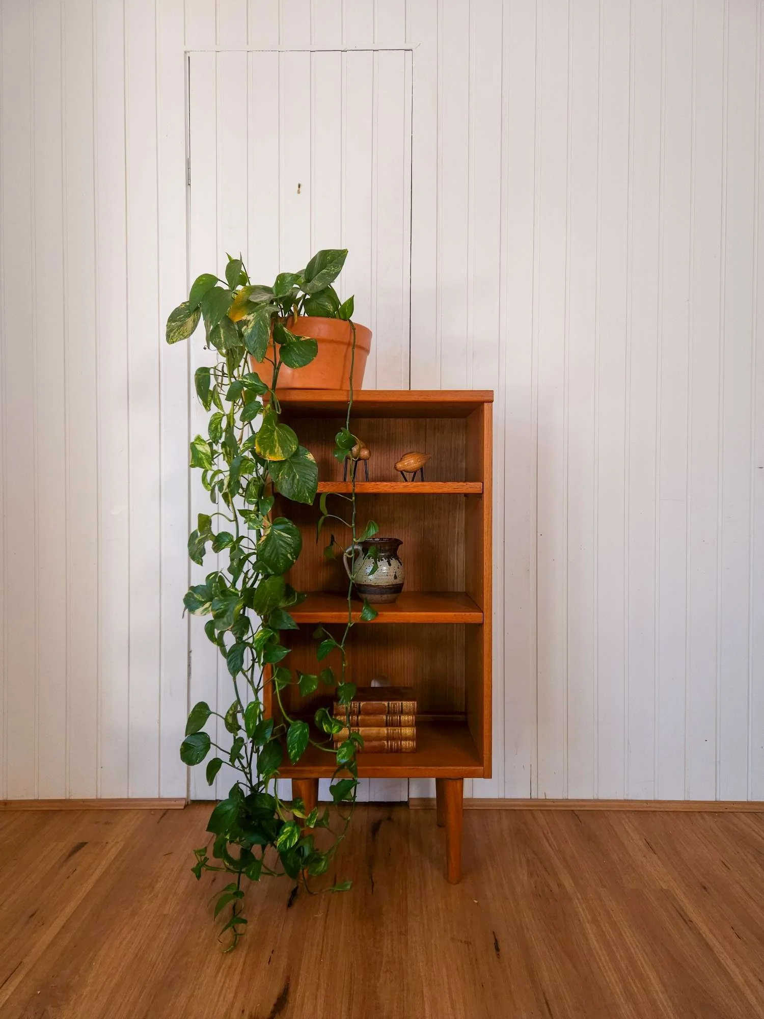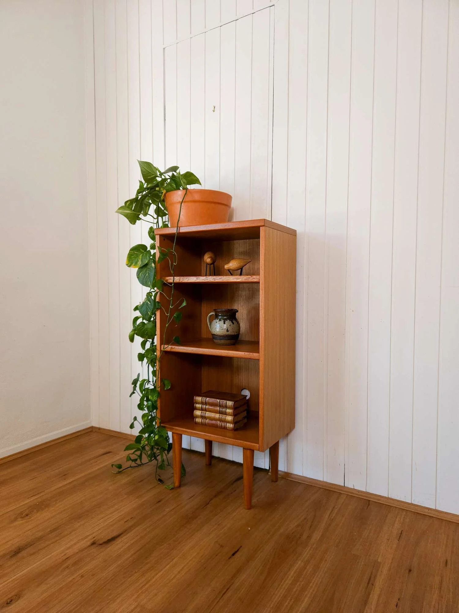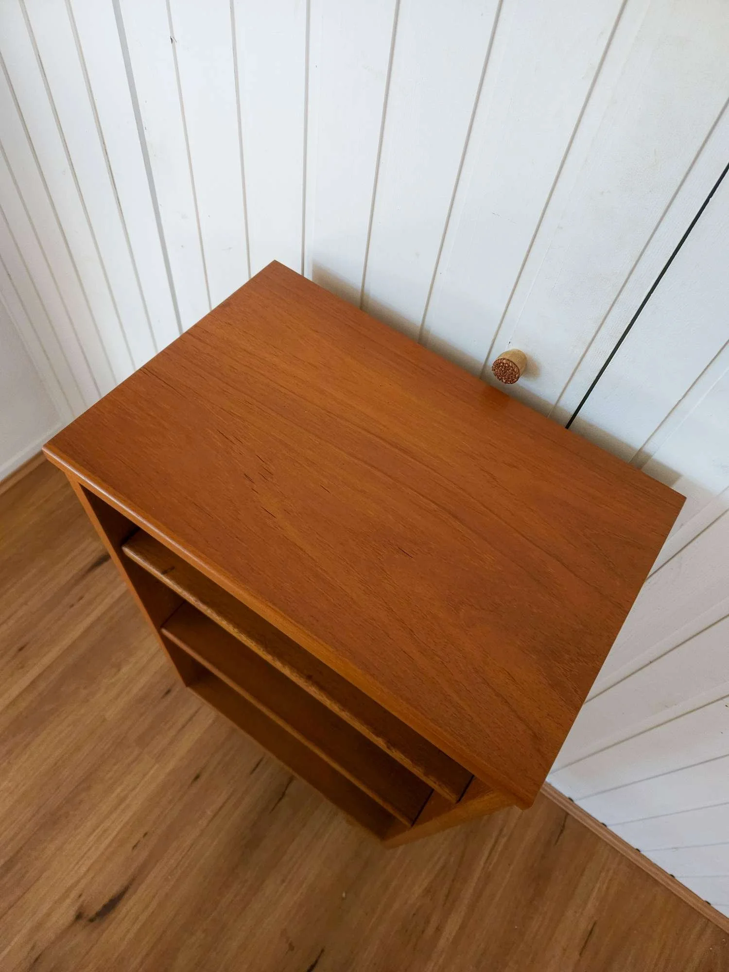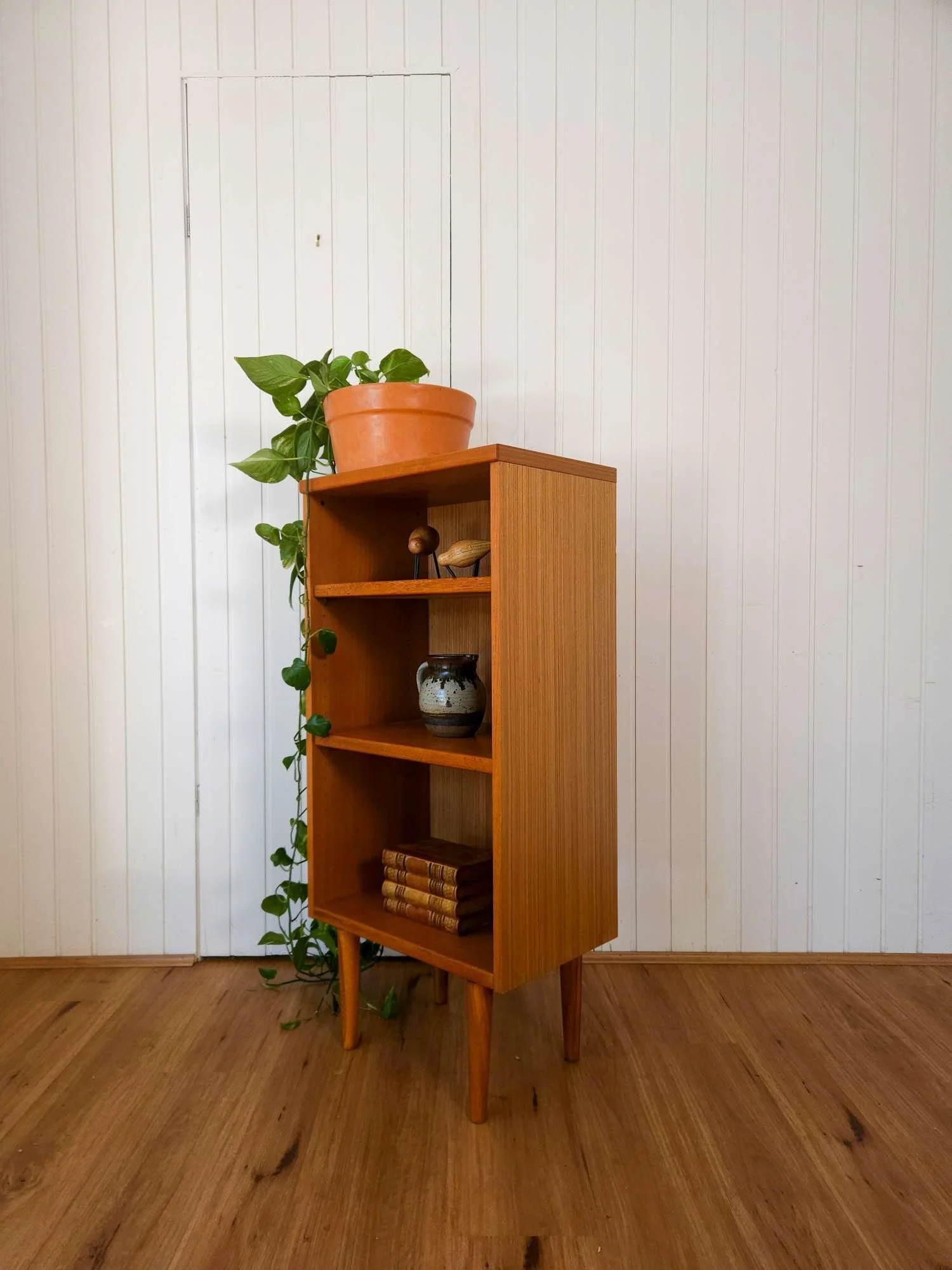 Fabulous teak bookcase crafted by Noblett Furniture and elevated on tapered legs. Comes with adjustable shelves and is good for vinyls or to display items.