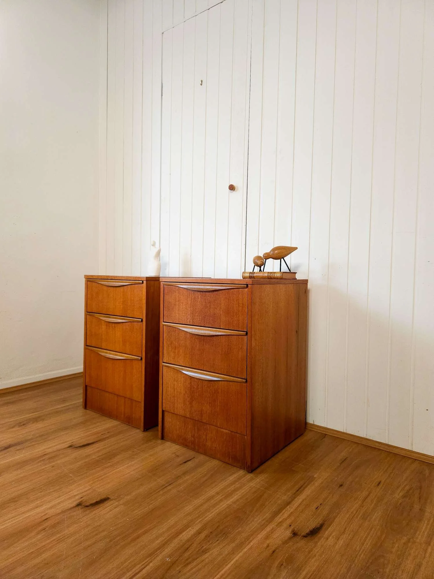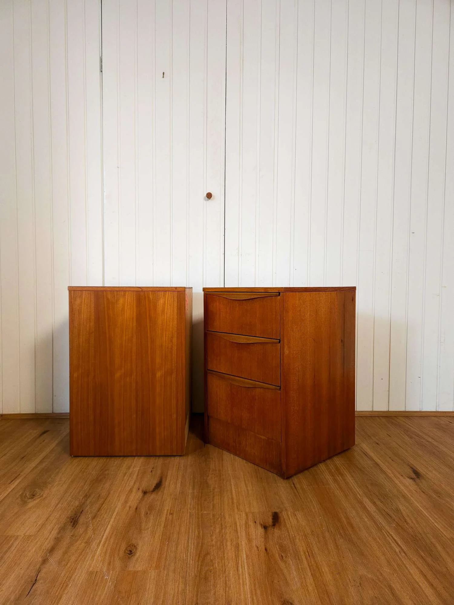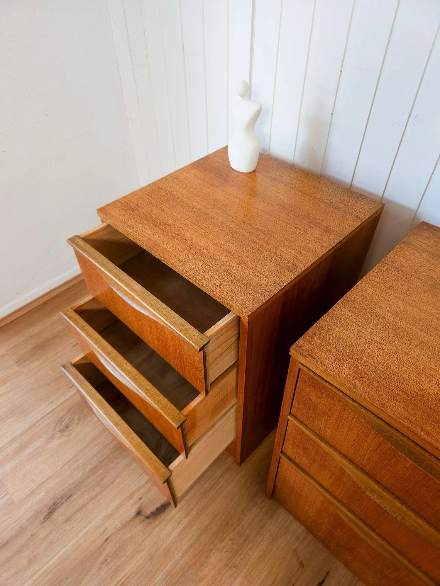 Mid century teak bedside tables by Reliance Furniture.