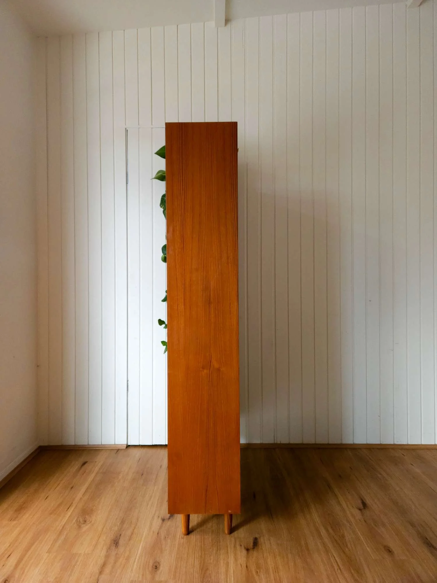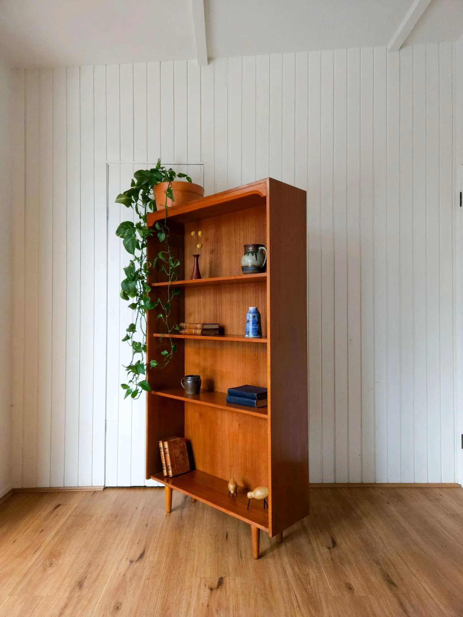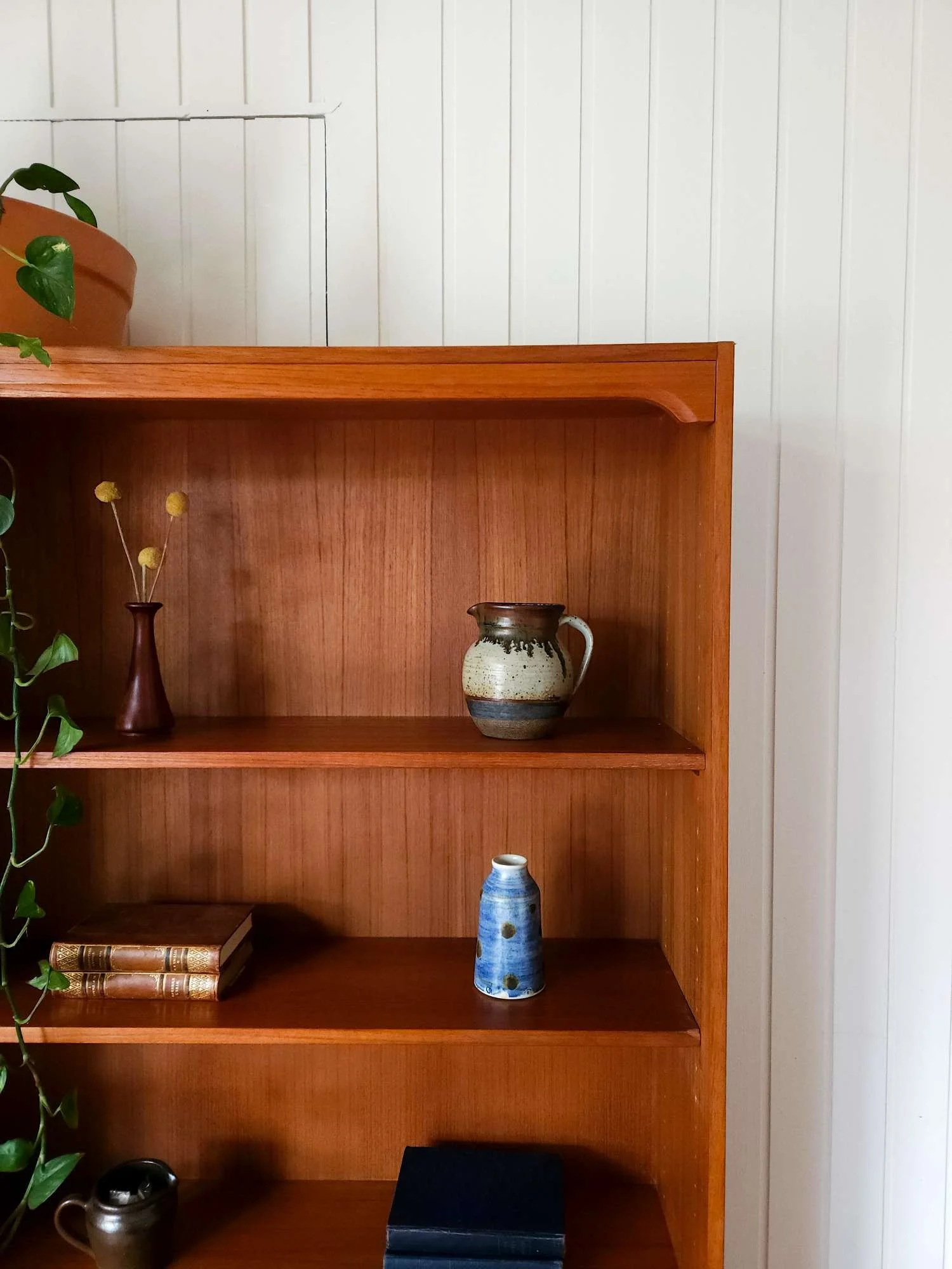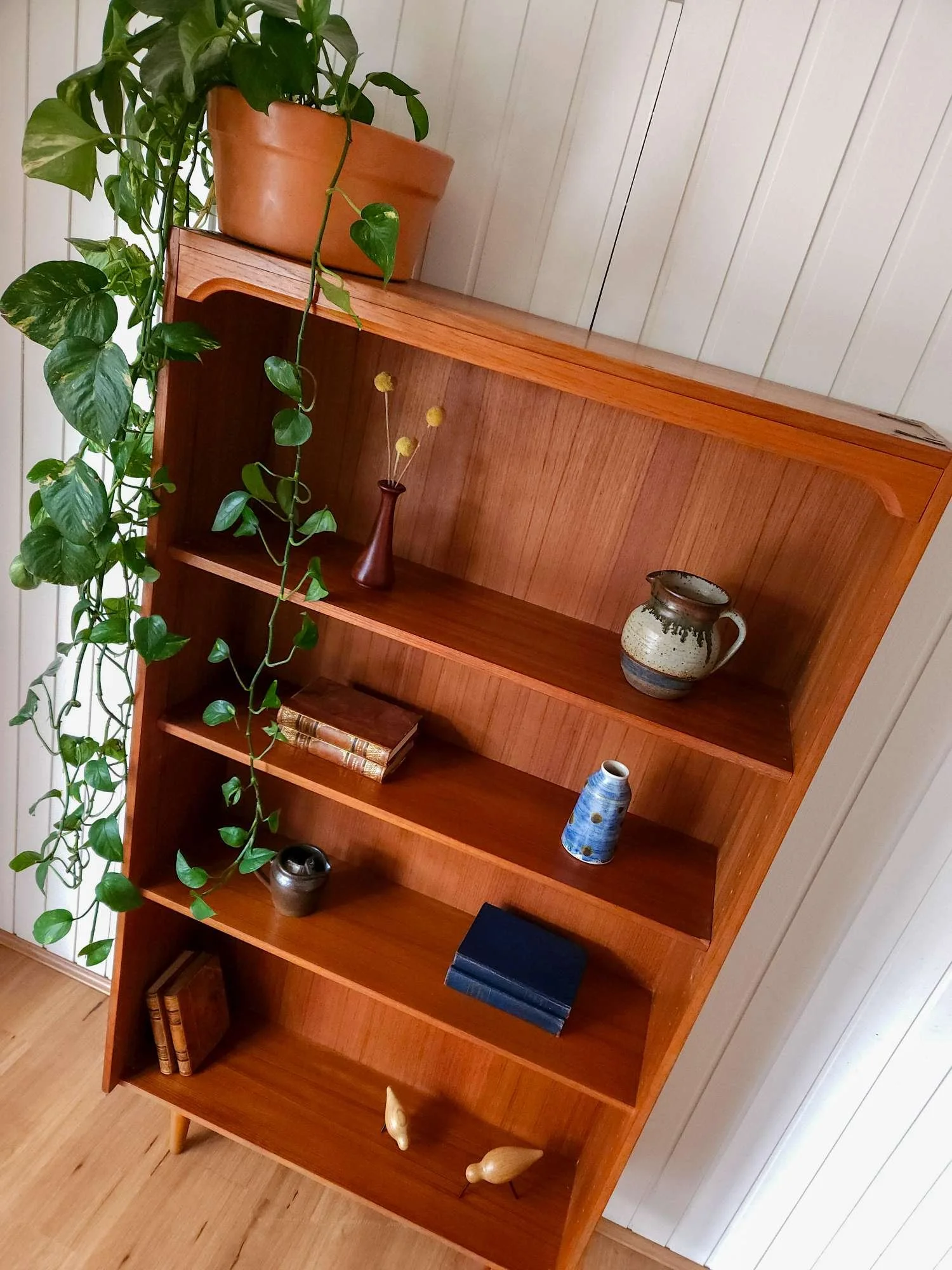 Features adjustable shelves, tapered legs and a gorgeous warm timber grain.