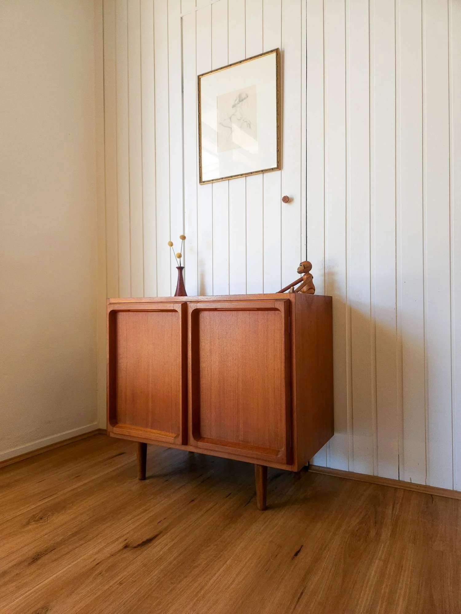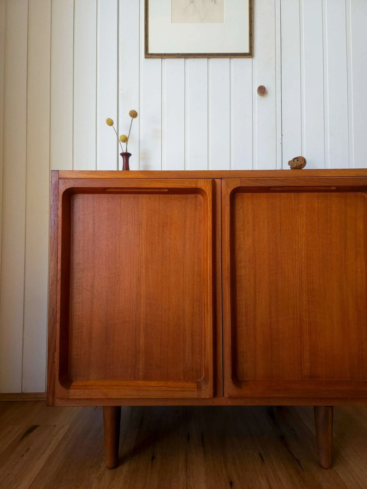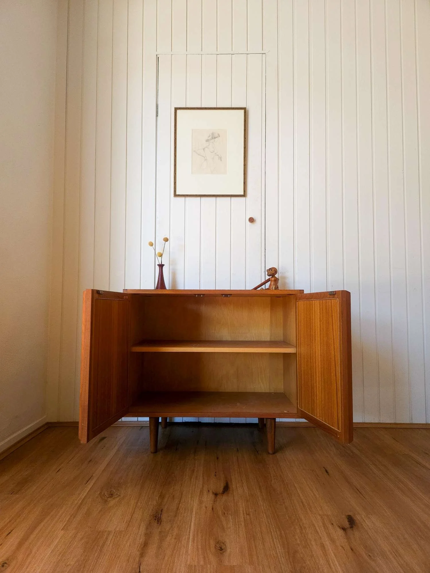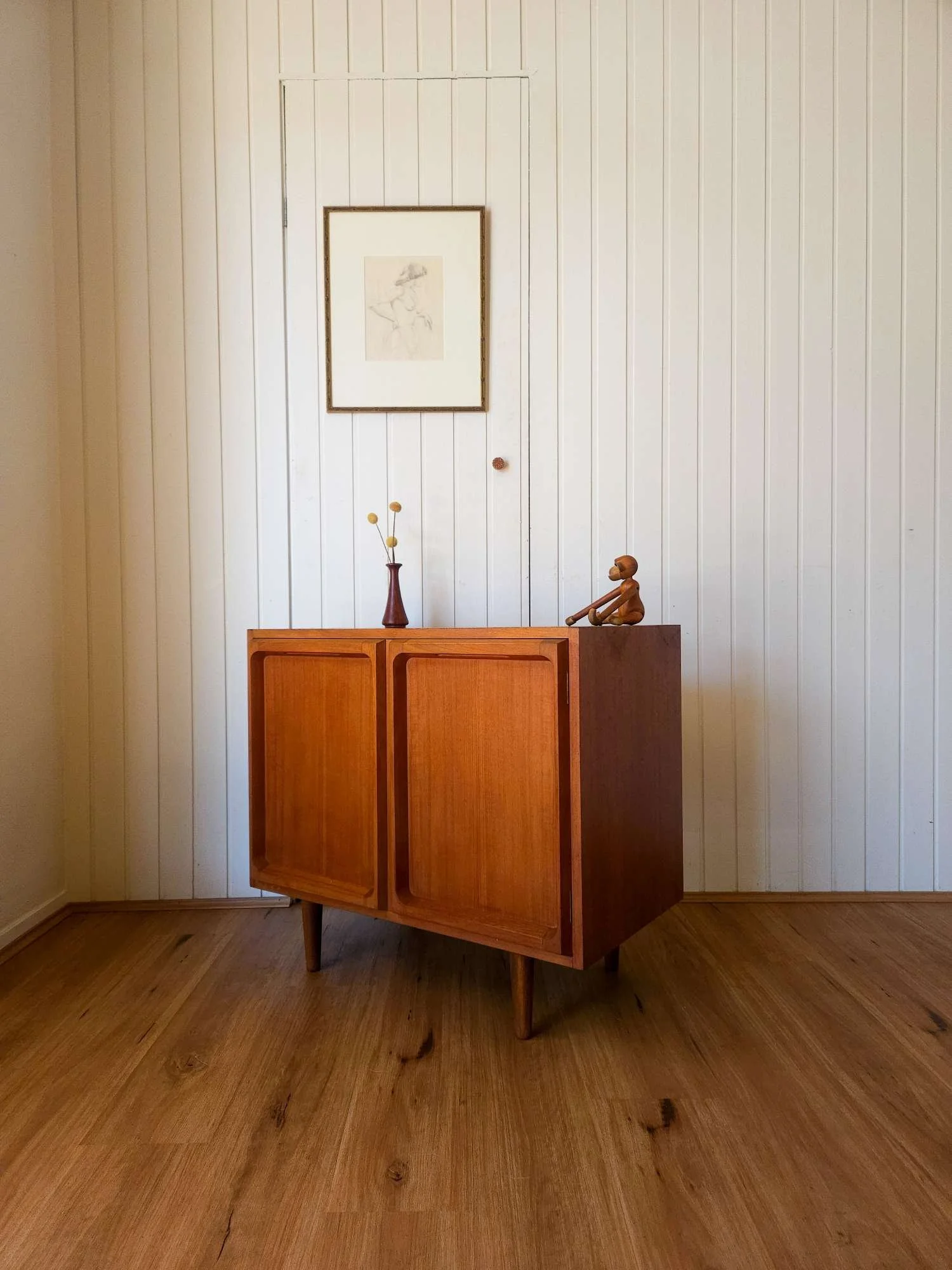 One of our most popular models, presenting in good vintage condition with minor wear as pictured. Popular proud profile door trim. Lovely aged teak colour. Adjustable shelf, fits records. Elevated on tapered timber legs.