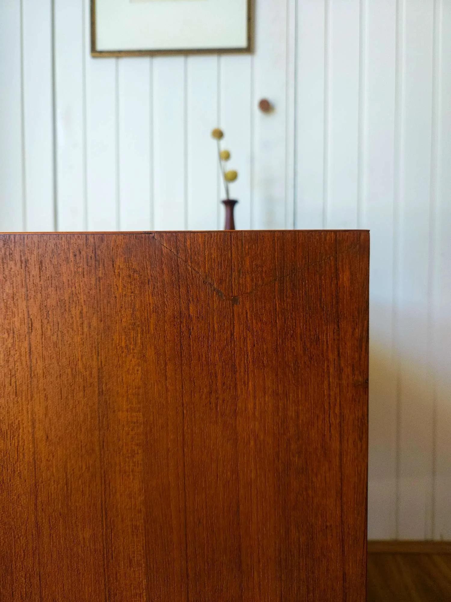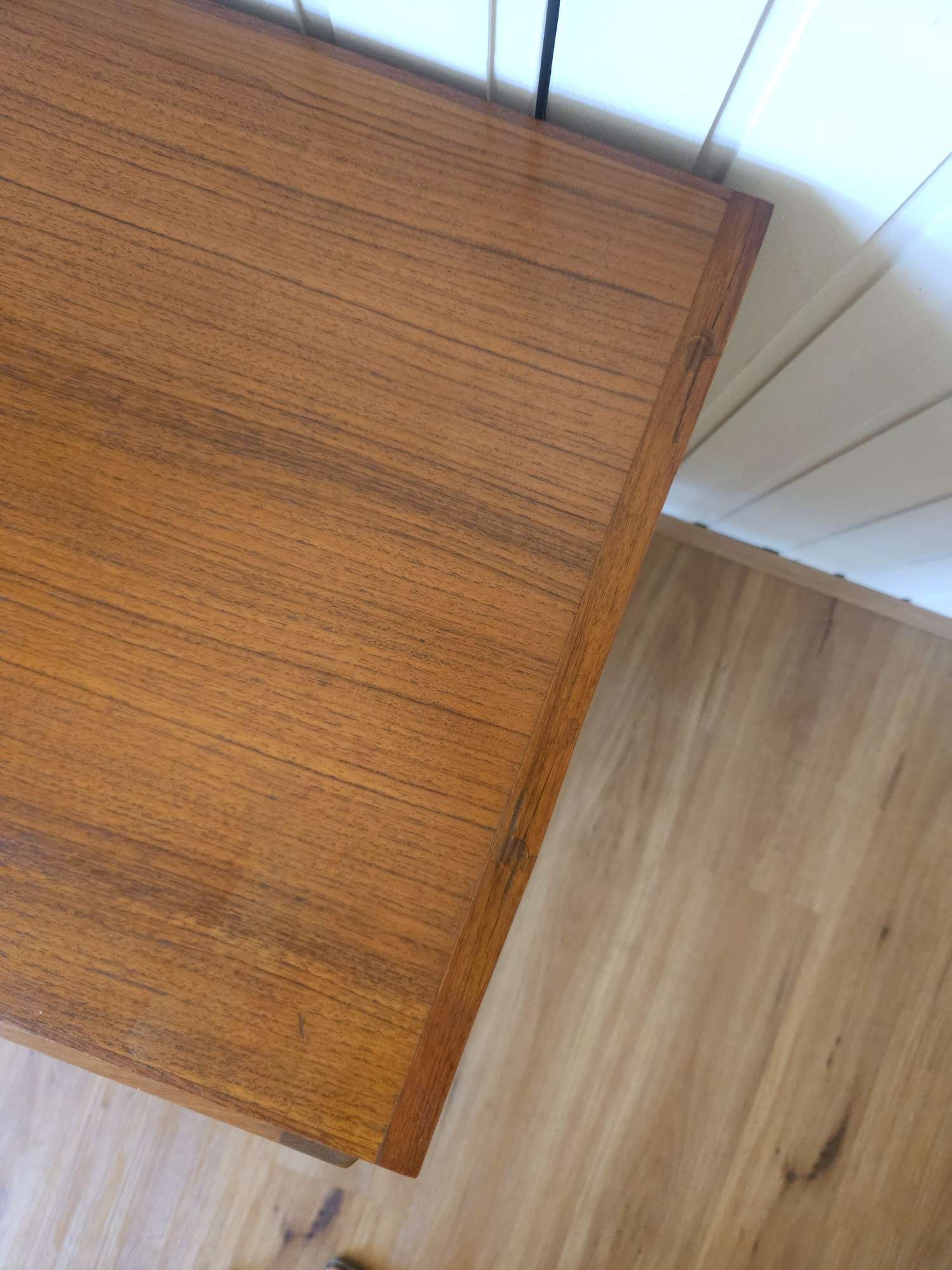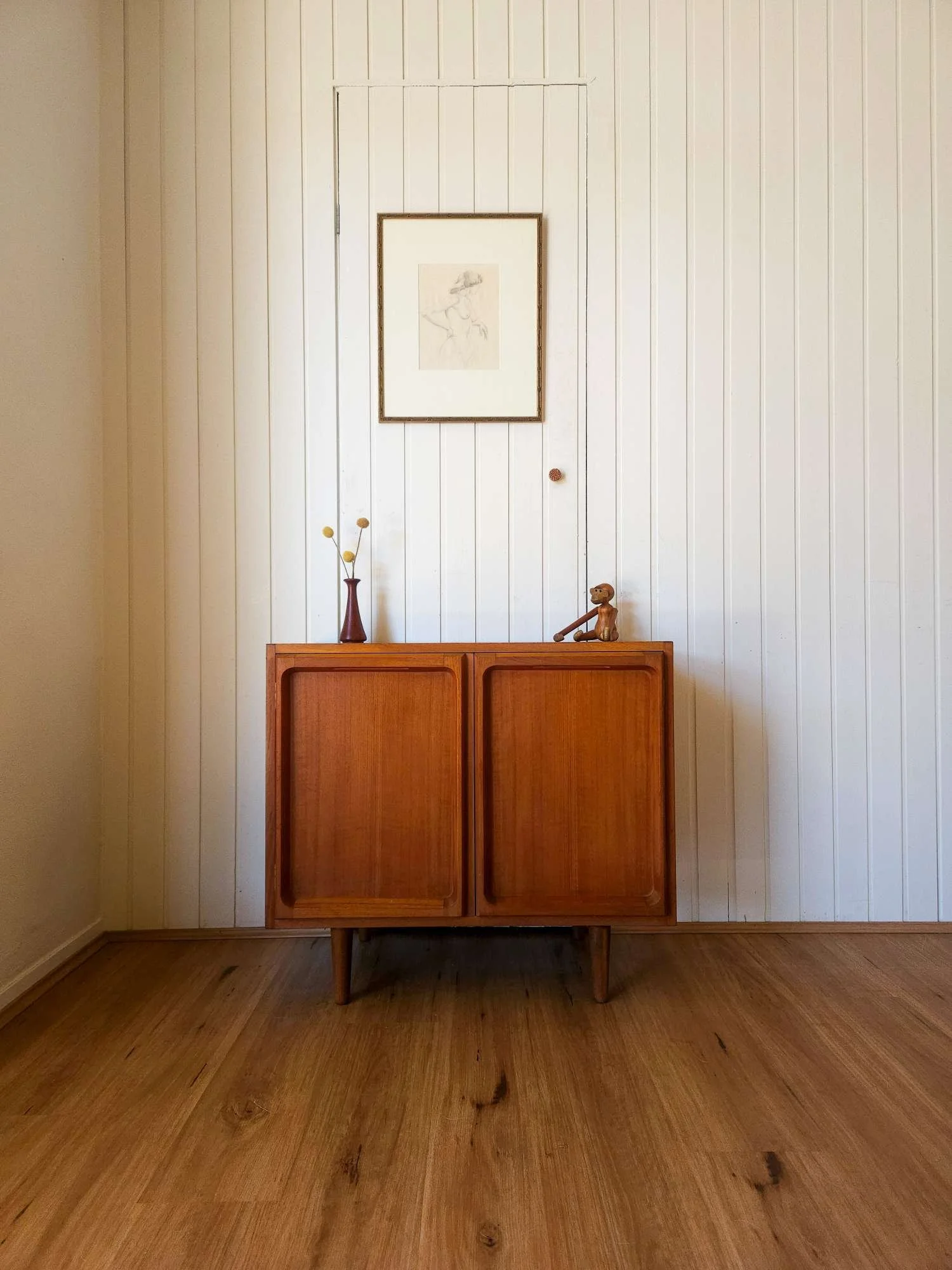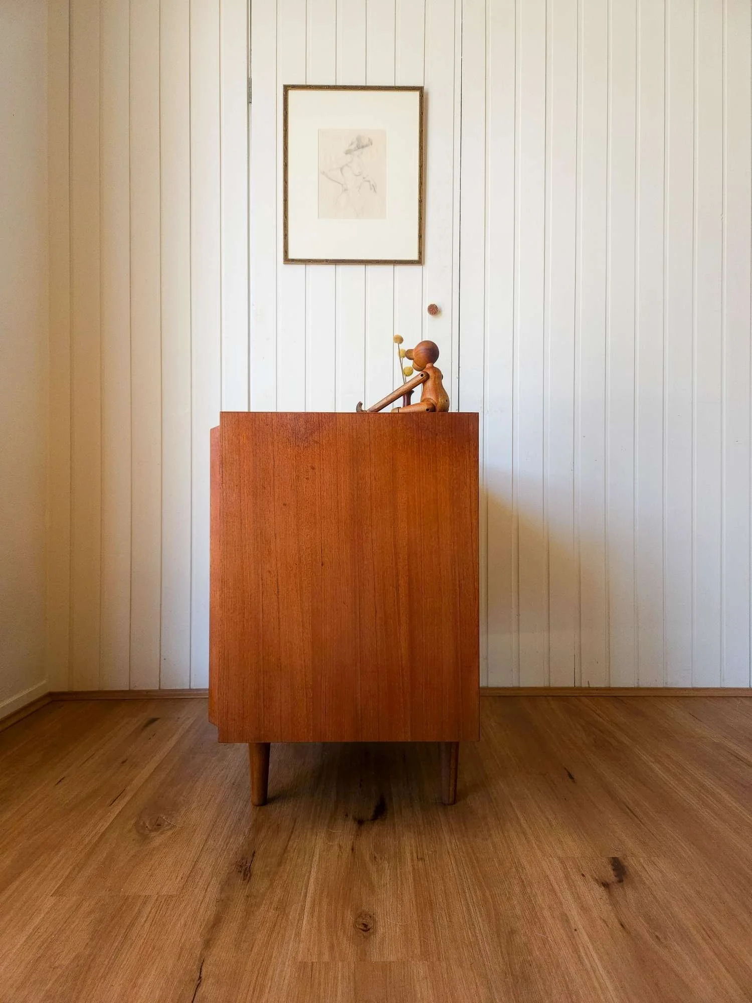 One of our most popular models, presenting in good vintage condition with minor wear as pictured. Popular proud profile door trim. Lovely aged teak colour. Adjustable shelf, fits records. Elevated on tapered timber legs.