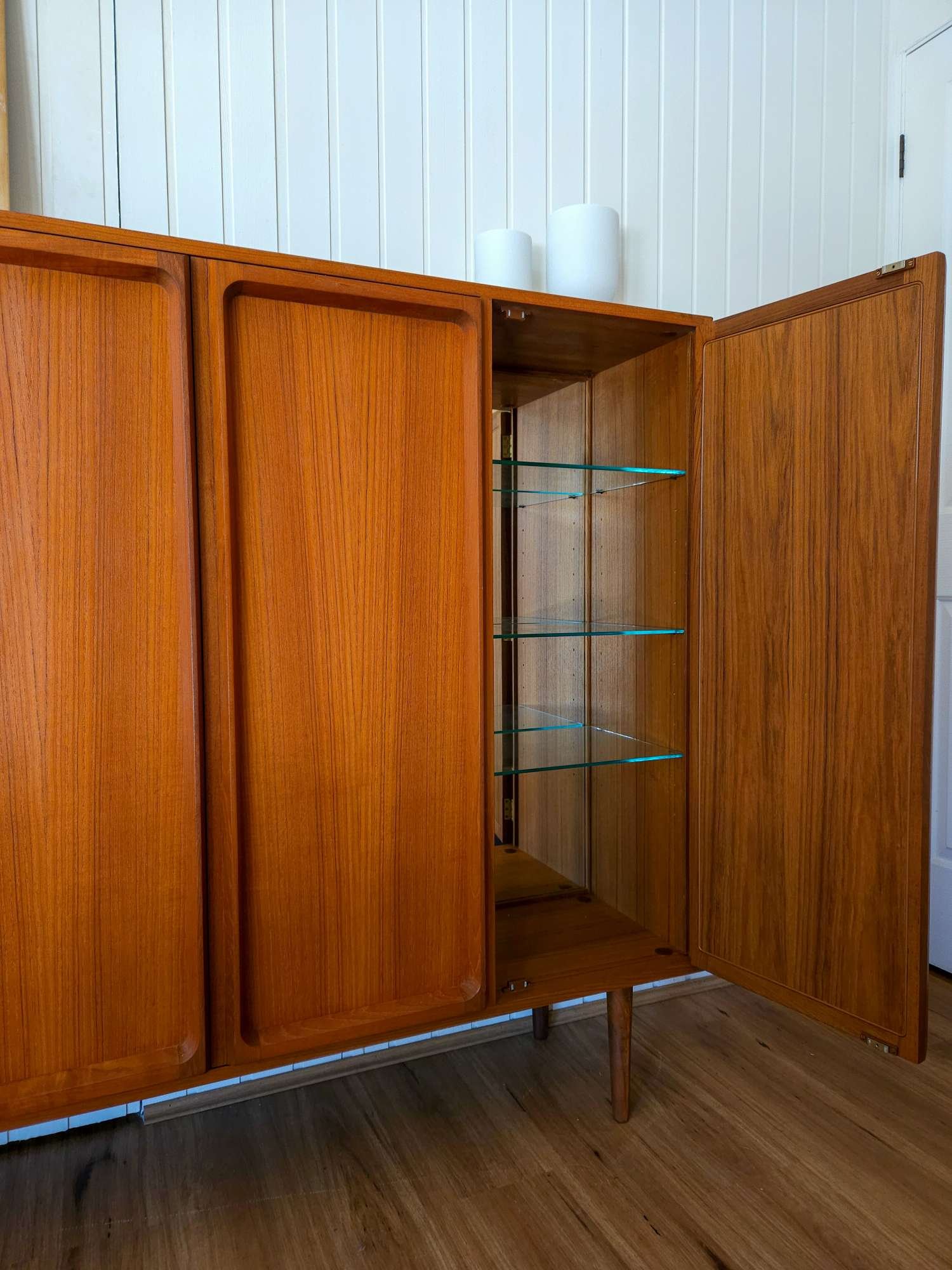 Presents in a great vintage condition with a lovely deep teak patina. Very minor imperfections all commensurate with age. Slight wear to the top. All doors open and close well.