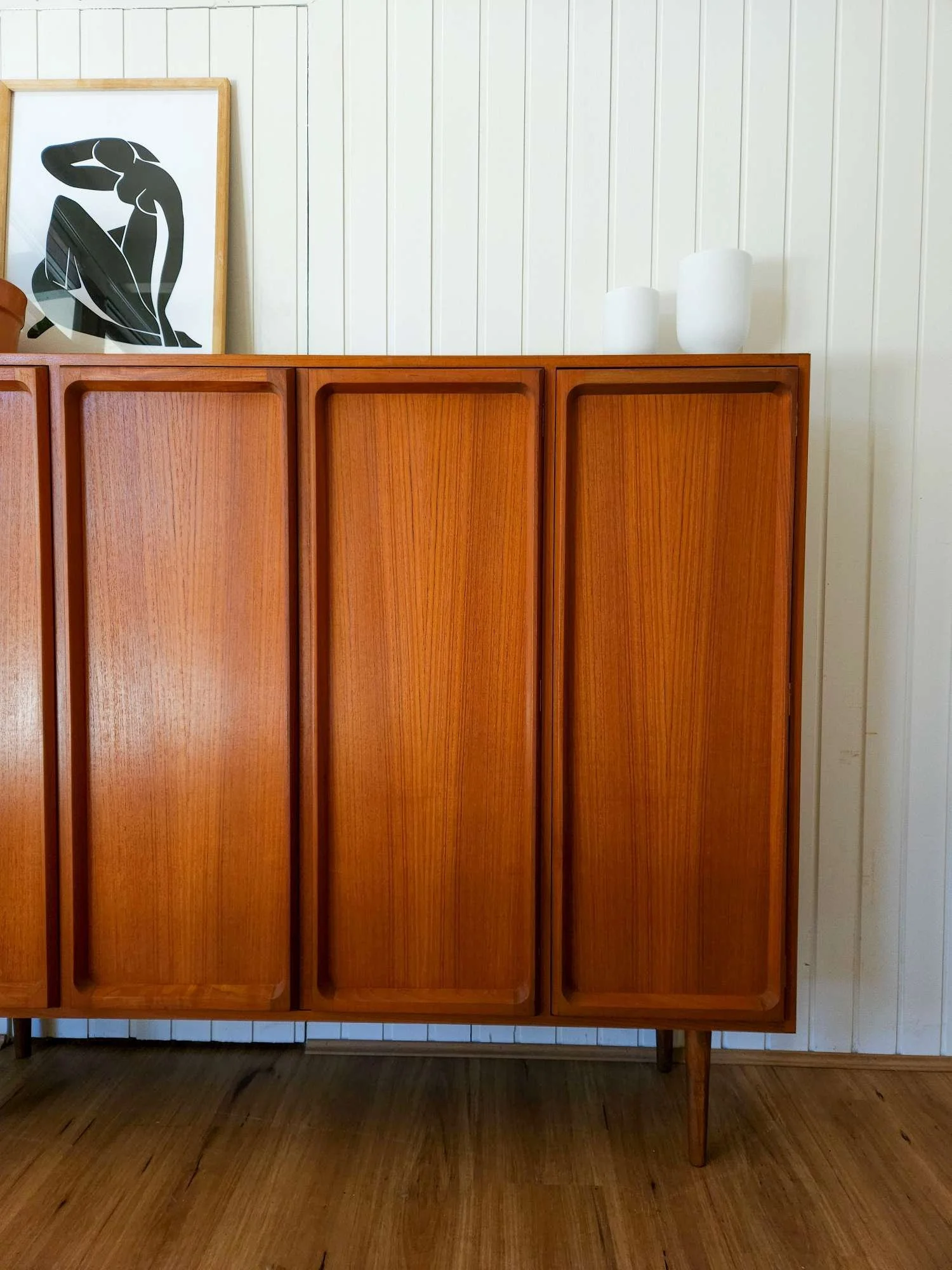 Features four doors with adjustable and removable shelves inside, tapered legs and a bold deep profile to the doors.