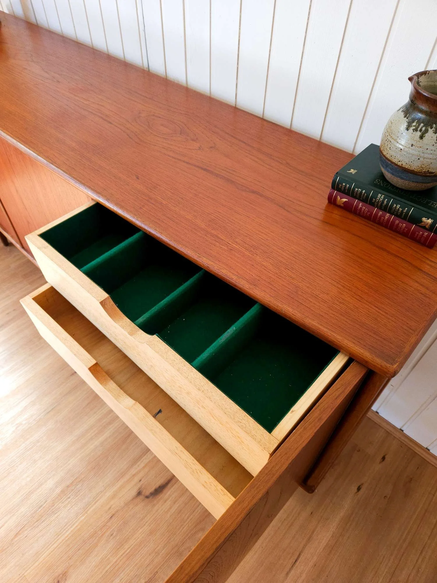 Features rounded timber handle pulls, curved edges and warm teak patina. Combination of internal drawers and adjustable shelves.