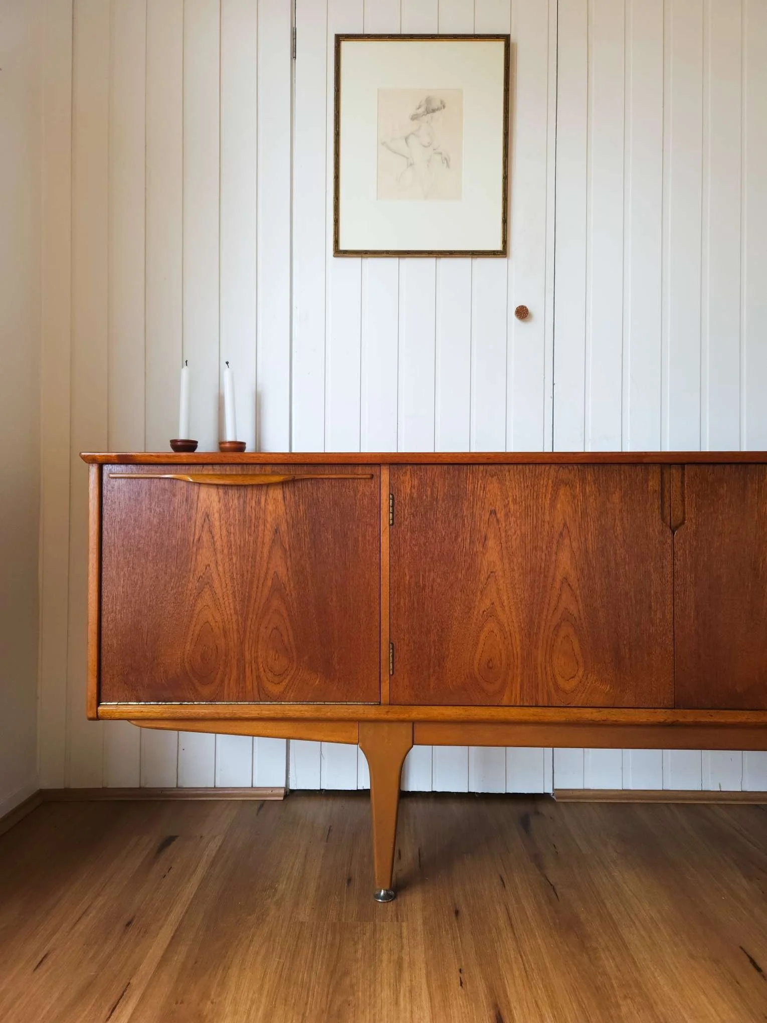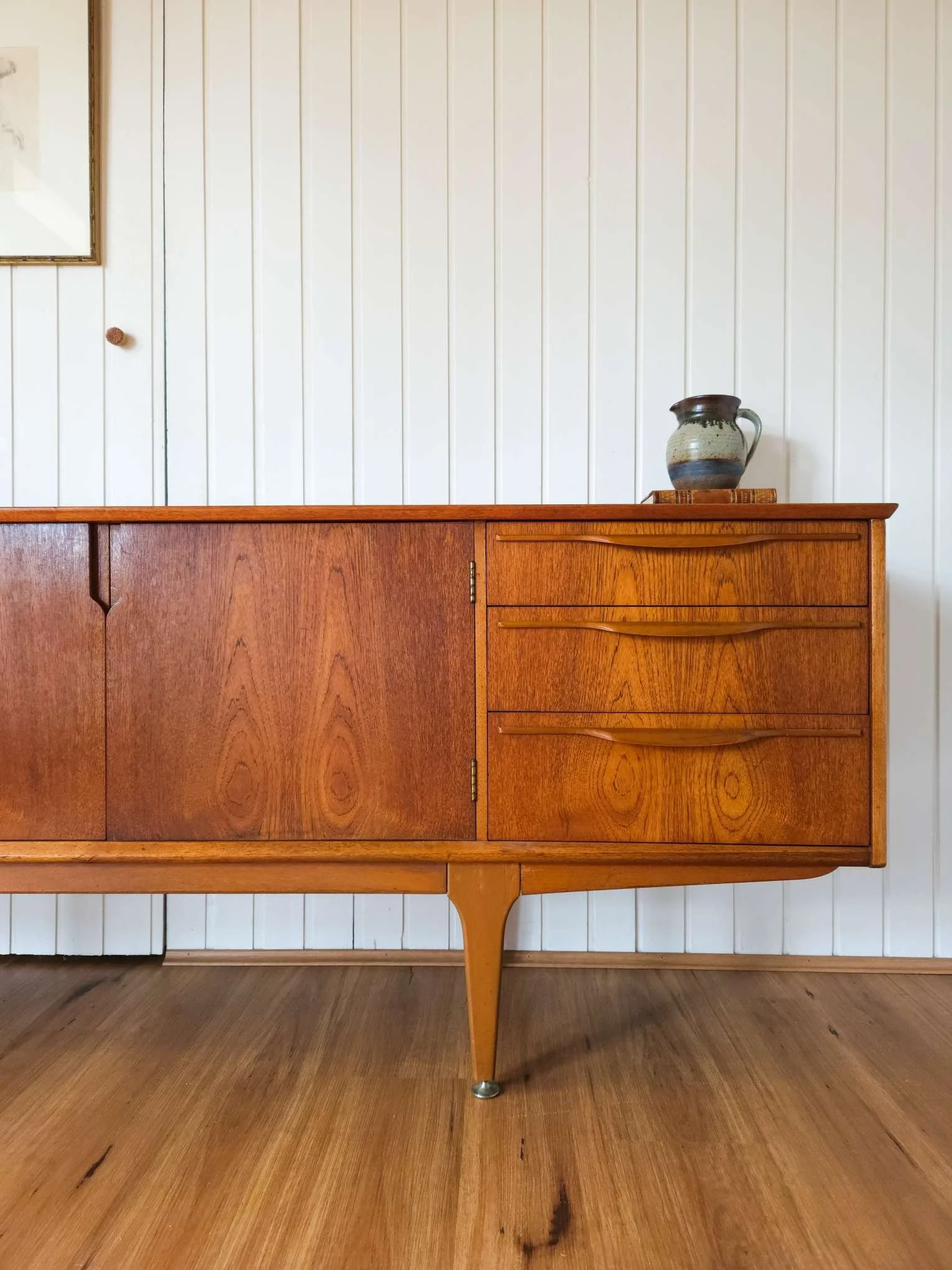 Features lots of storage with a combination of drawers and doors. Brass hardware, scalloped handles and tapered timber legs.