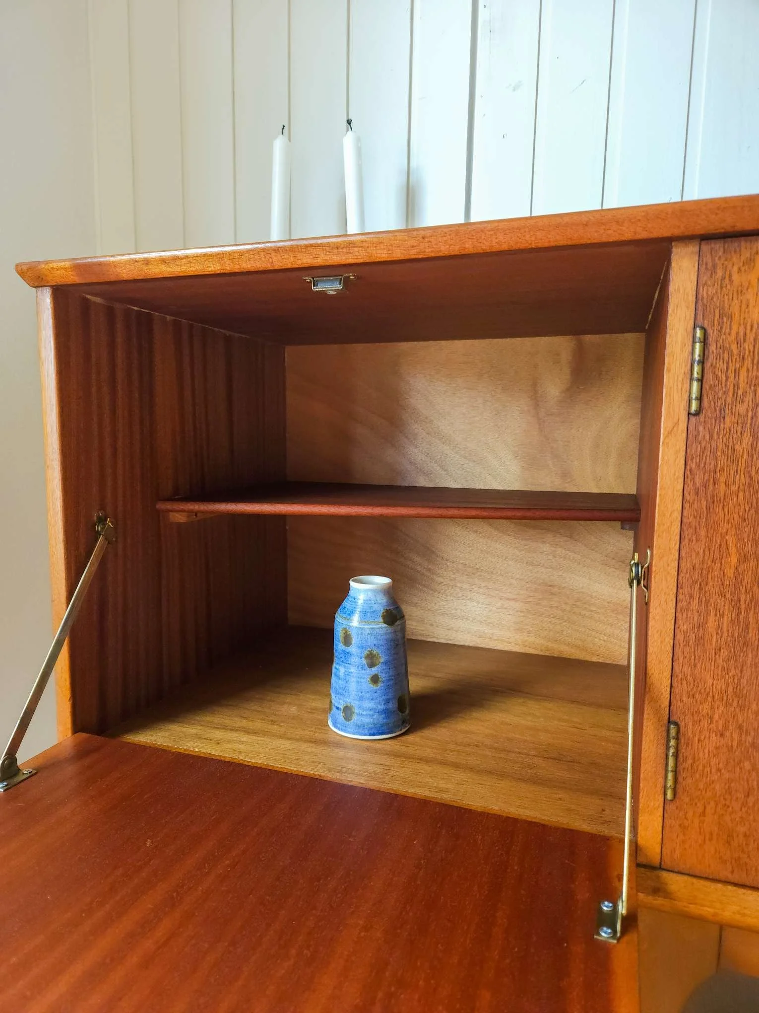 Presents in a good vintage condition with minor wear according to age. Small parts of white paint residue in the timber grain to the top. The piece could have been painted white to the top and restored at some point in time. Only noticeable when inspected closely. All drawers and doors operate smoohtly and the piece is solid and stable.