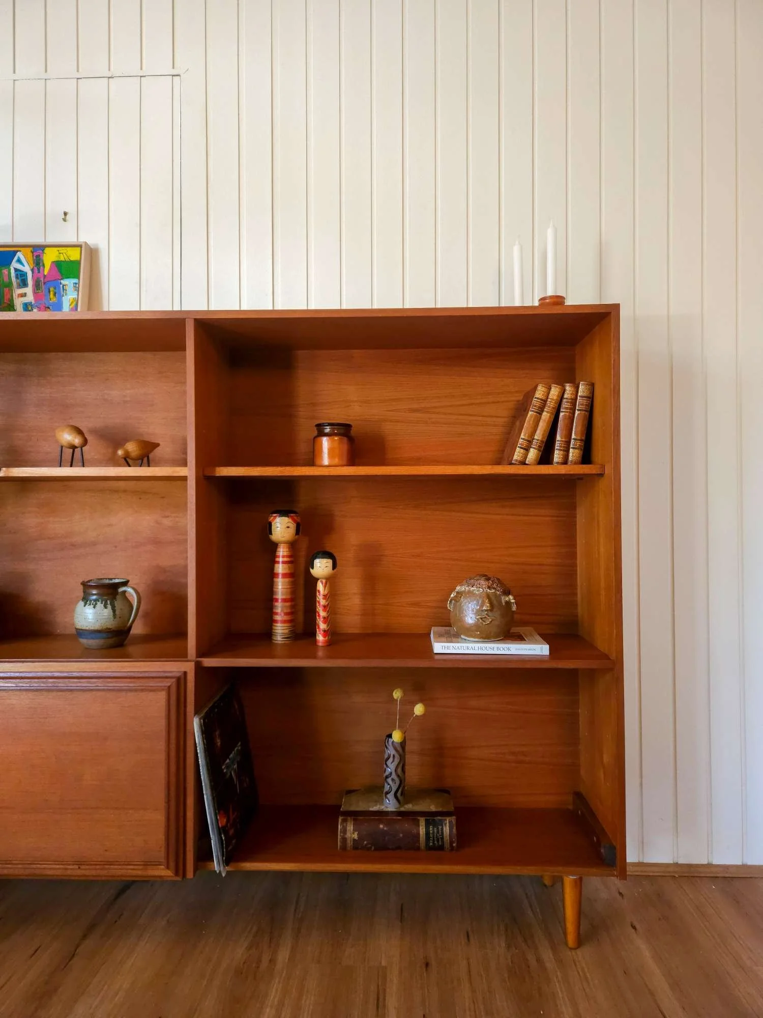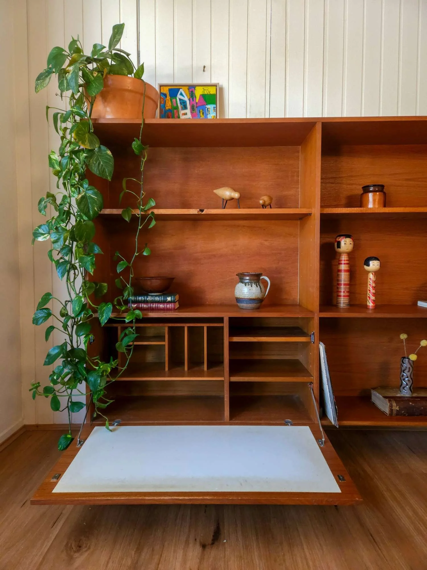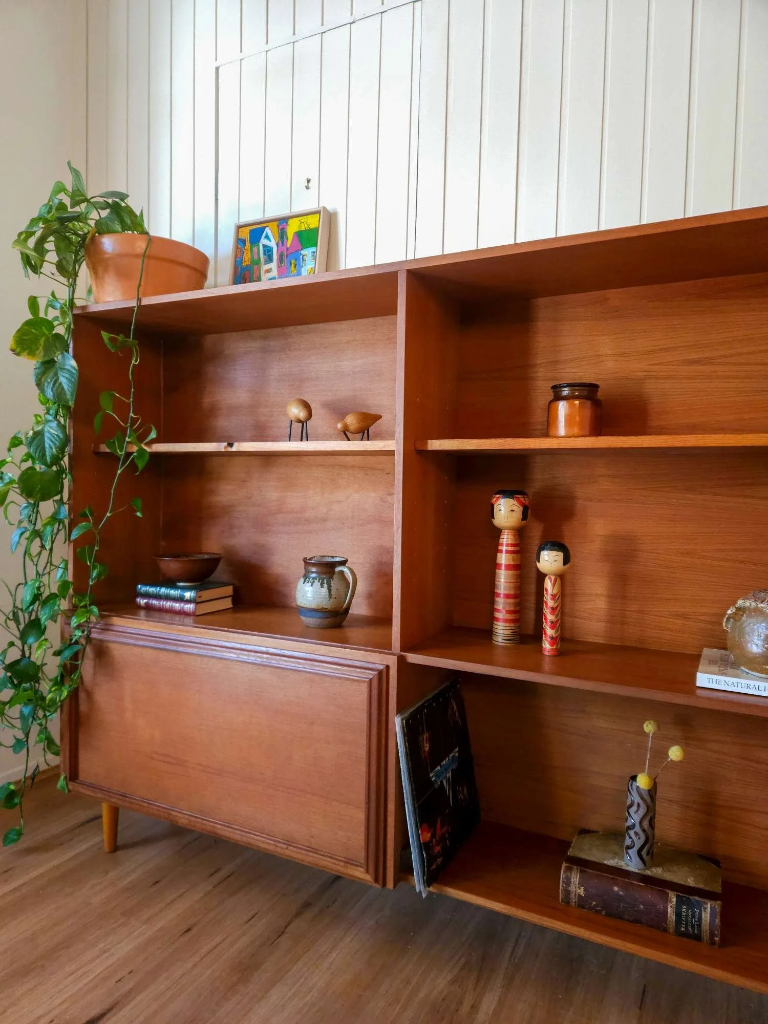Fabulous bookshelf with lovely aged teak tones. Suitable for records. Comes with mid century tapered legs and two adjustable shelves.