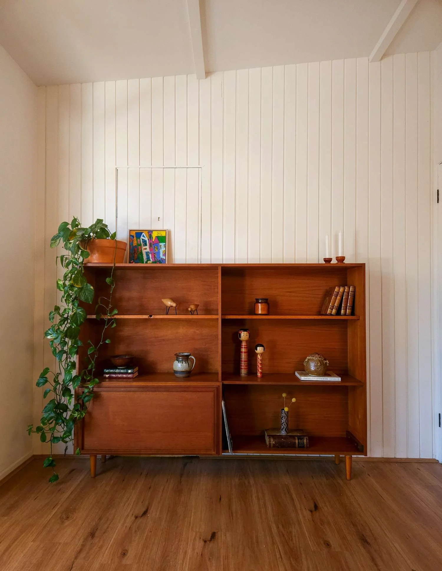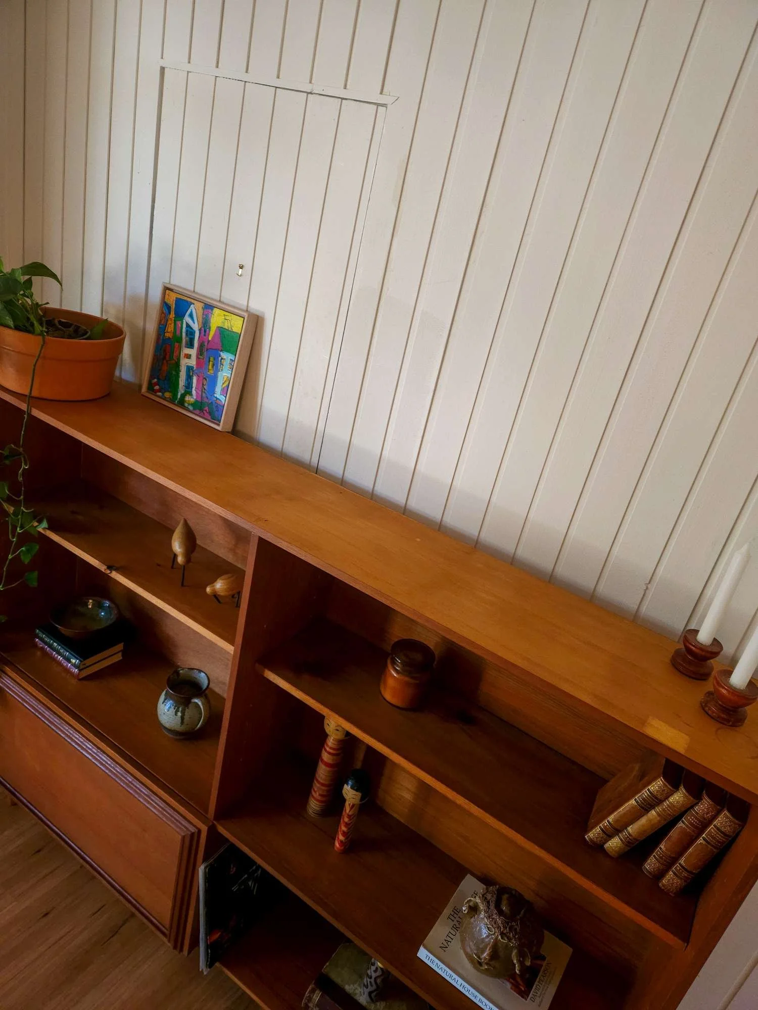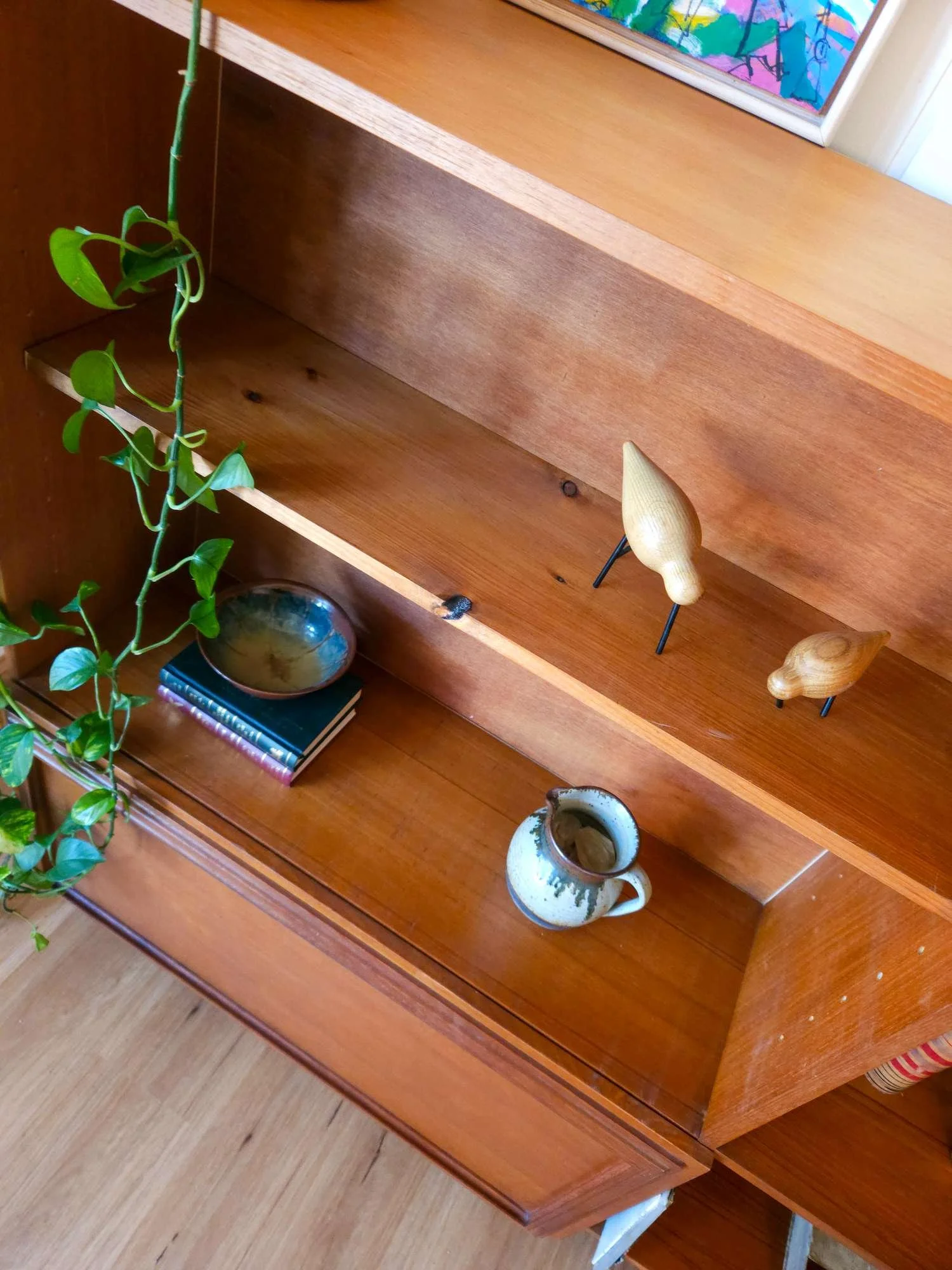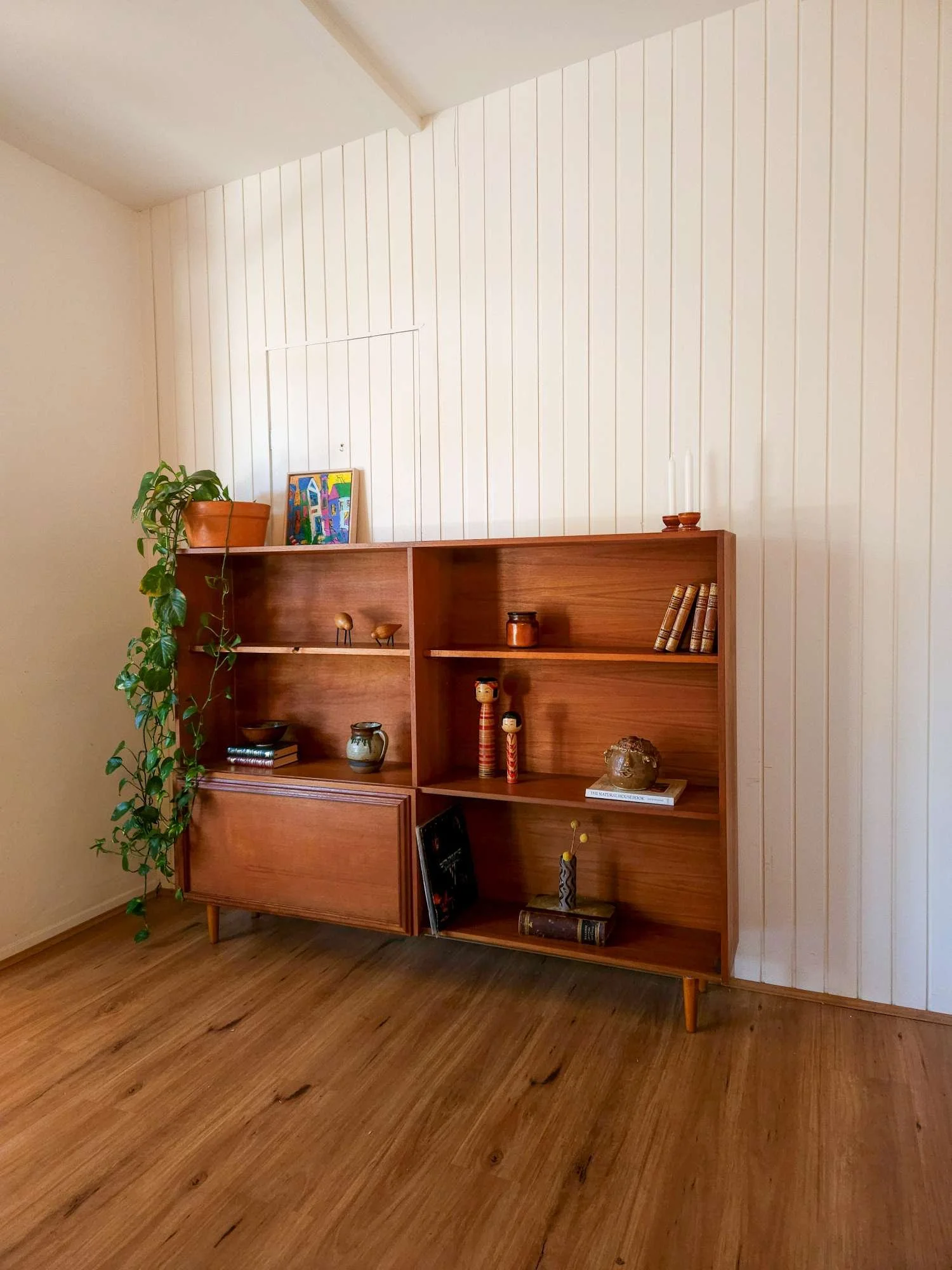 Fabulous bookshelf with lovely aged teak tones. Suitable for records. Comes with mid century tapered legs and two adjustable shelves.