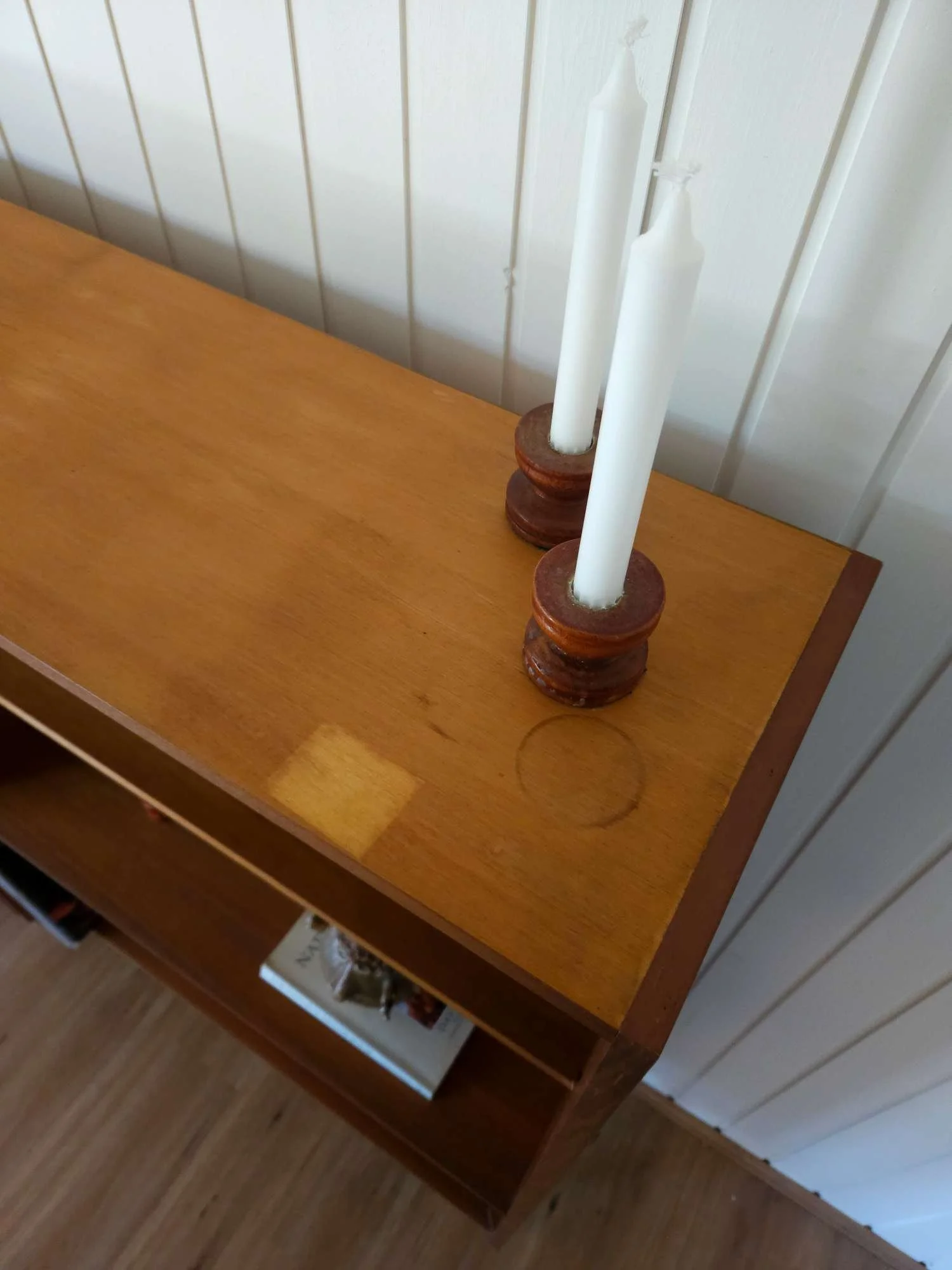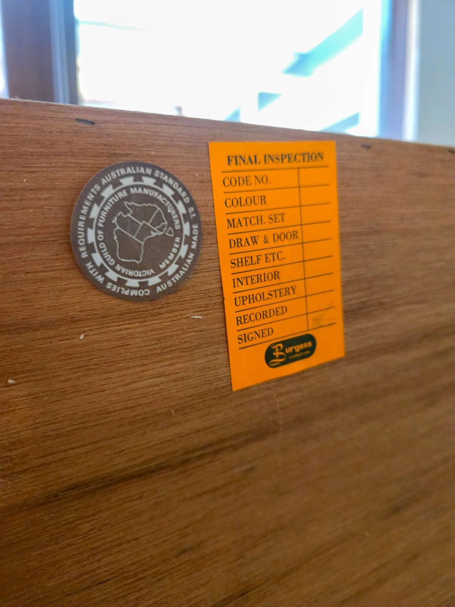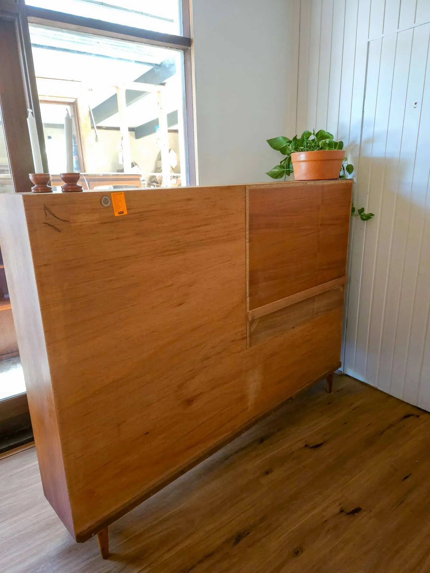This piece has been built and reinforced using recycled materials from mid century pieces. Presents in a good vintage condition with wear as pictured including stains to the top. Has been elevated on tapered timber legs. Presents beautifully and is solid and steady.