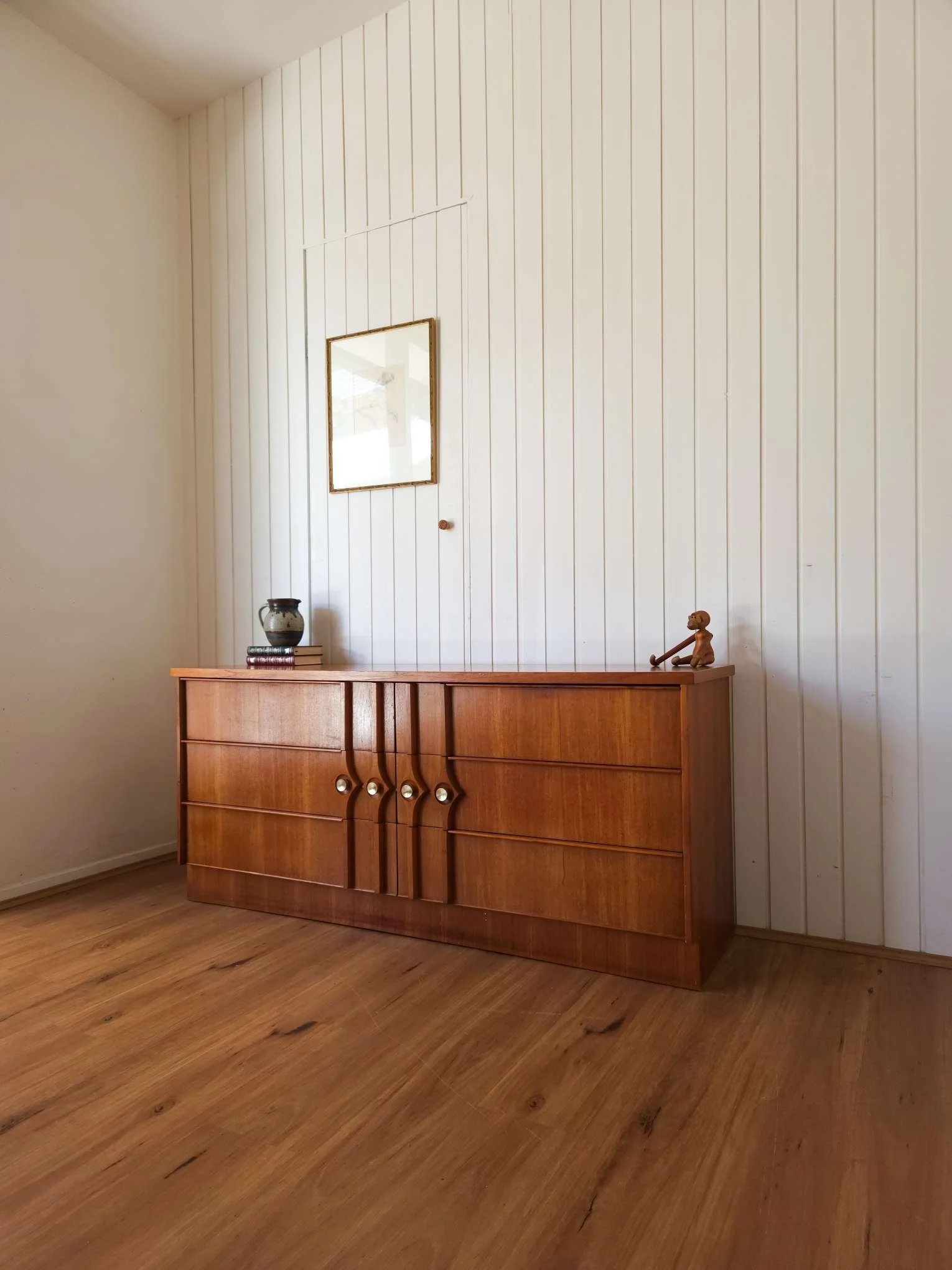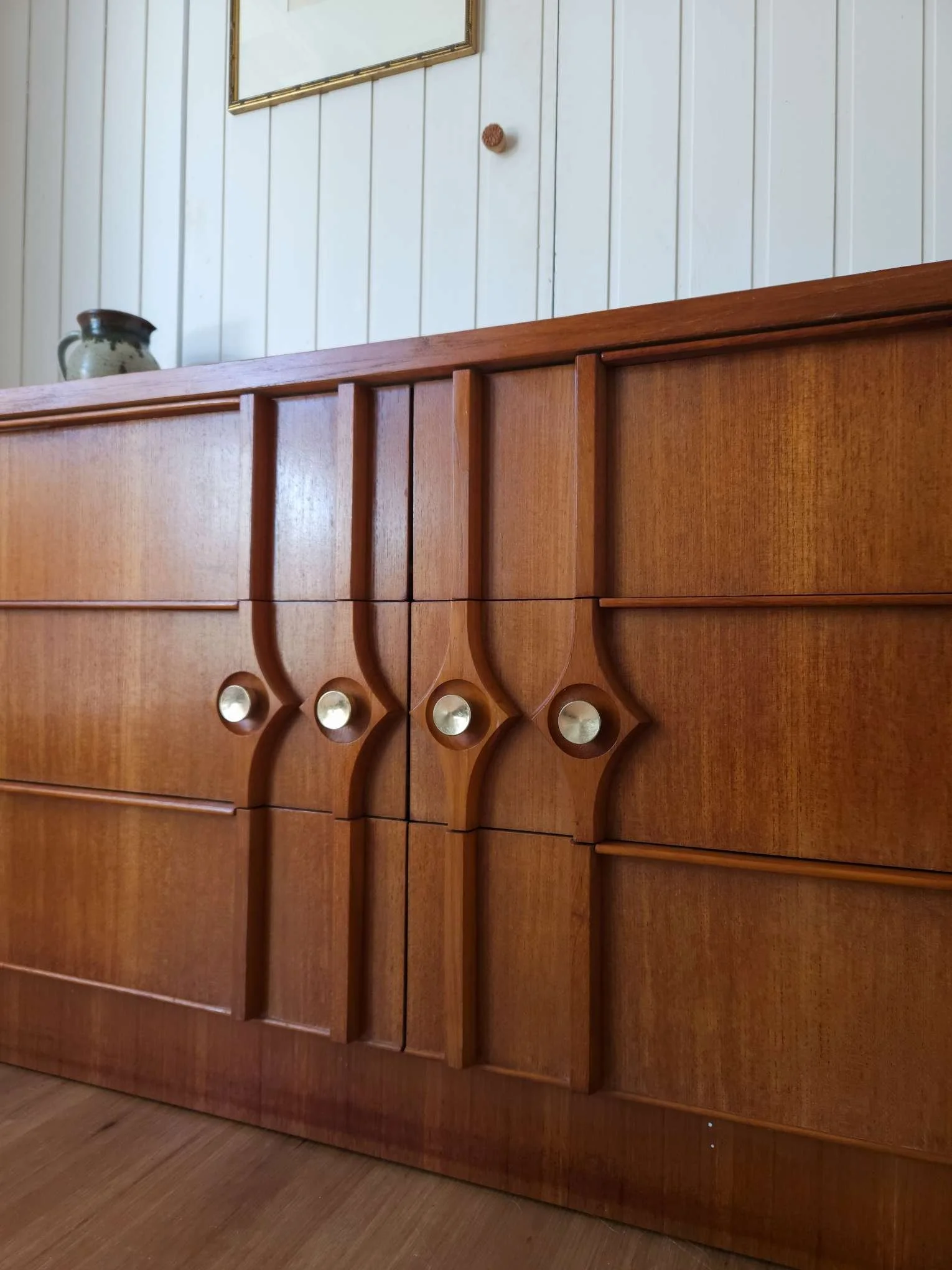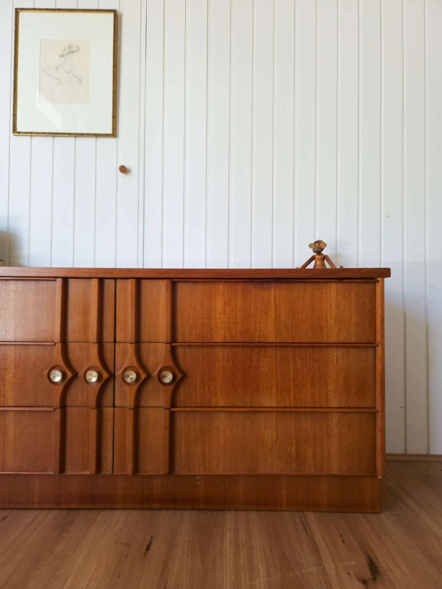 Gorgeous carved teak drawer front with art deco detail. 6 spacious drawers, dovetail joins on the drawers and warm teak tones that will bring character to any home.