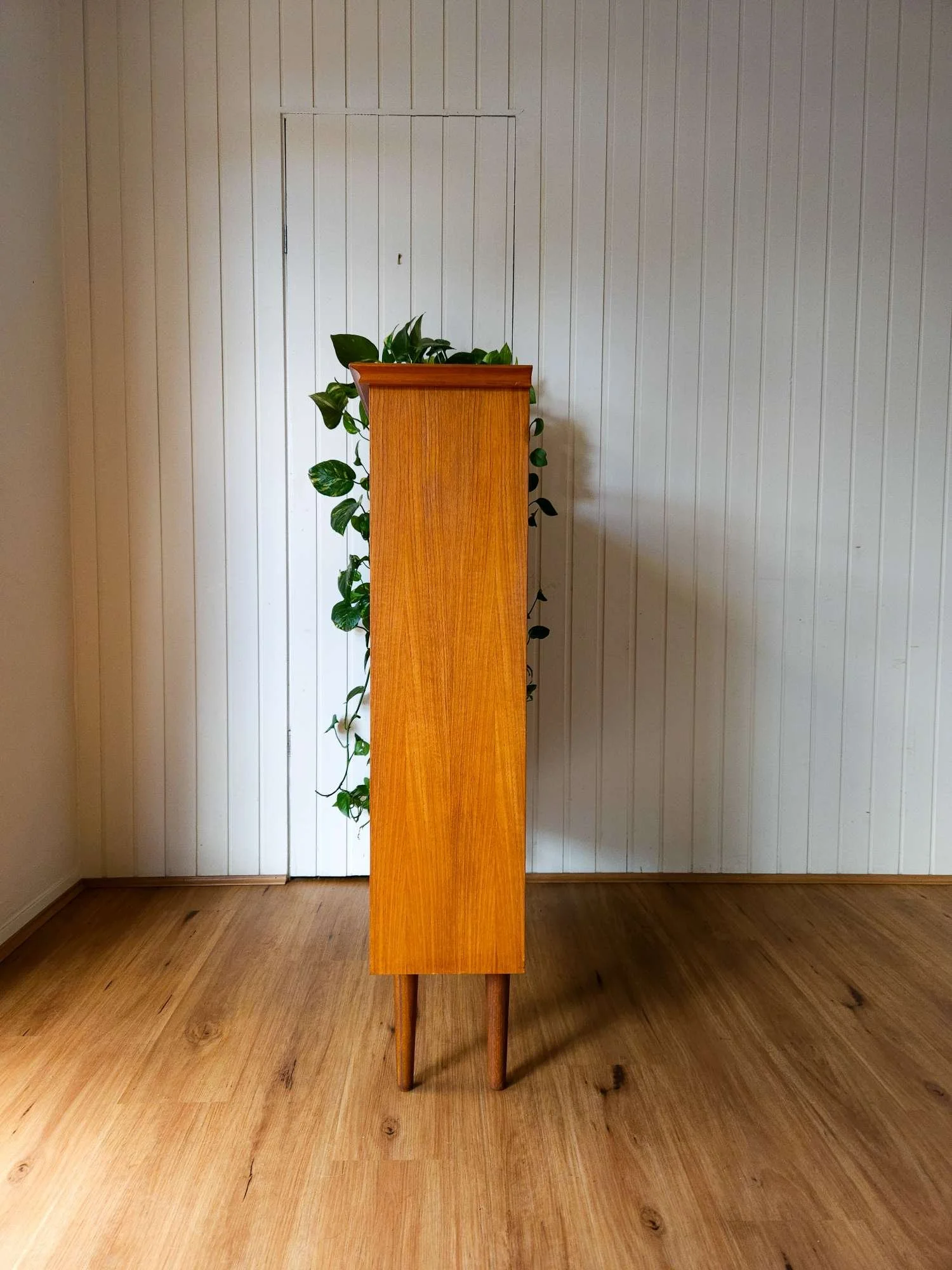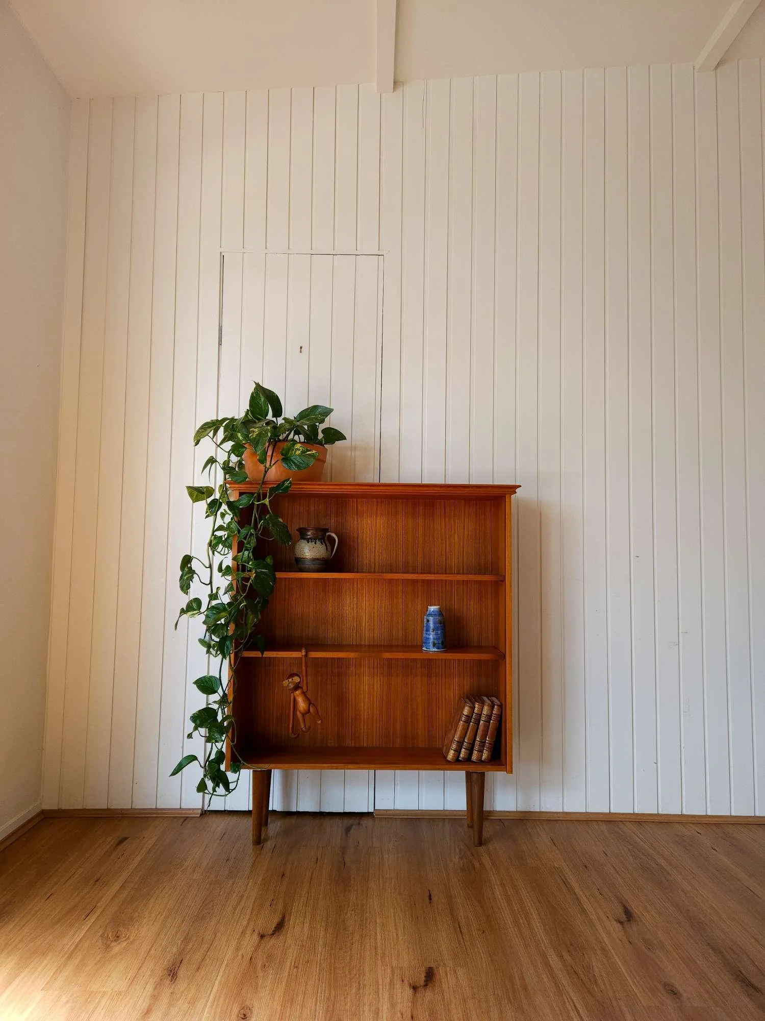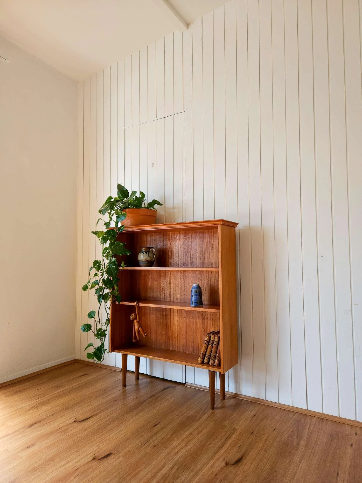 Mid century vintage bookshelf in teak.Has been elevated on tapered timber legs.