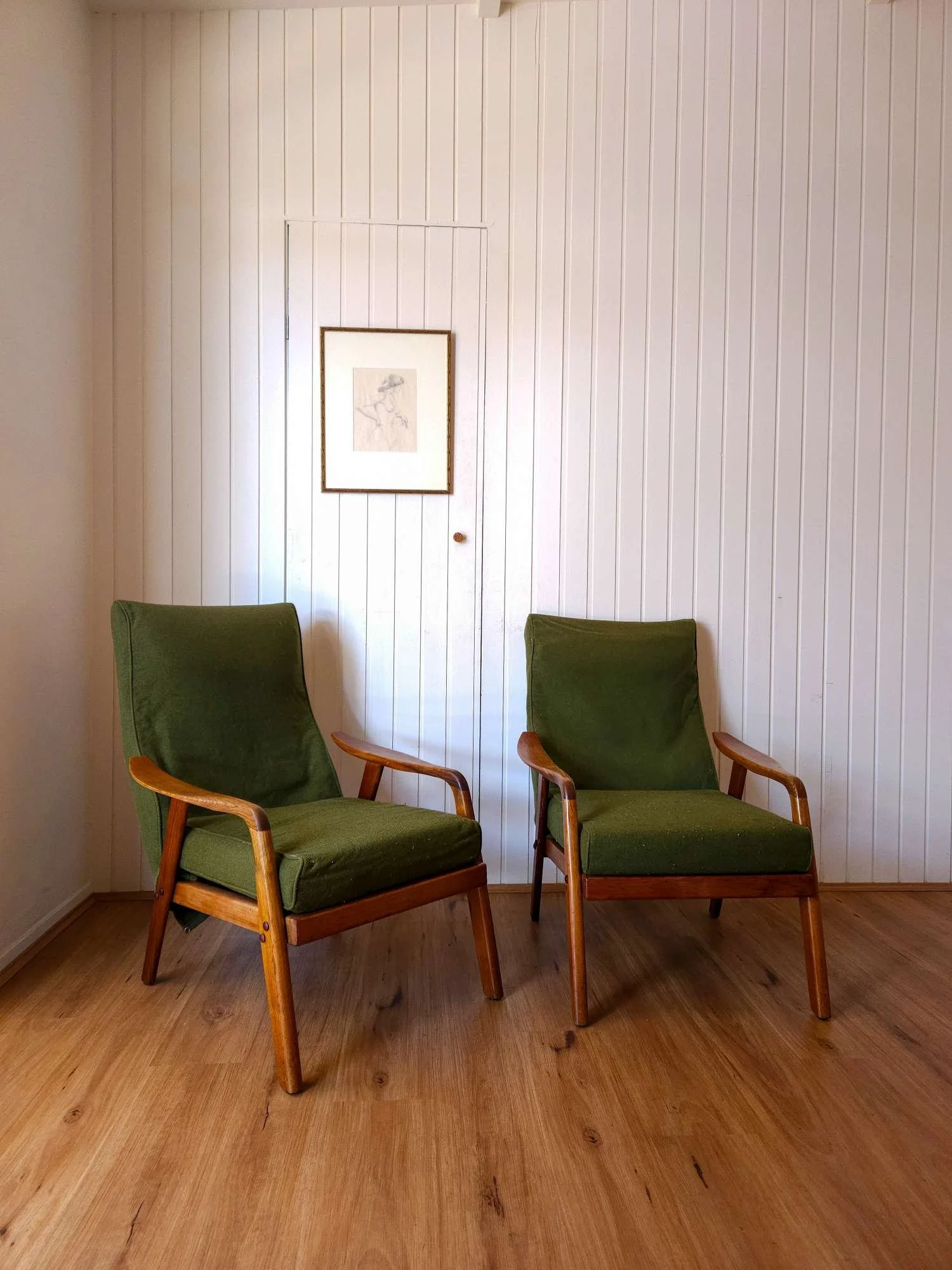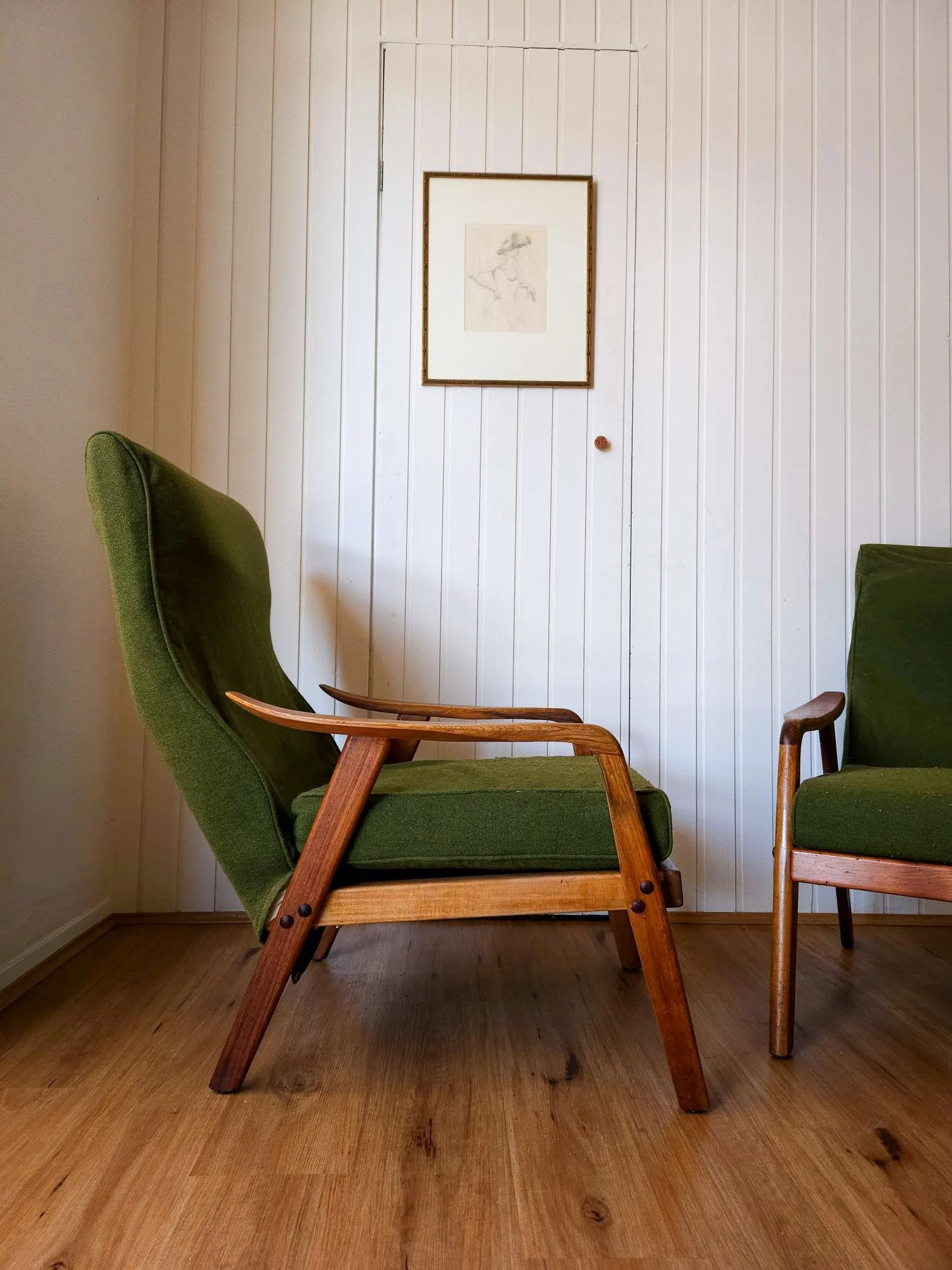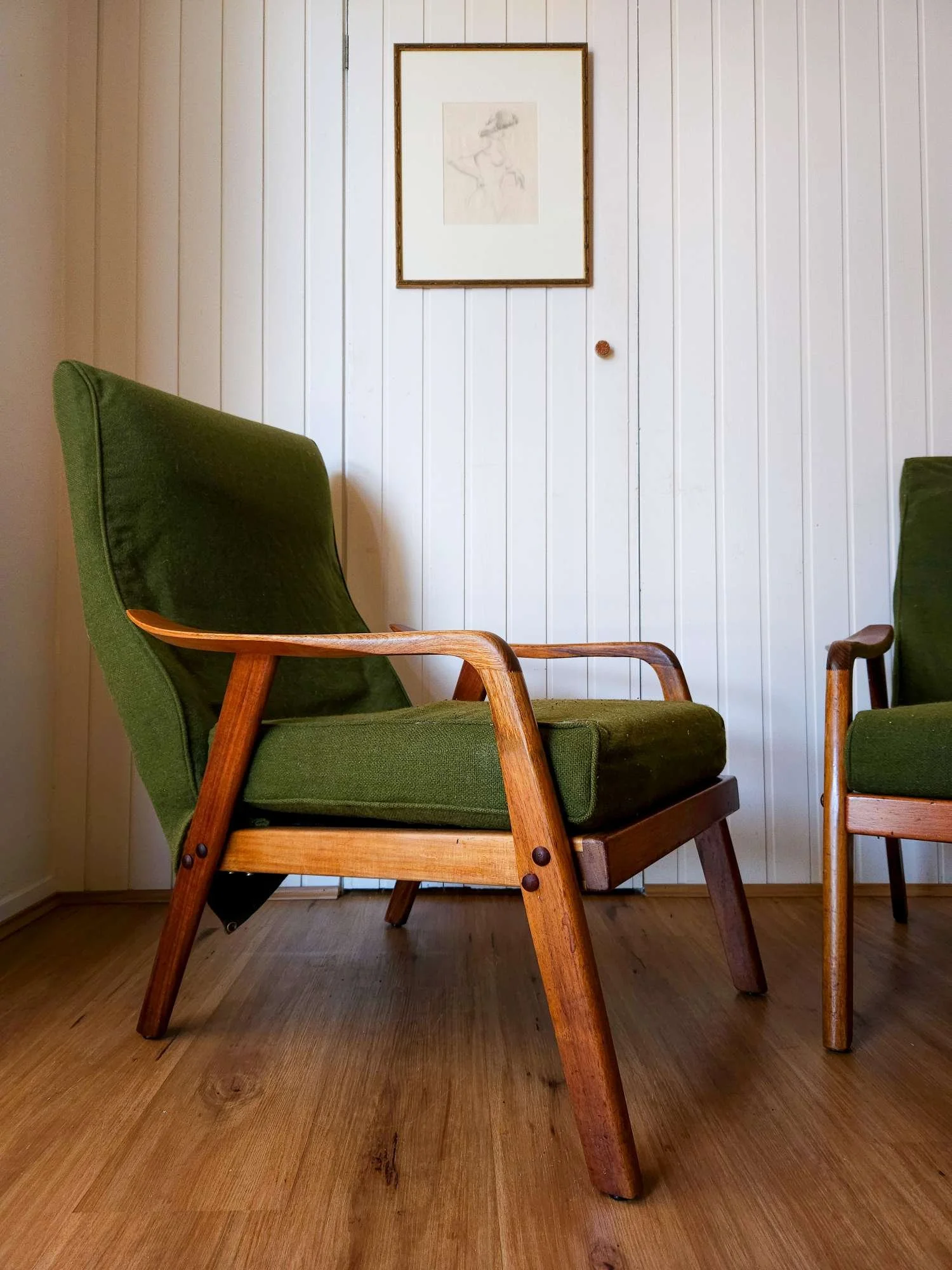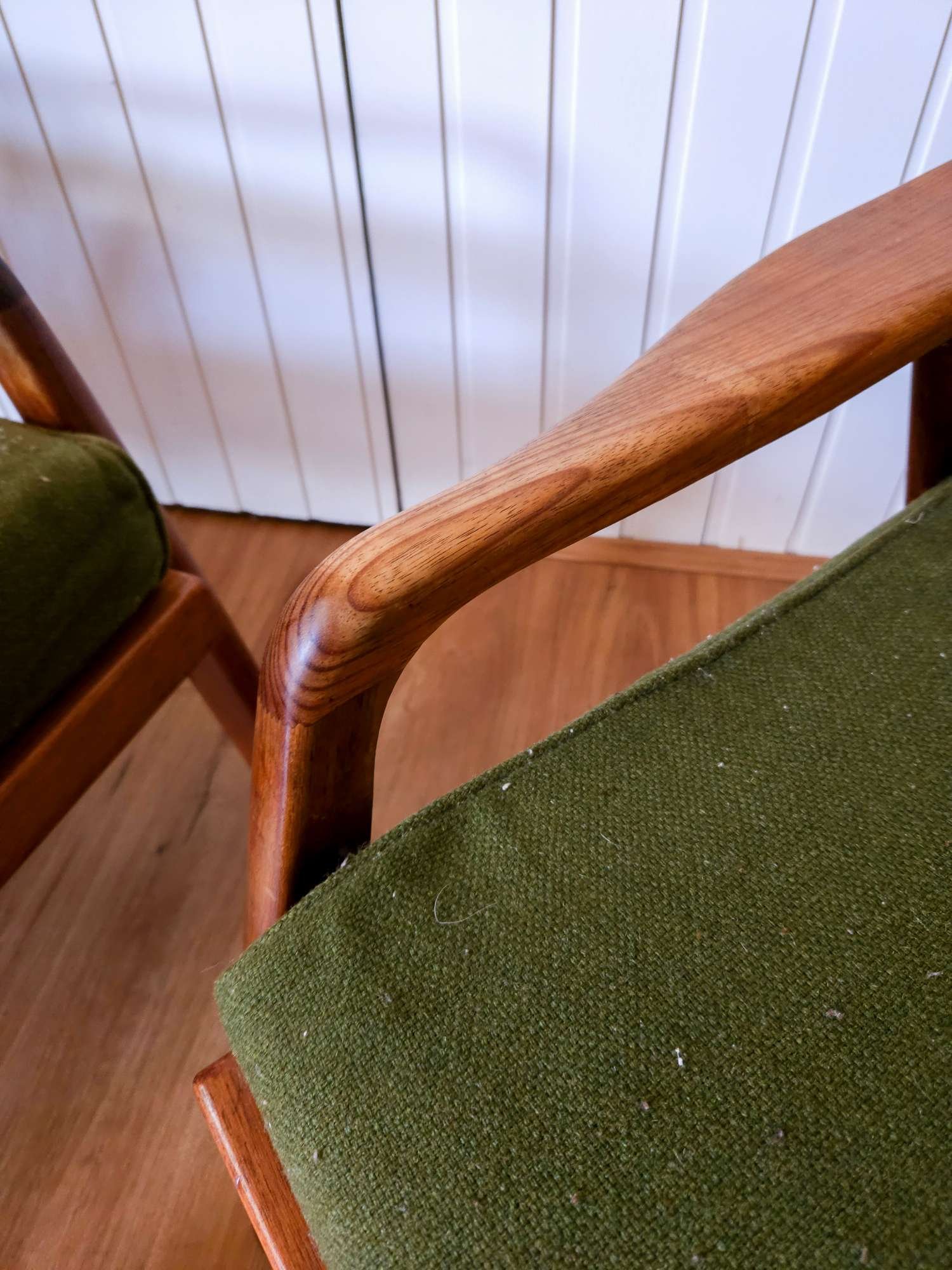 Pair of mid century vintage armchairs with original green wool upholstery.