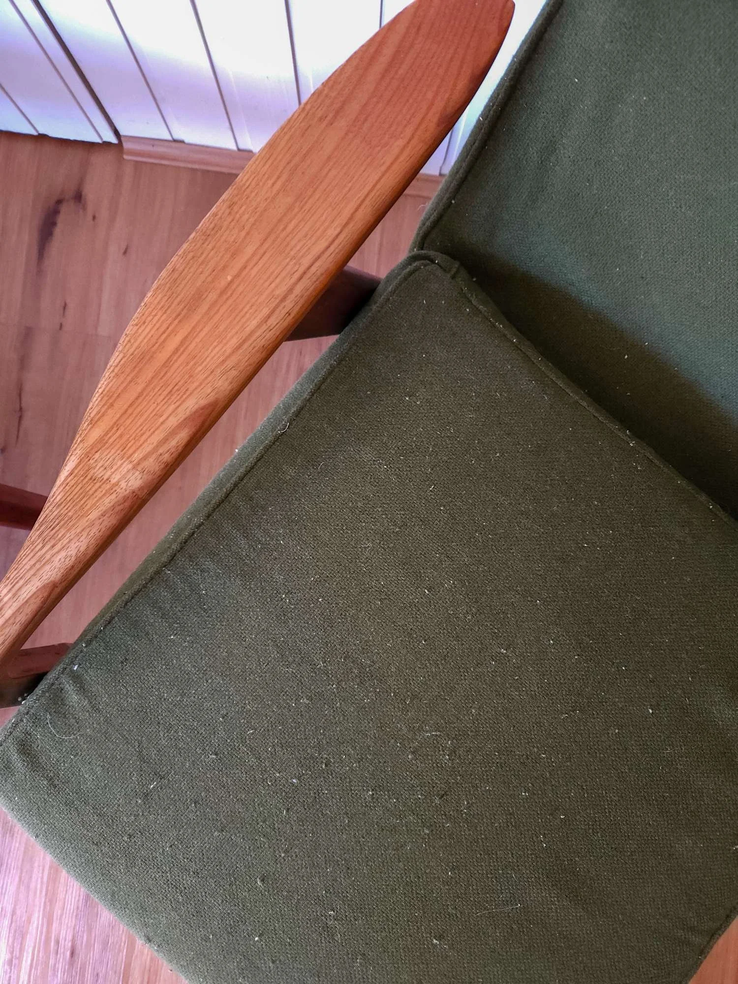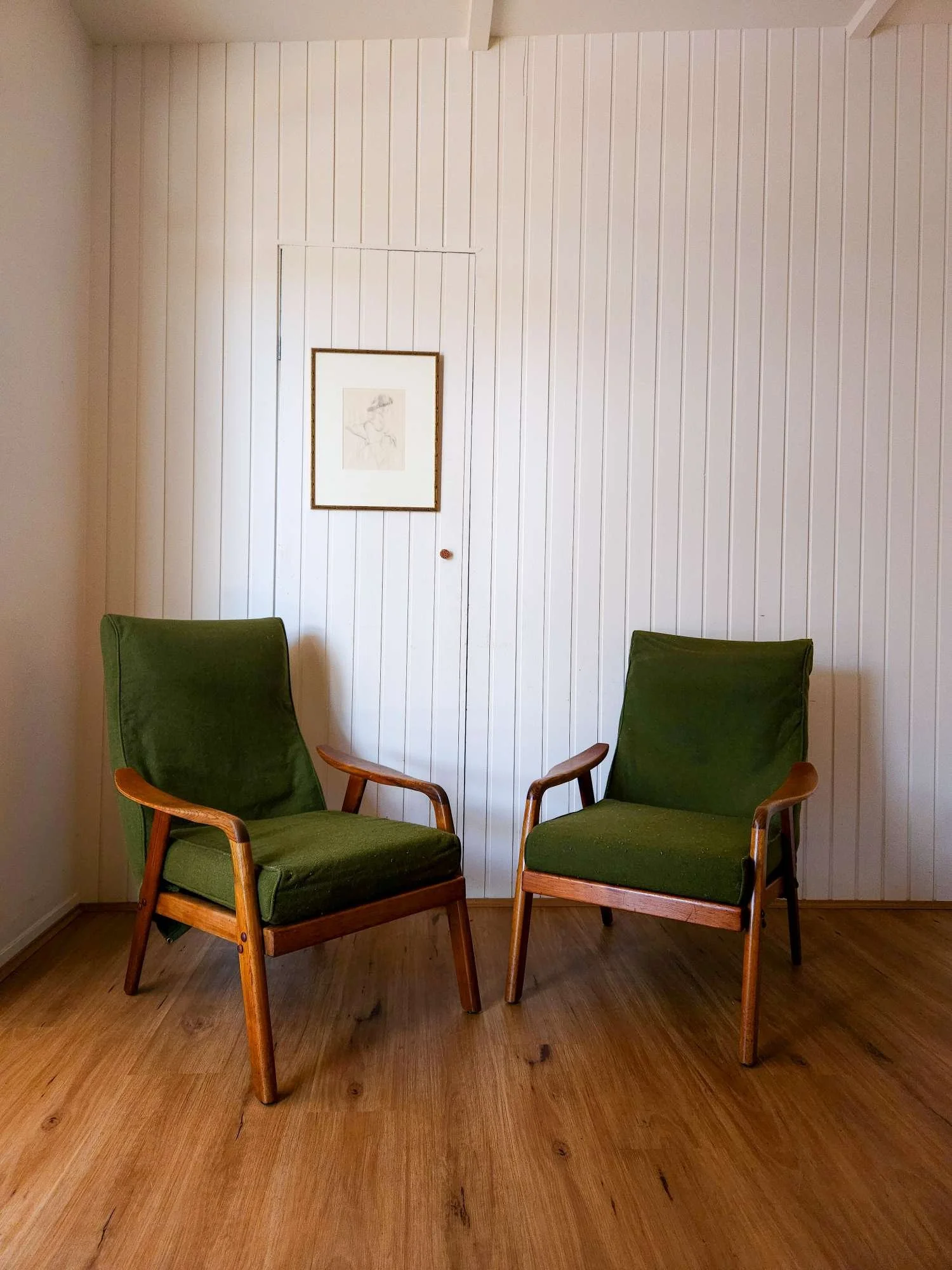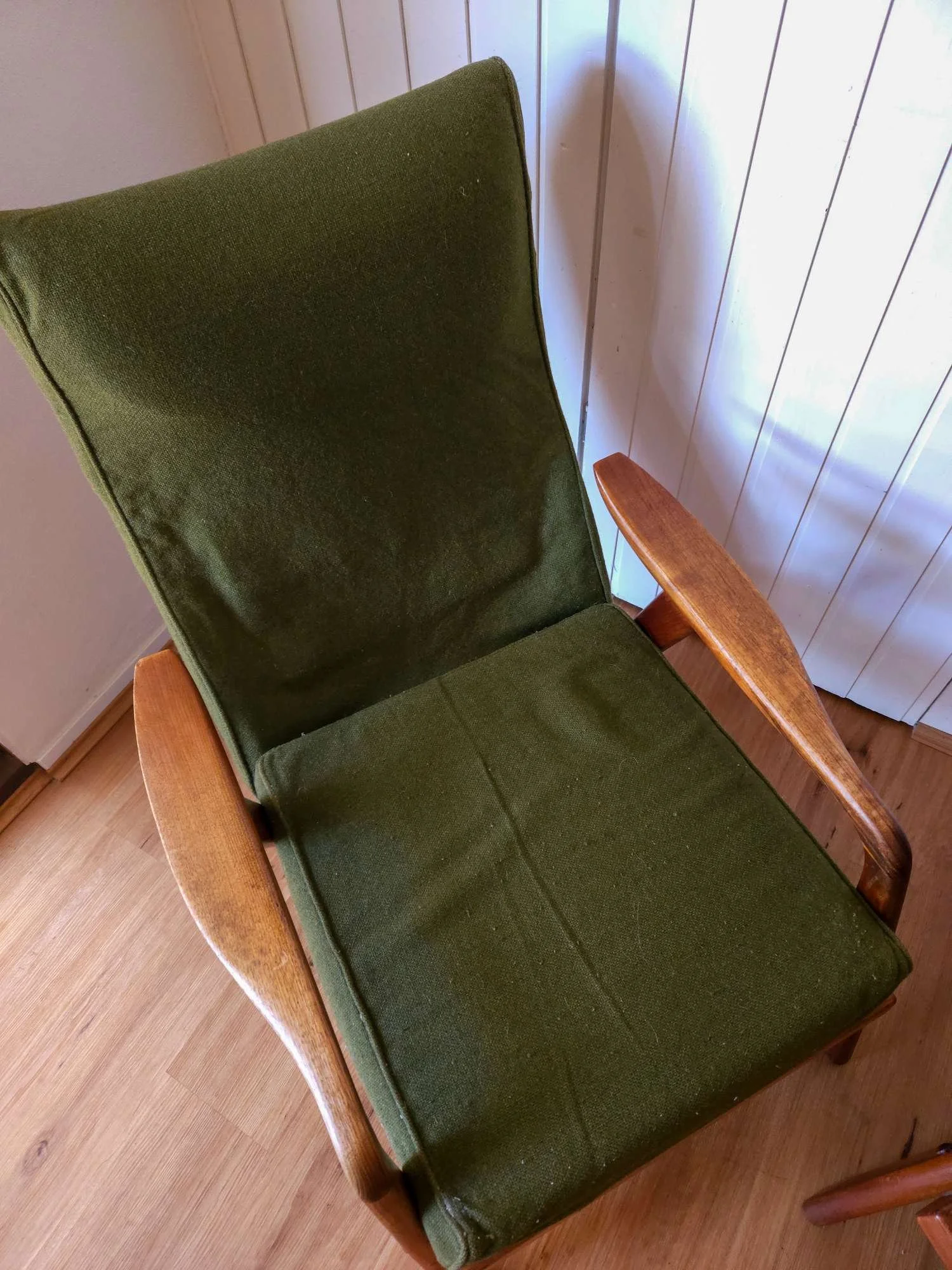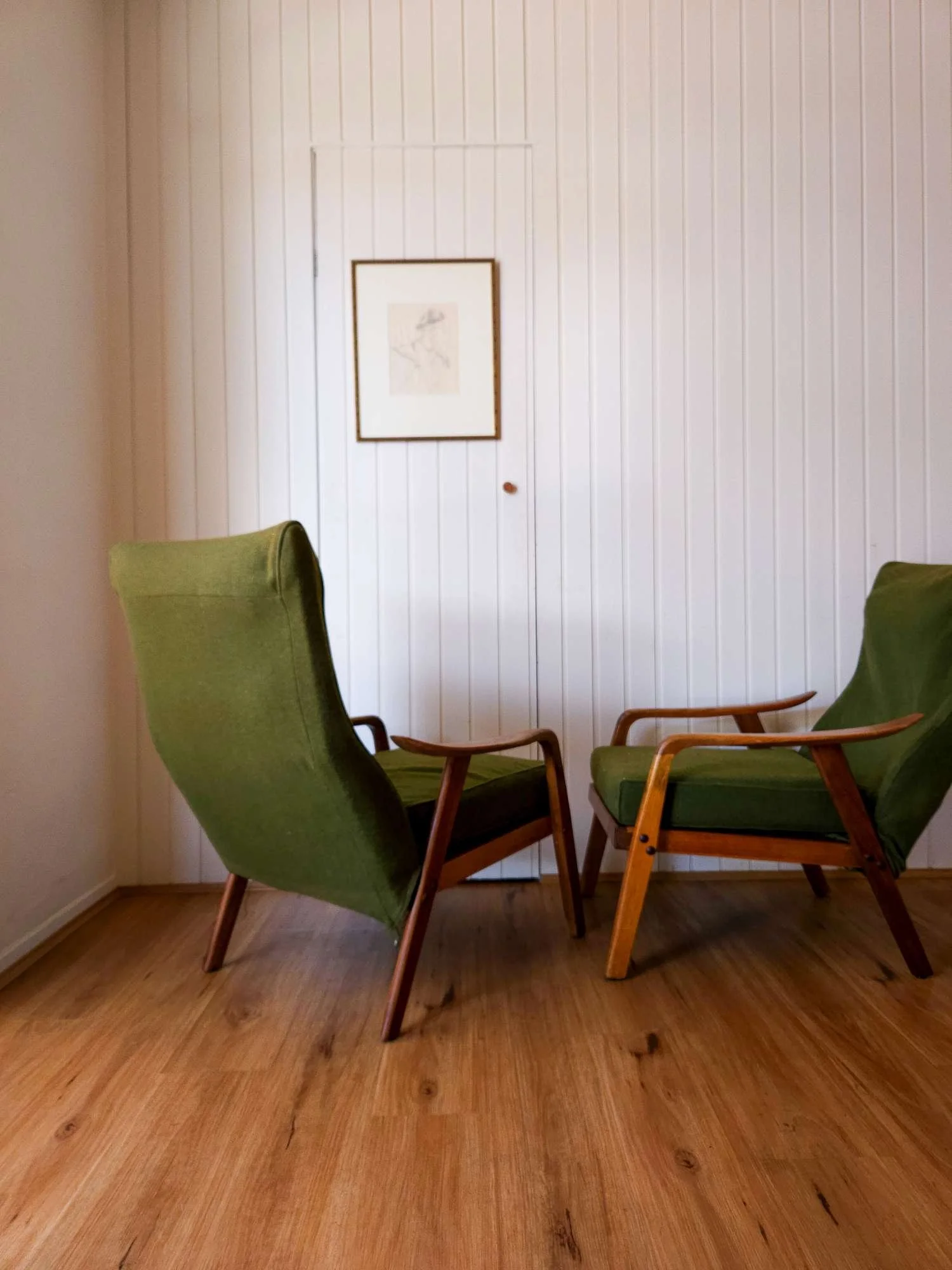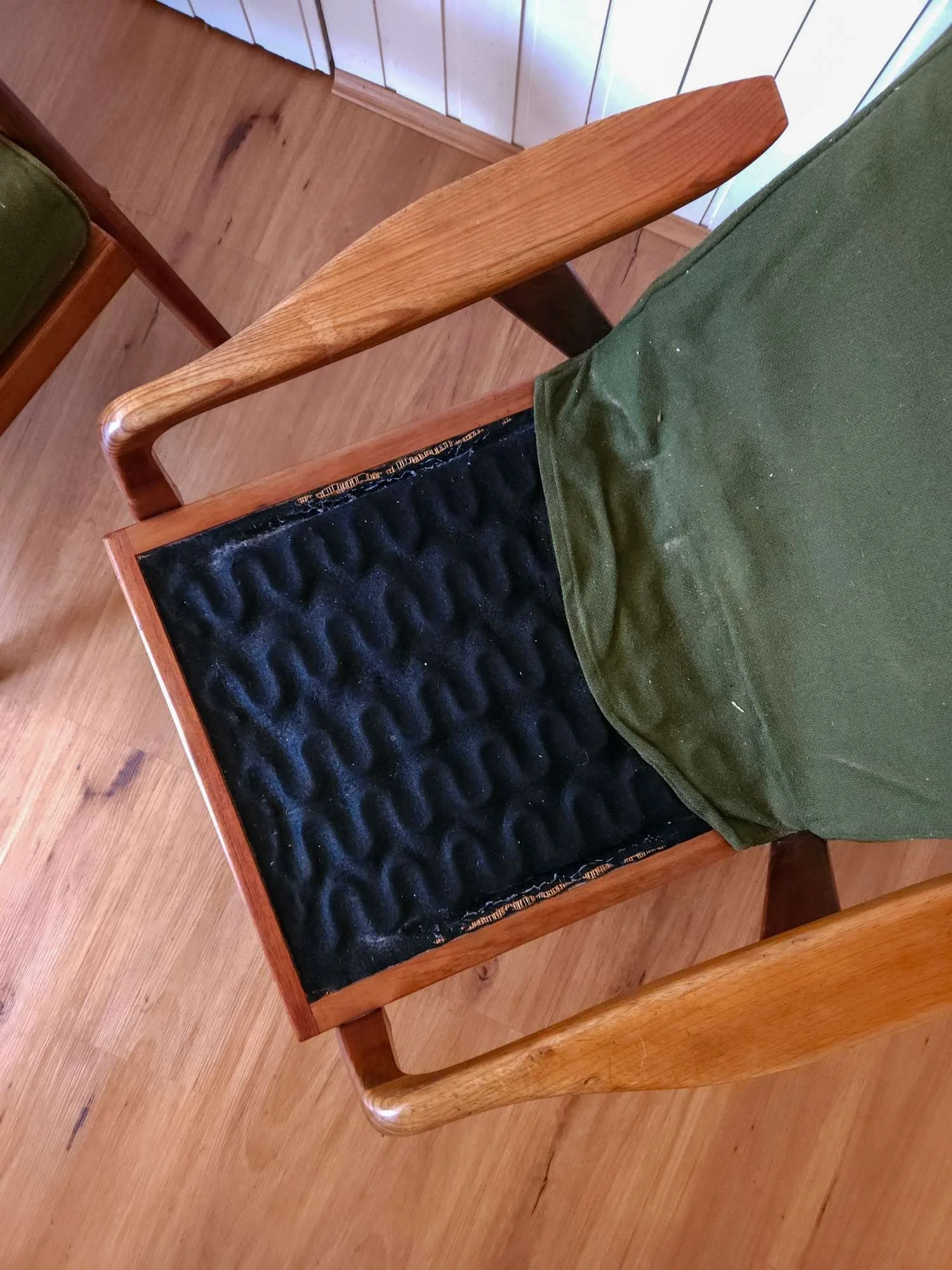 Pair of mid century vintage armchairs with original green wool upholstery.