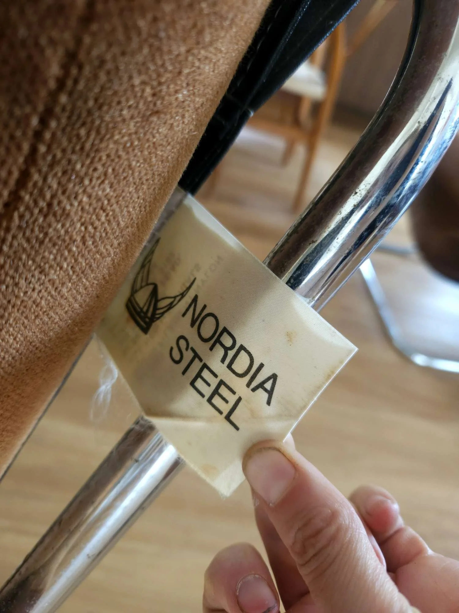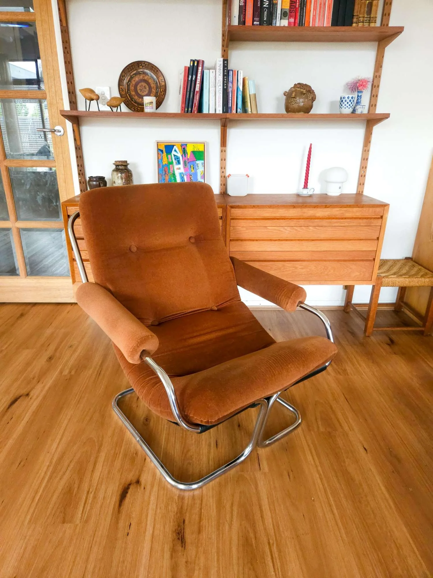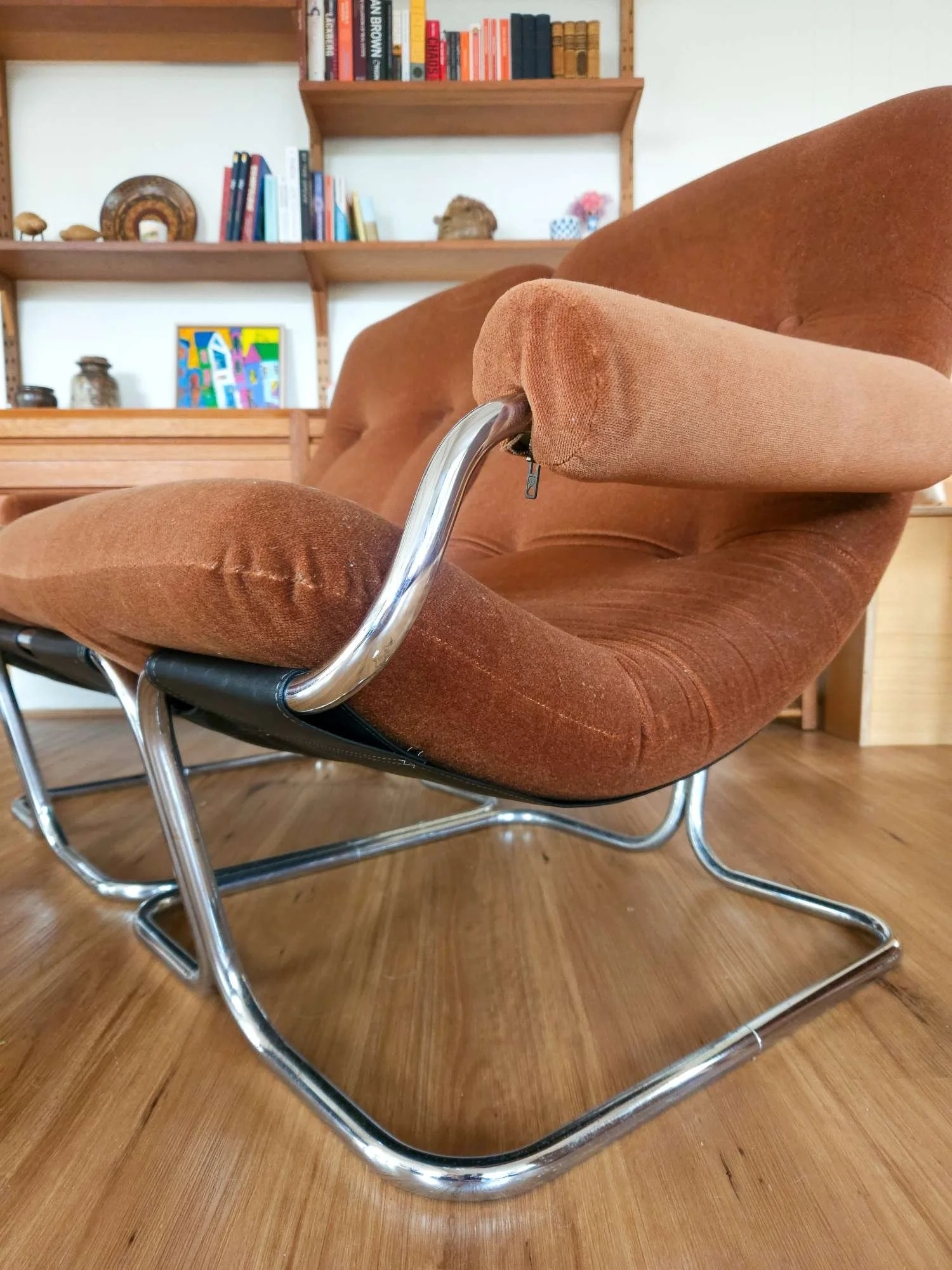 Features polished tubular chrome frame, sling style seat and fabulous brown corduroy upholstery.