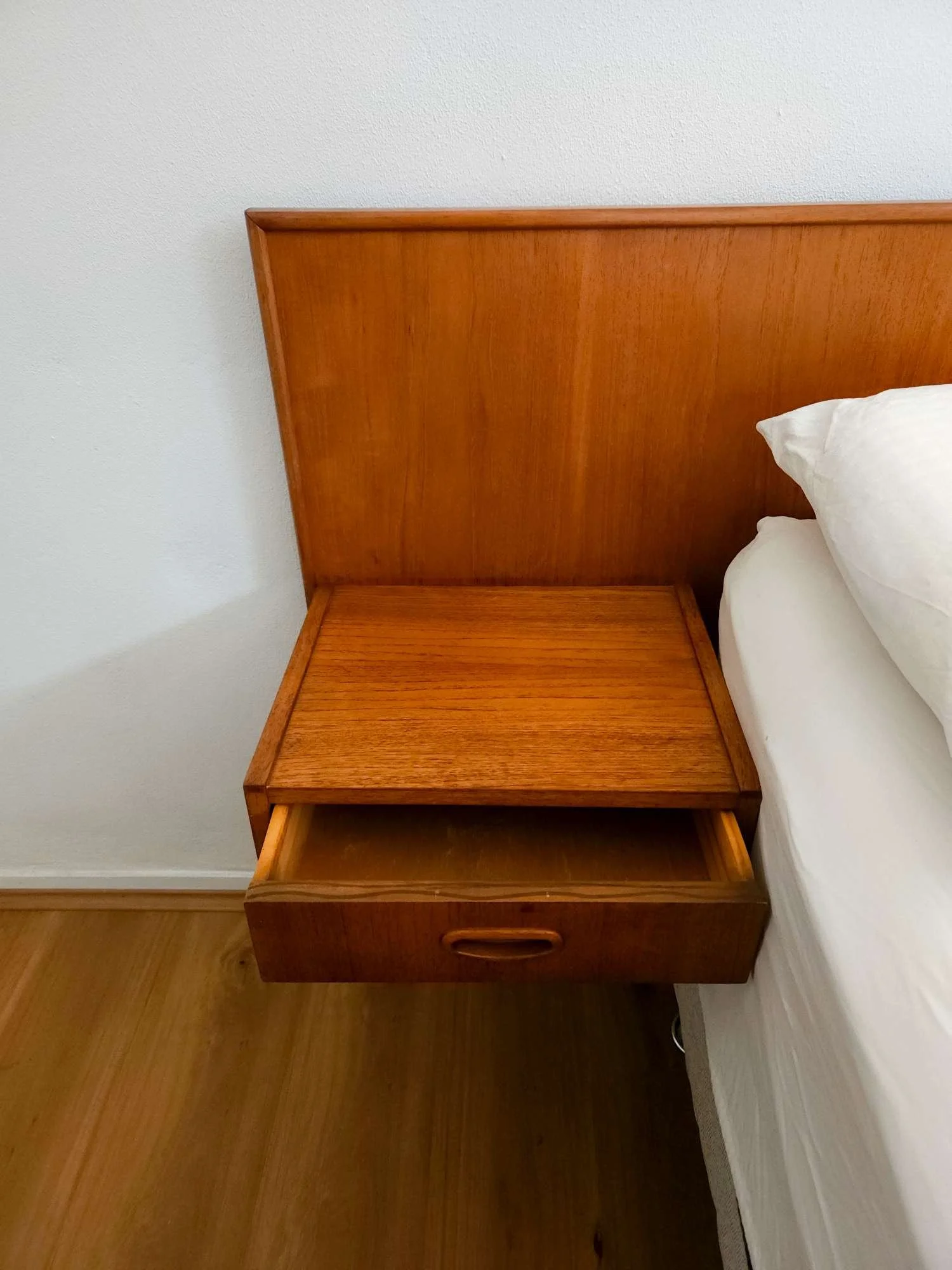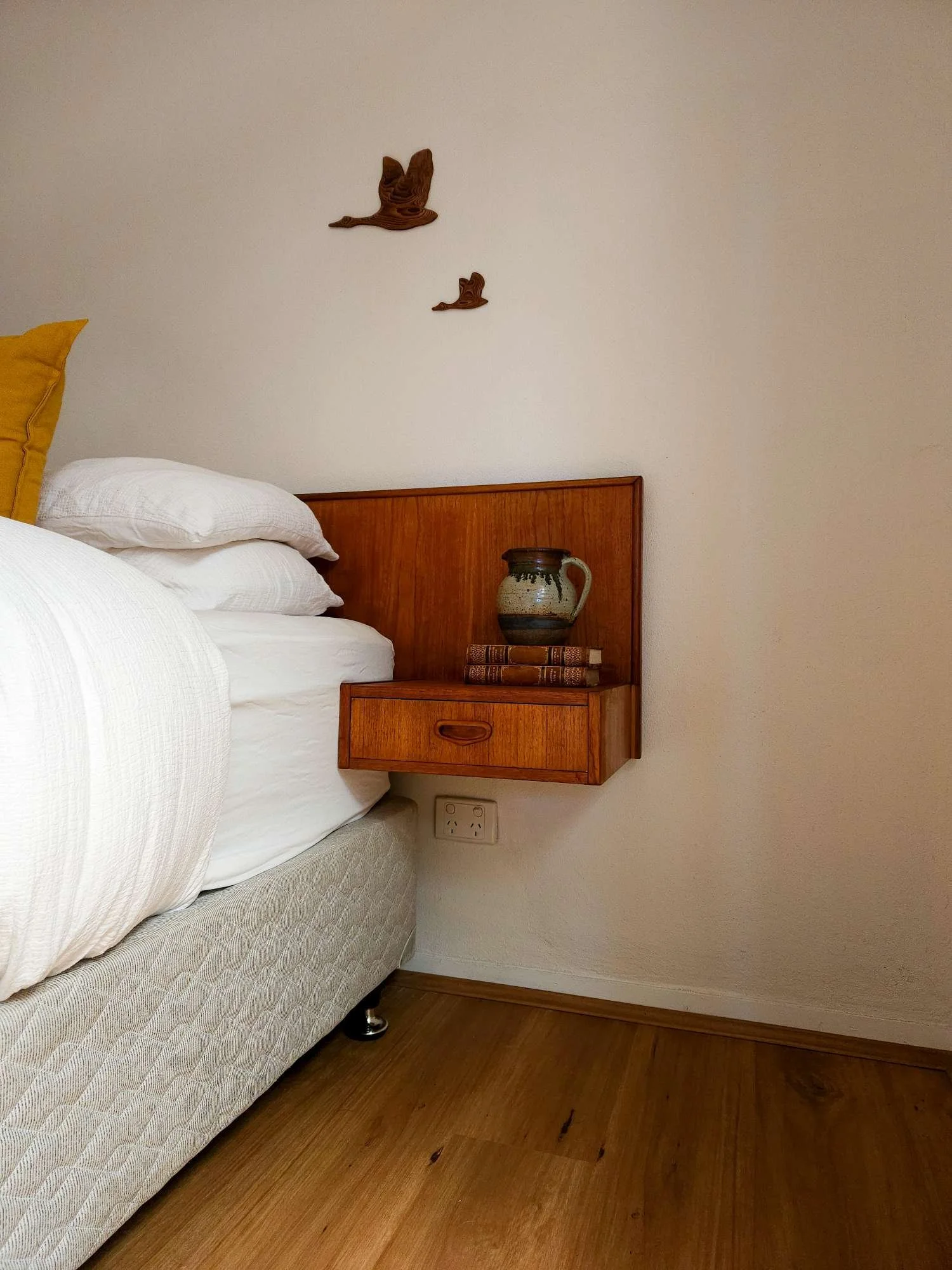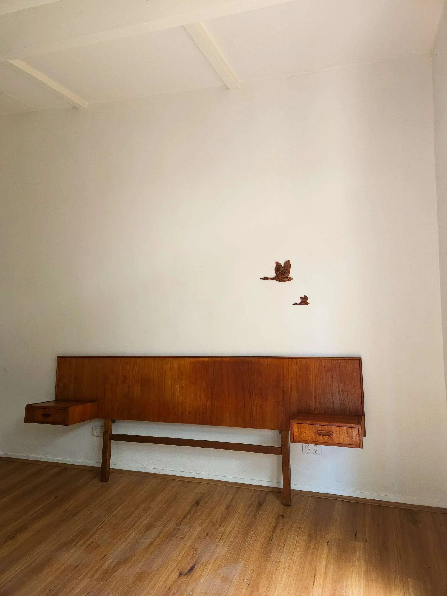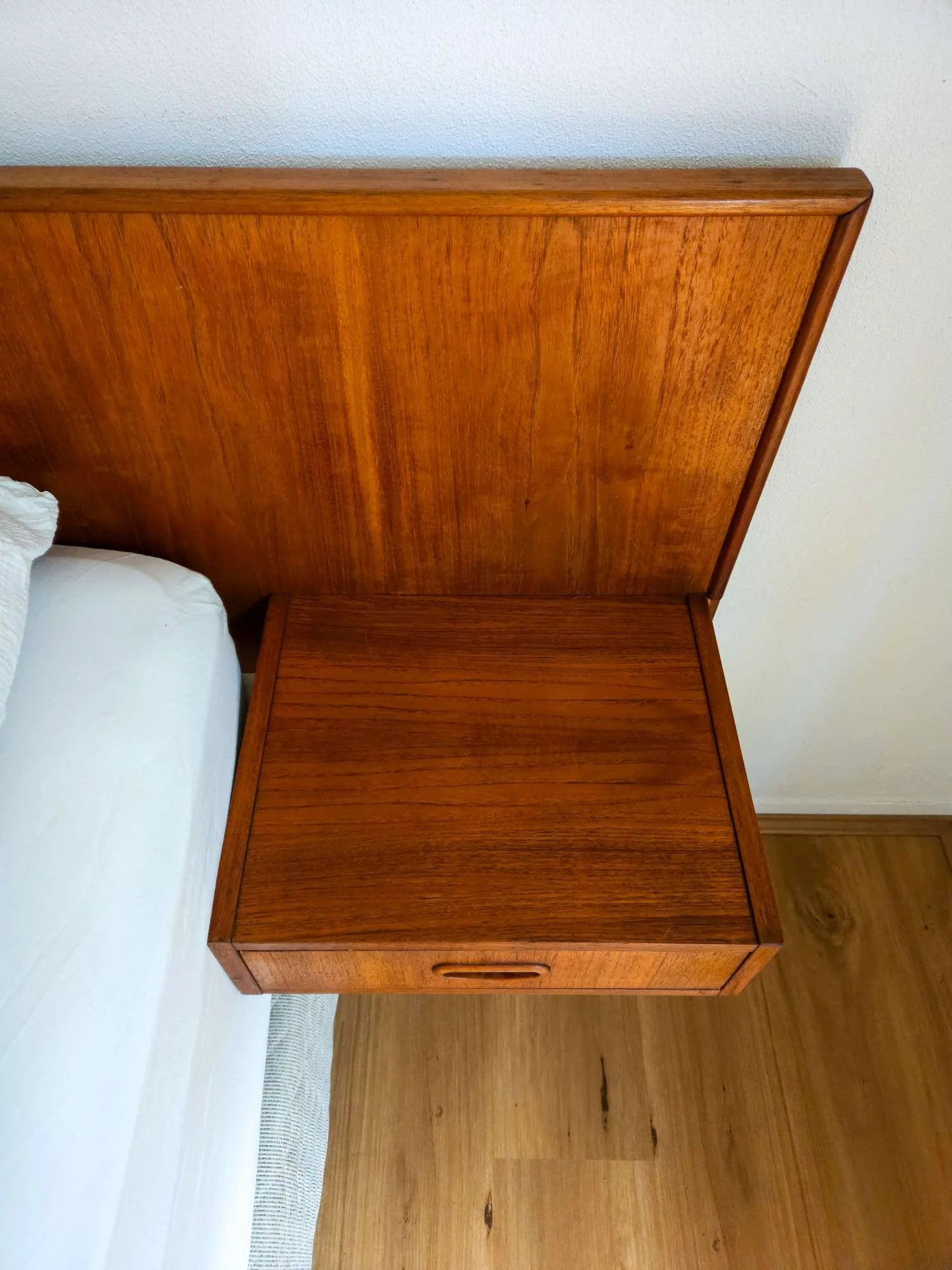 Classic mid century teak bedhead with floating drawers. Suits queen or king mattress as the drawers can be adjusted.