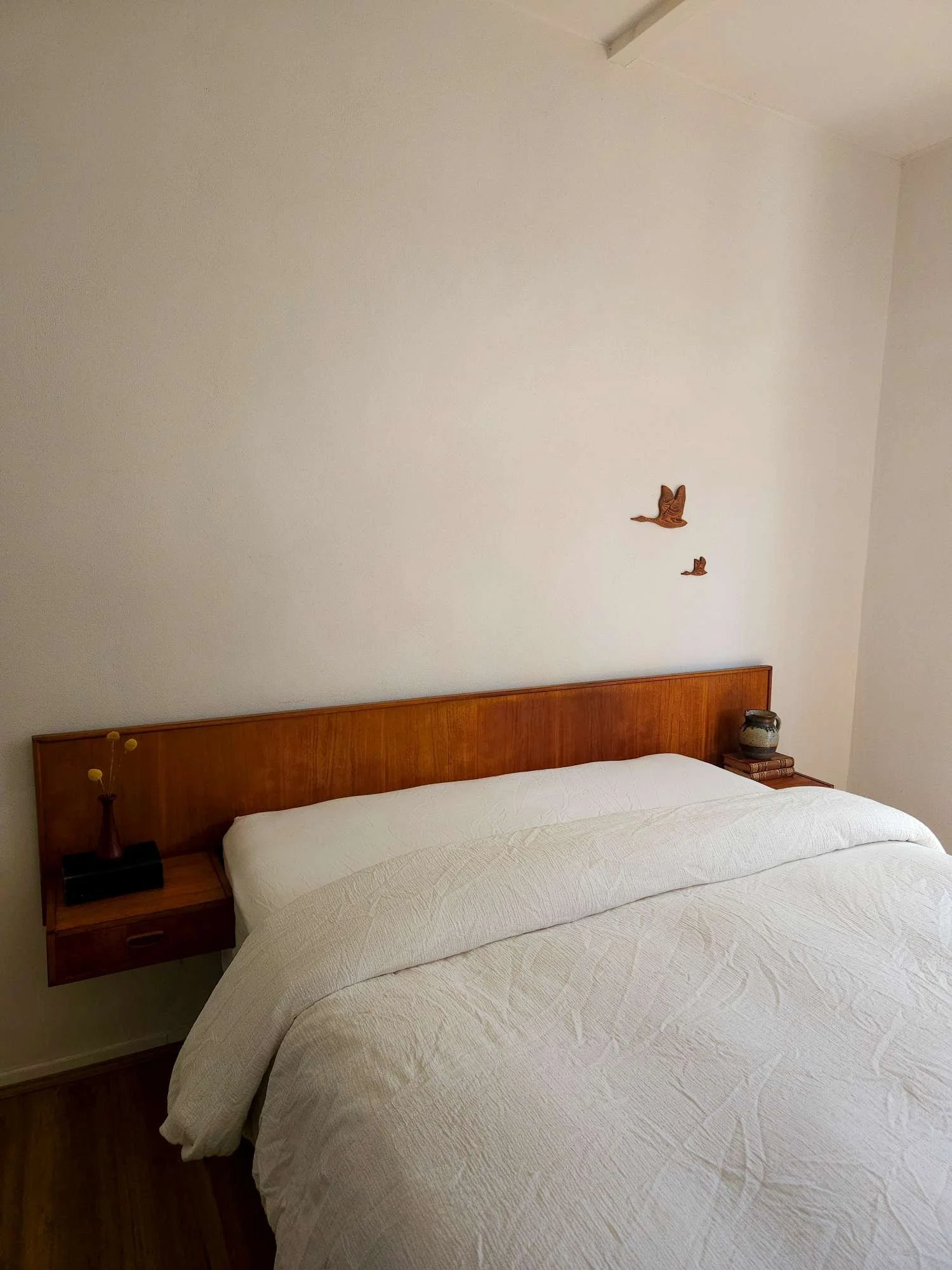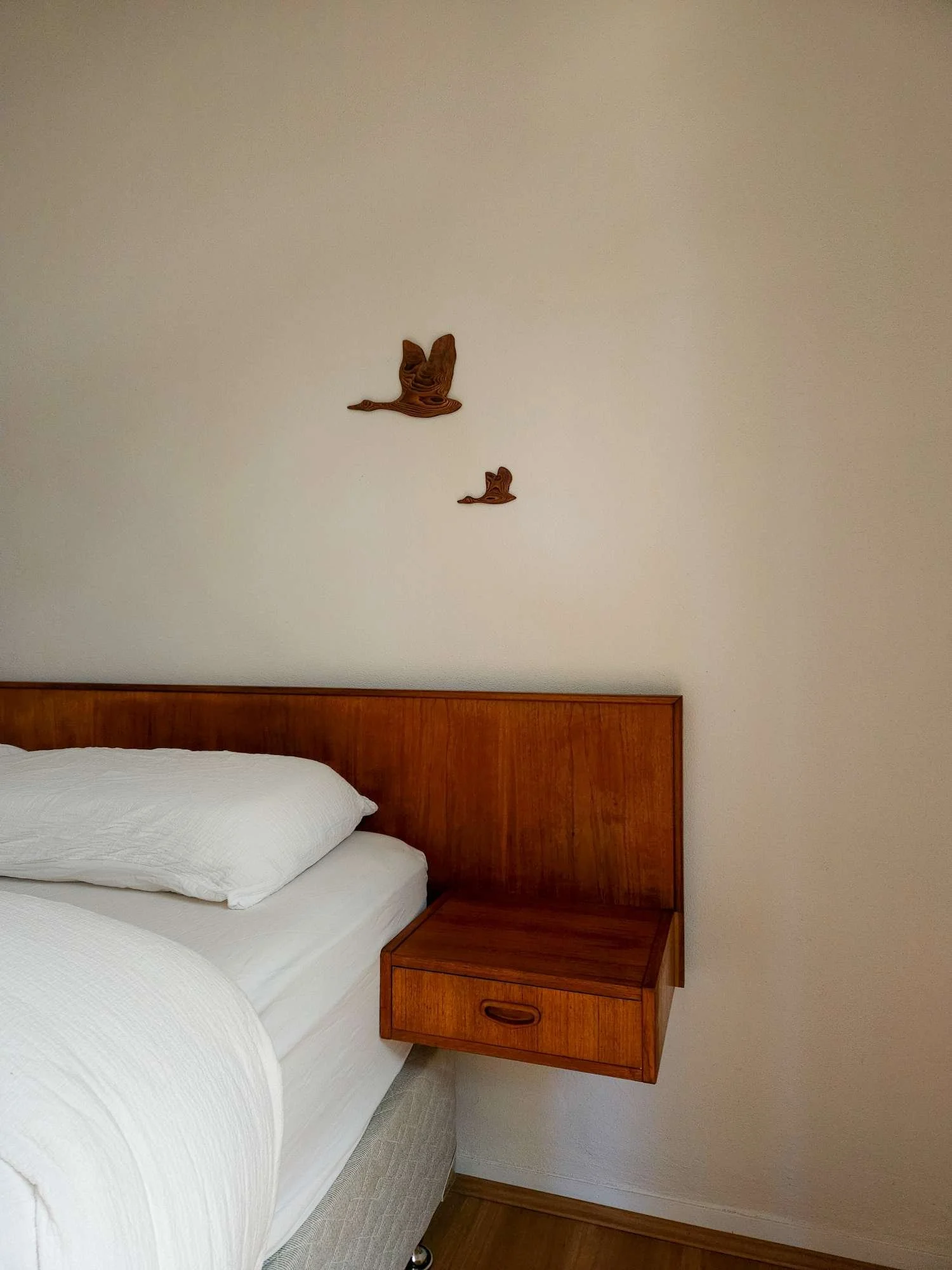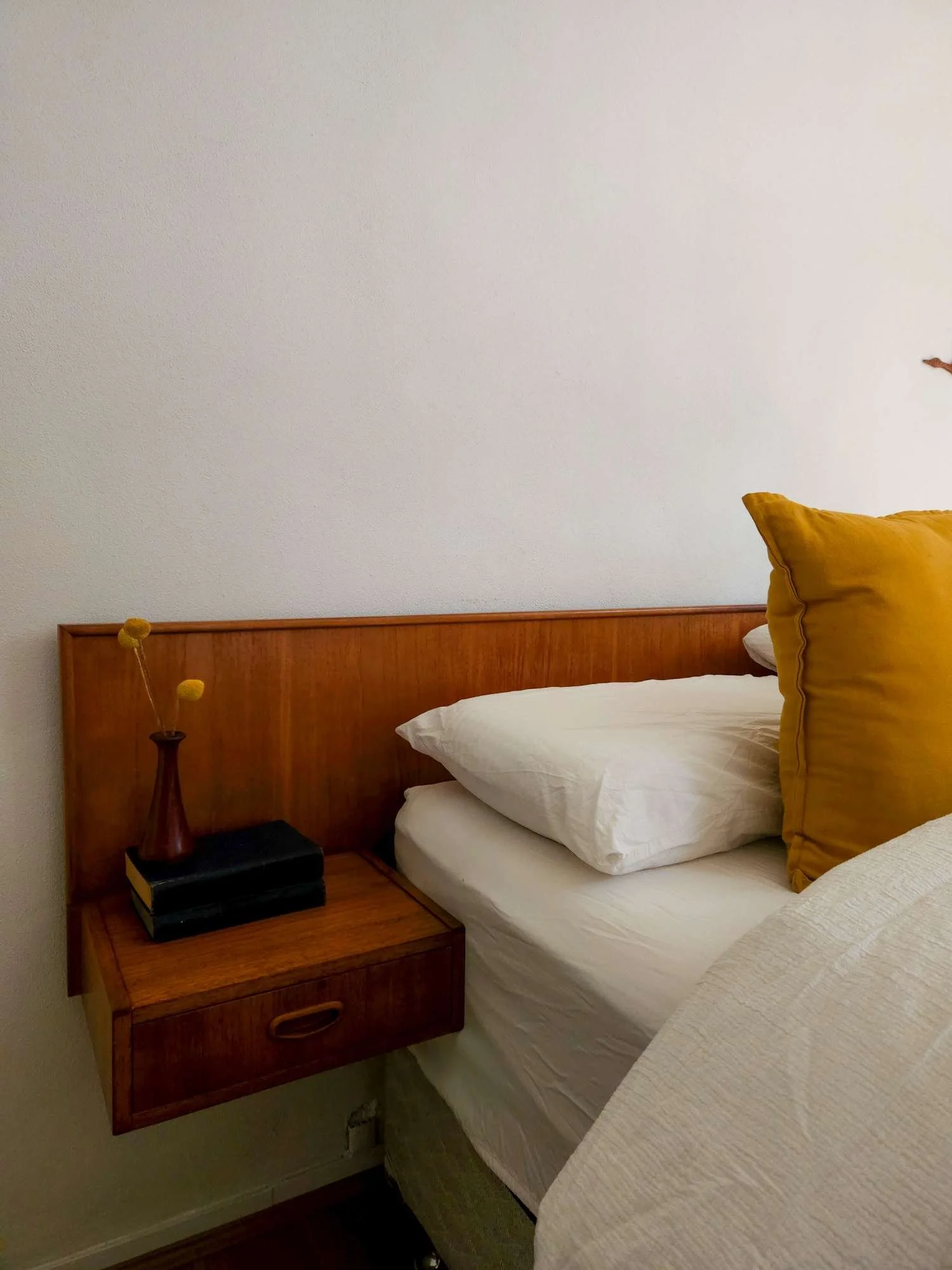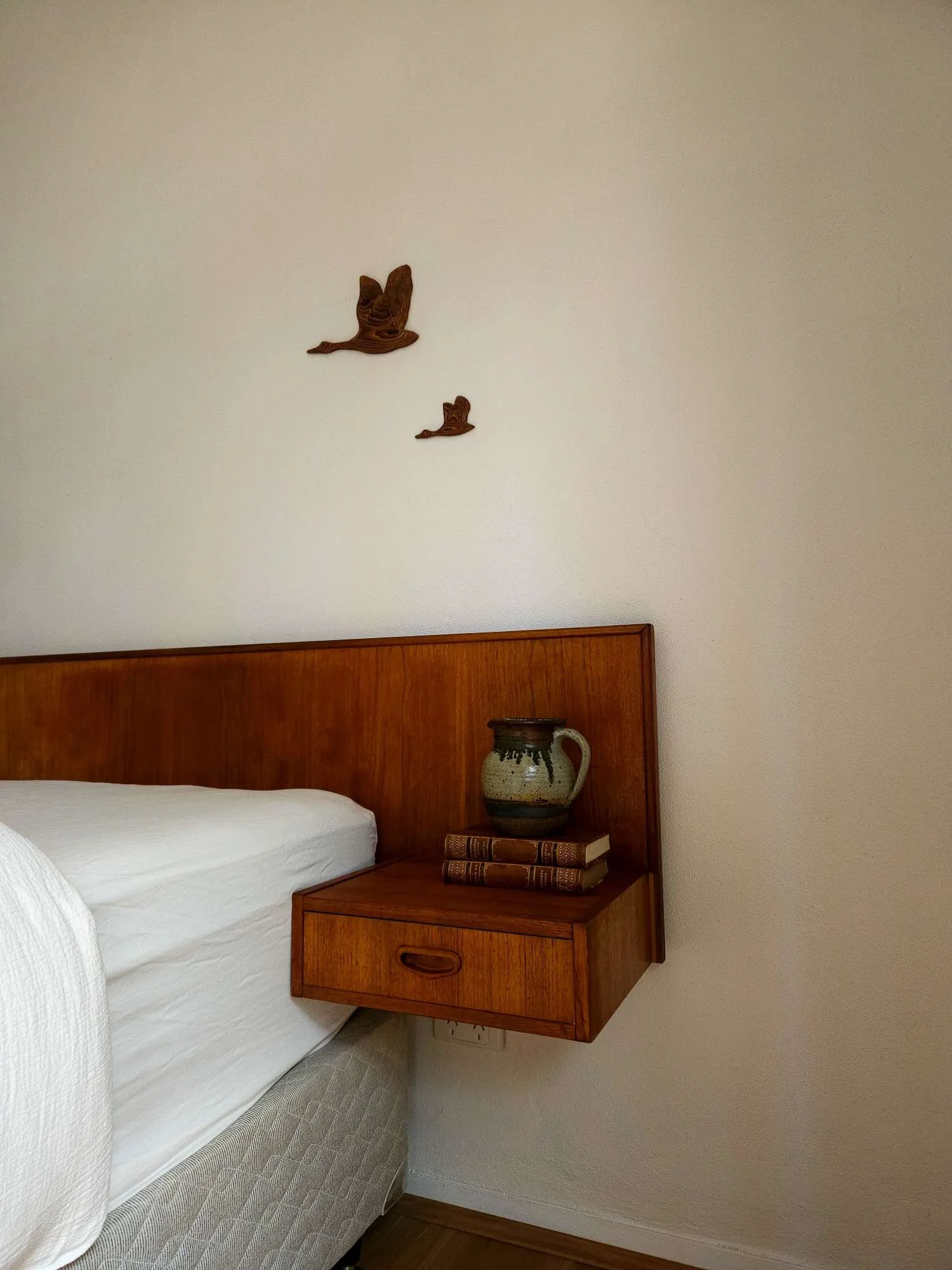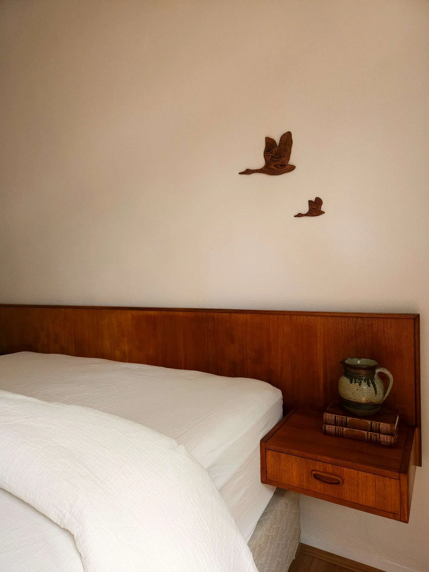 Classic mid century teak bedhead with floating drawers. Suits queen or king mattress as the drawers can be adjusted.