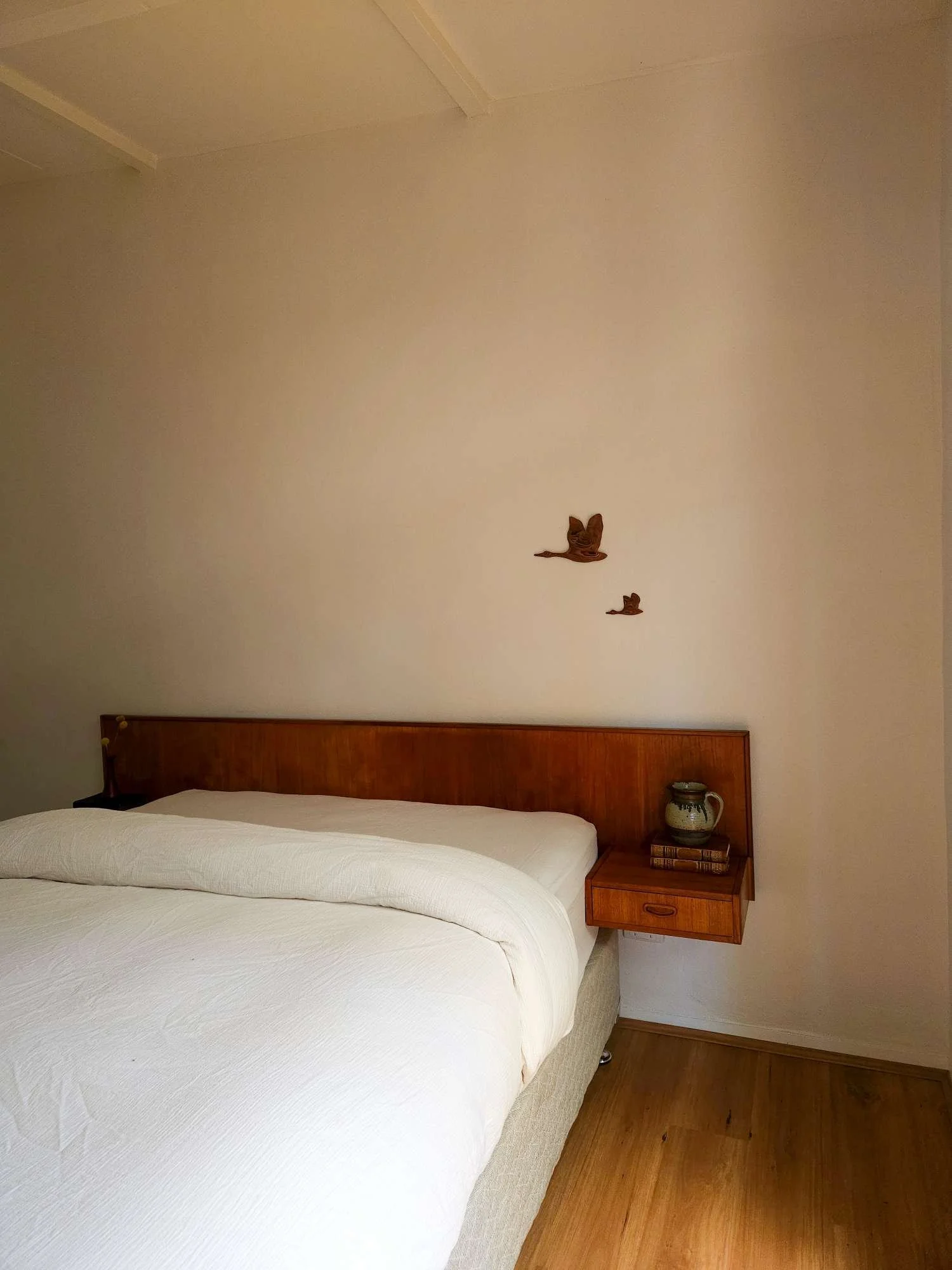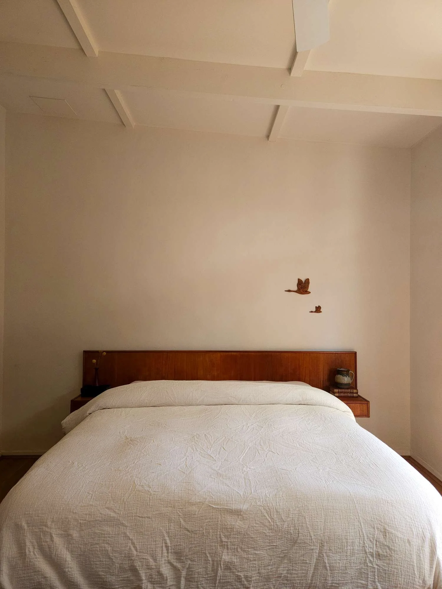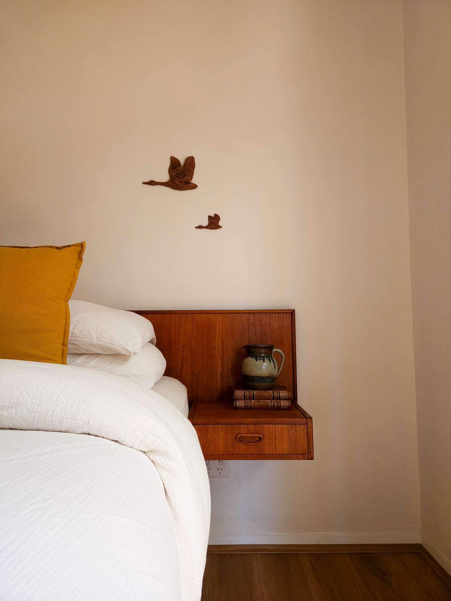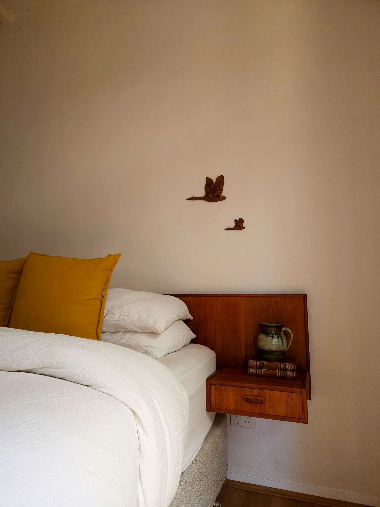 Classic mid century teak bedhead with floating drawers. Suits queen or king mattress as the drawers can be adjusted.