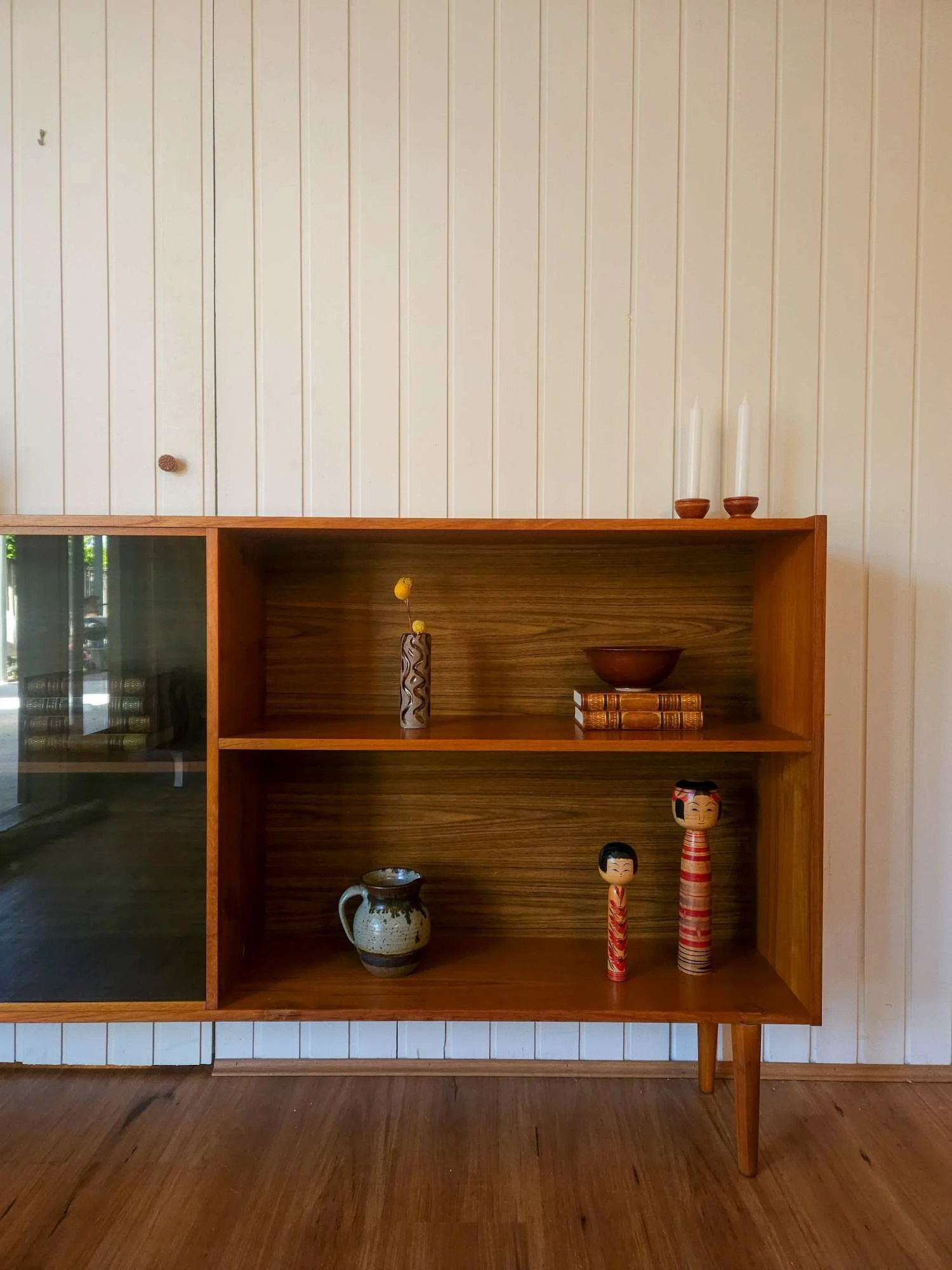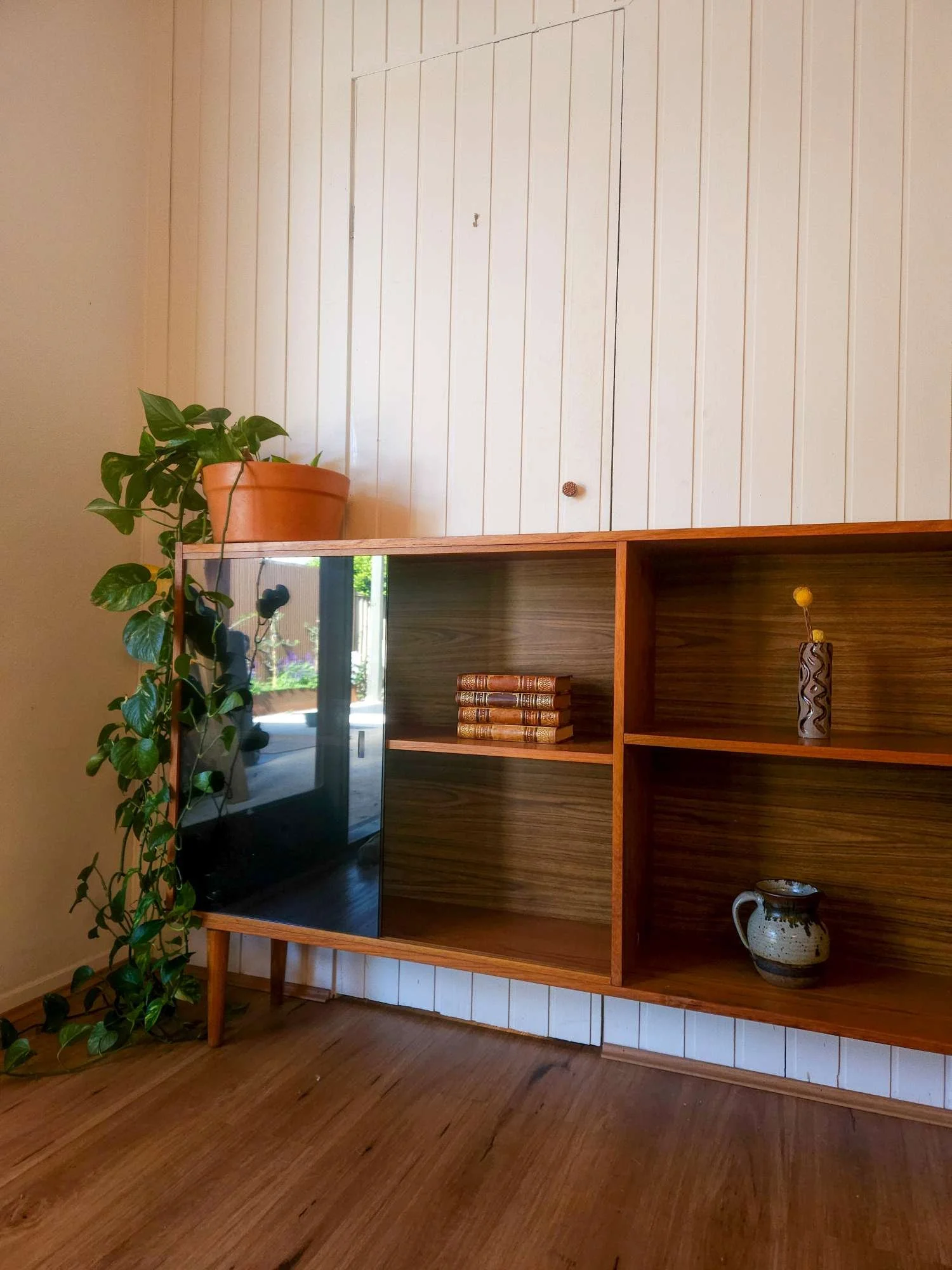 Features tapered timber legs and glass sliding doors