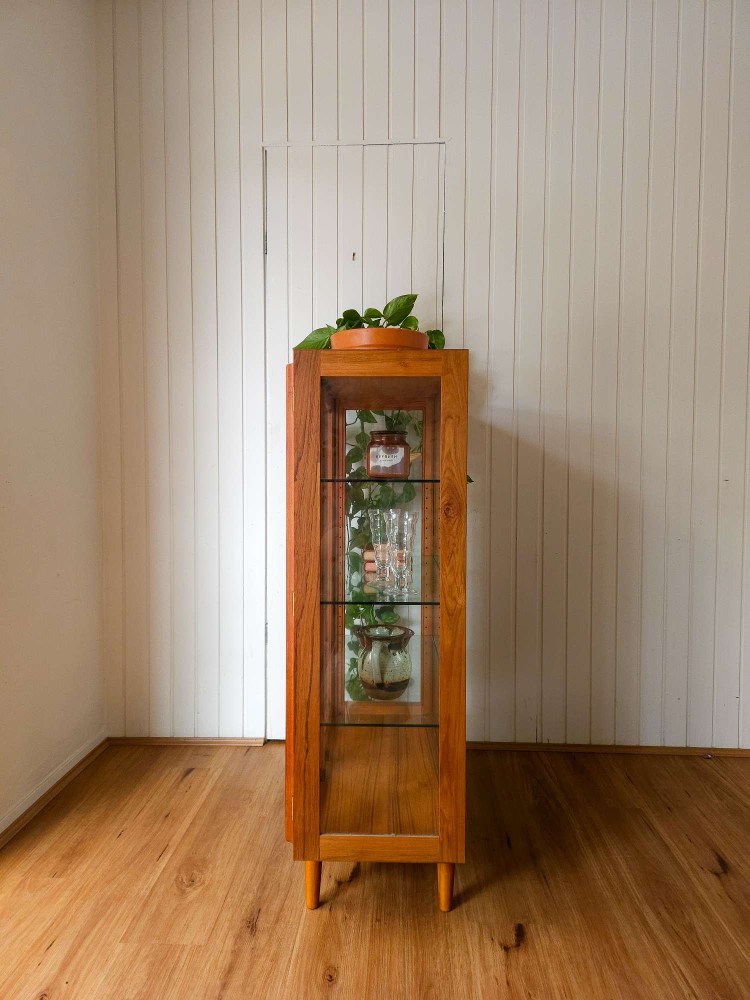 Features tapered legs and nice quality deep profile to the doors. Internal glass shelves are adjustable.