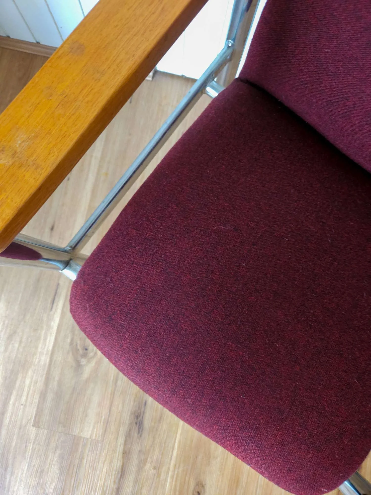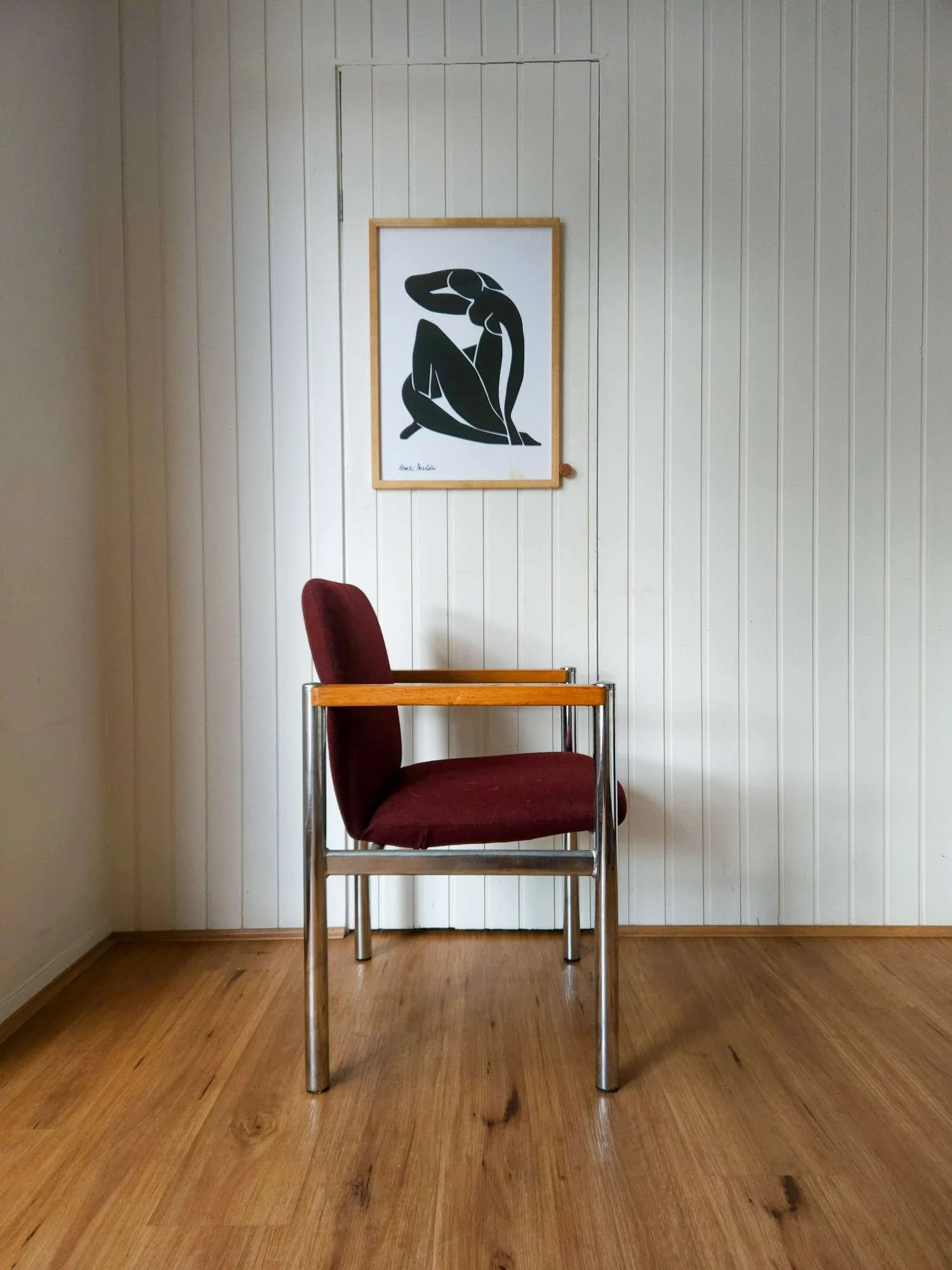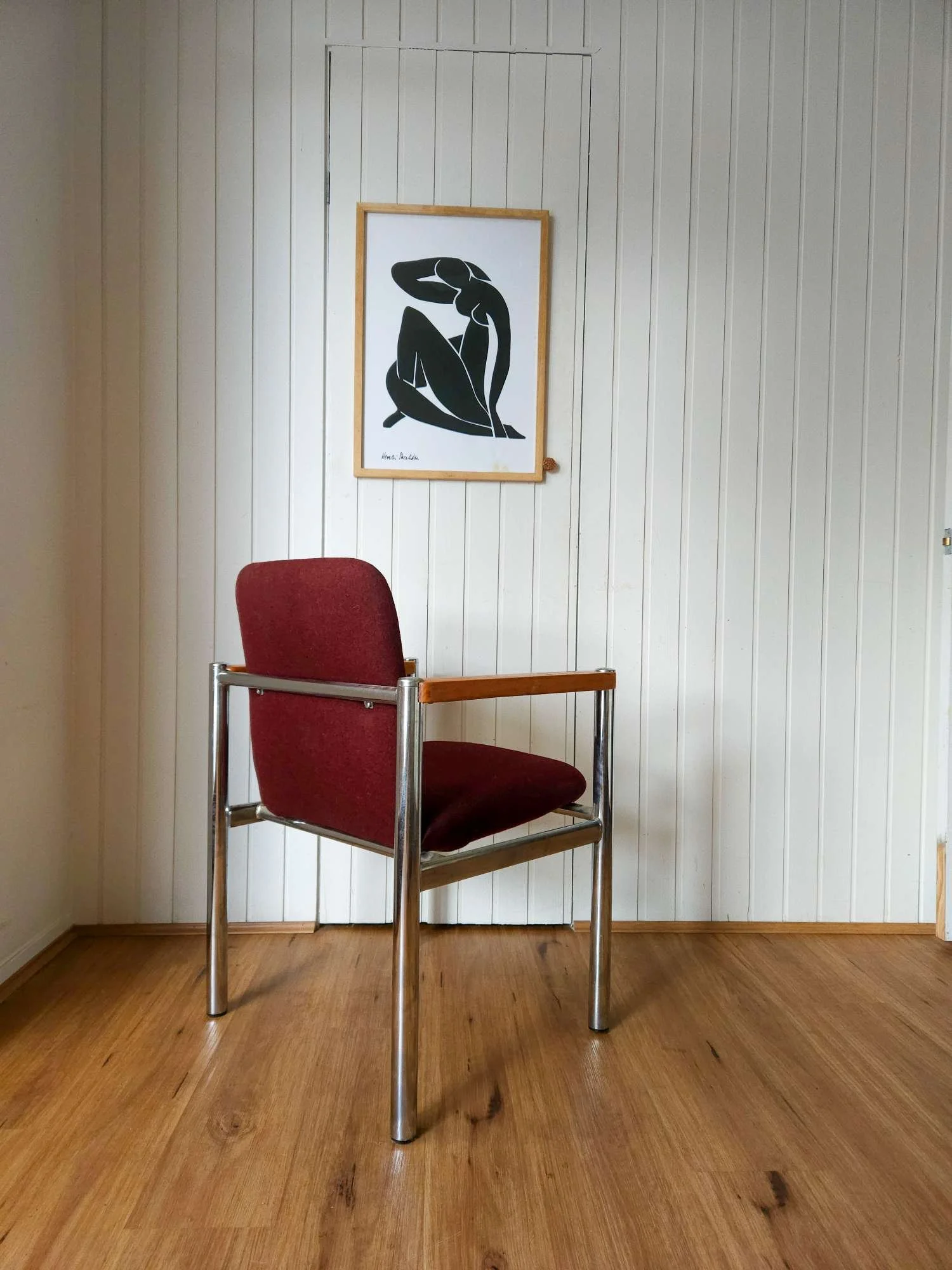 Fabulous vintage Sebel armchair with steel frame and solid teak armrests. Recently upholstered in maroon fabric.