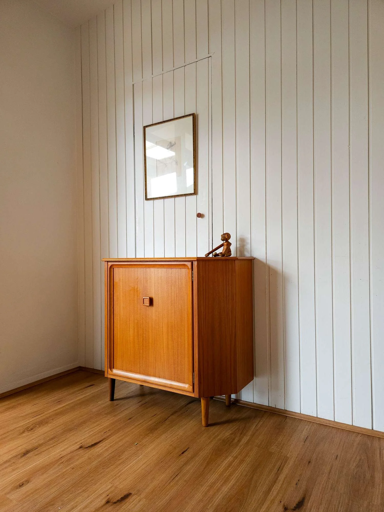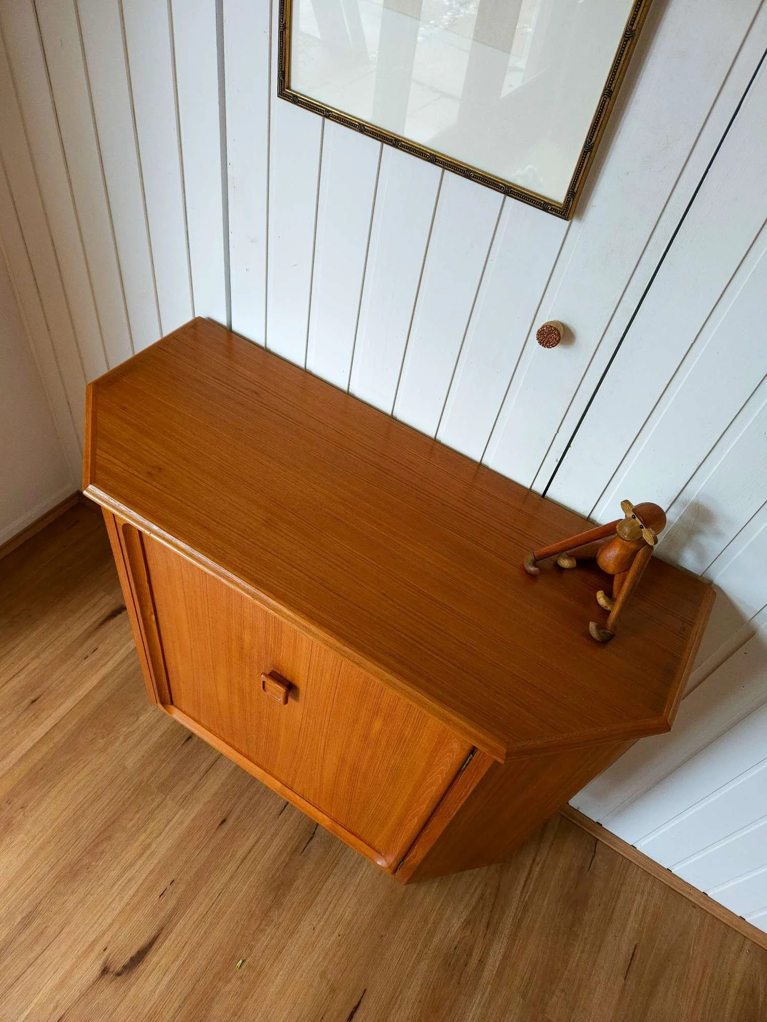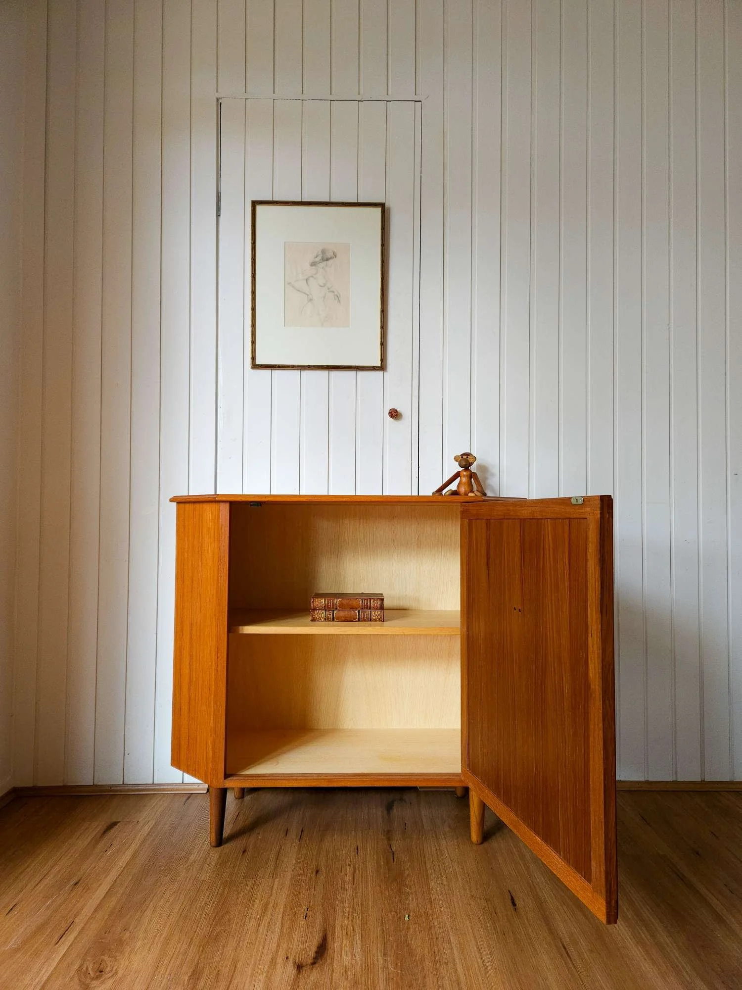 Elevated on tapered timber legs and features adjustable middle shelf.