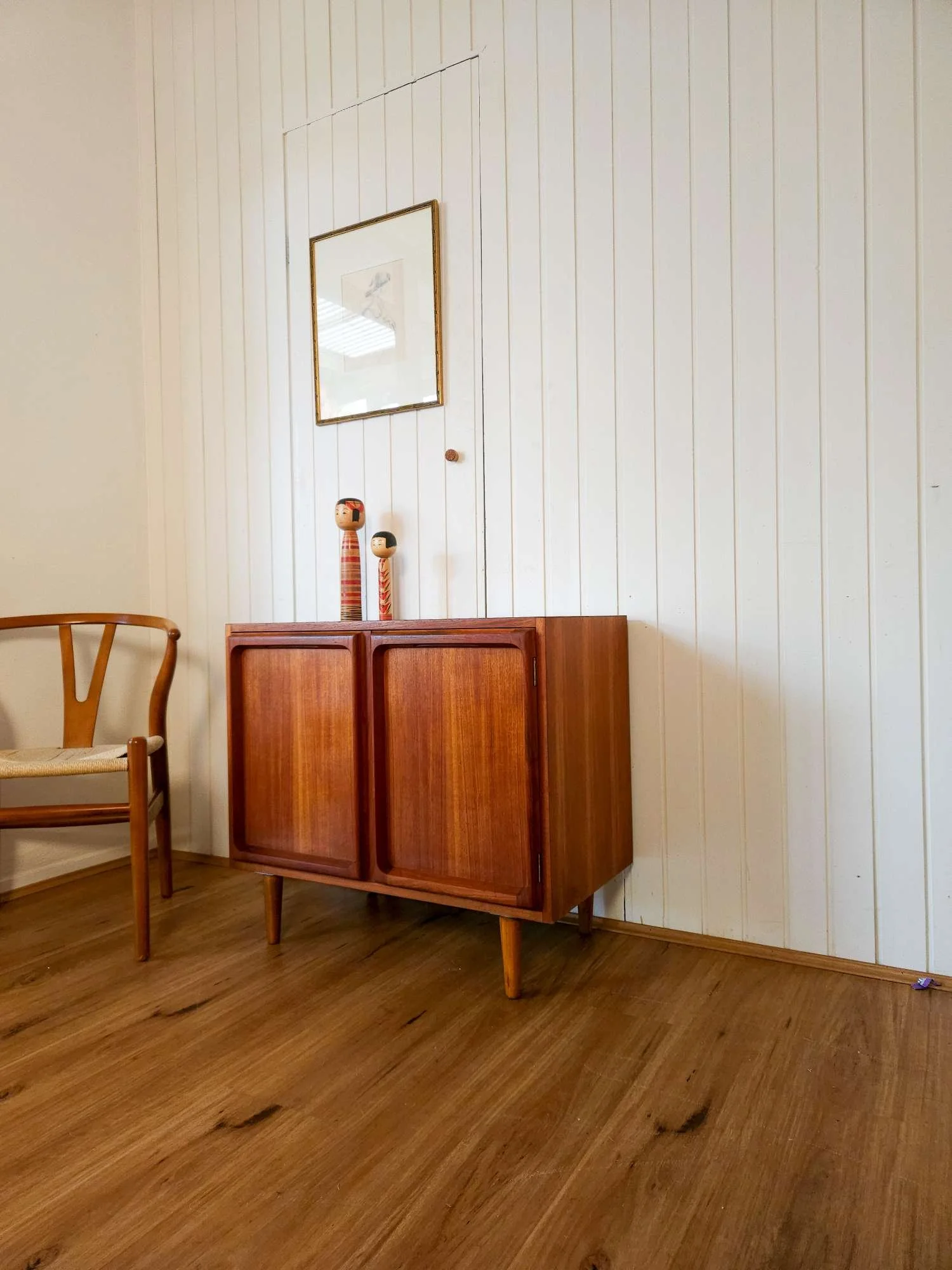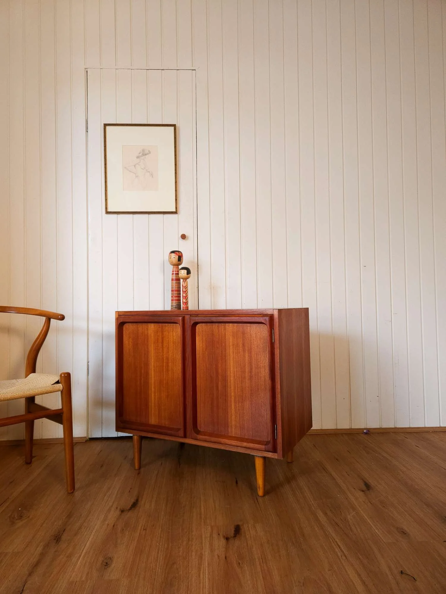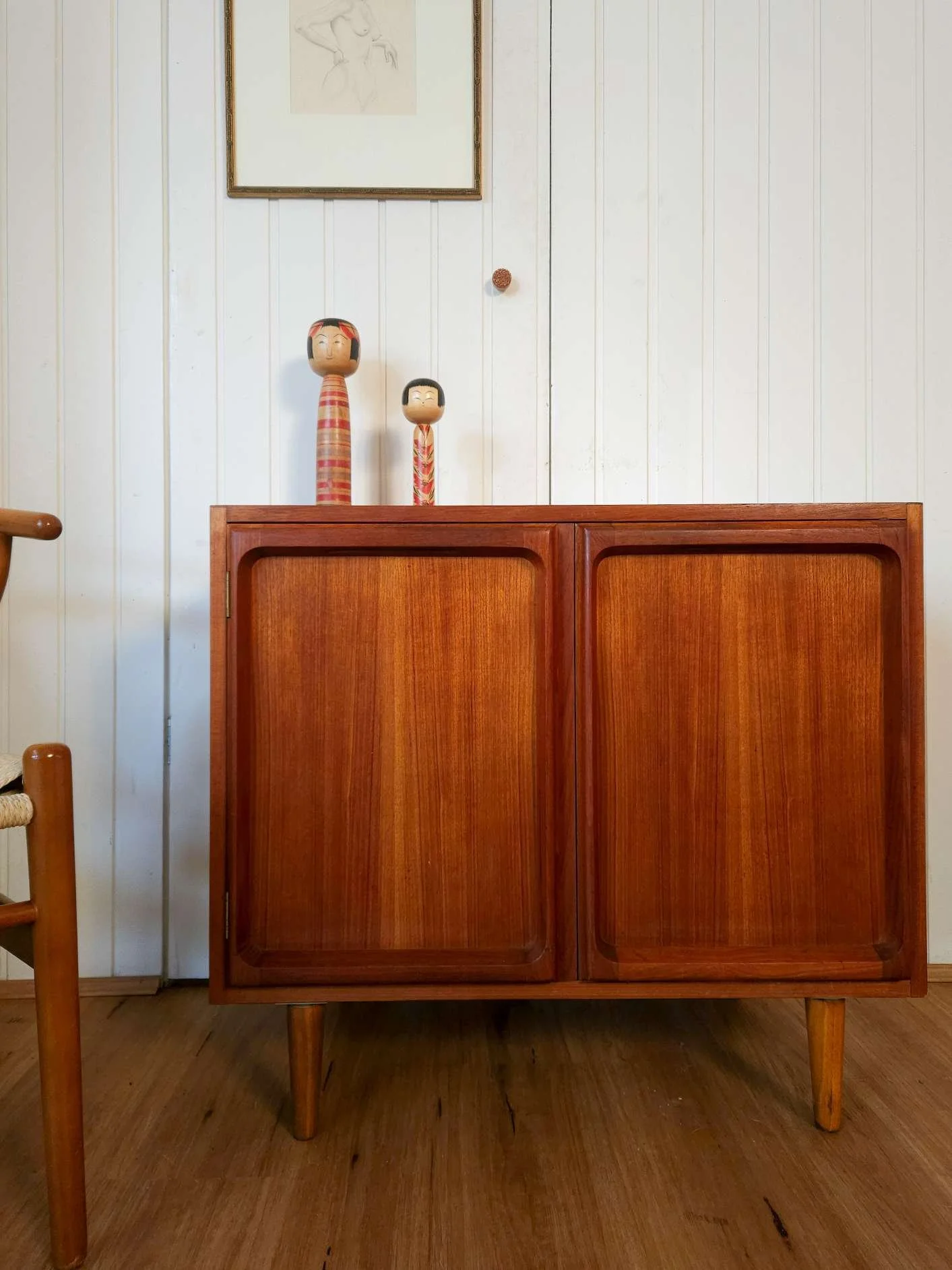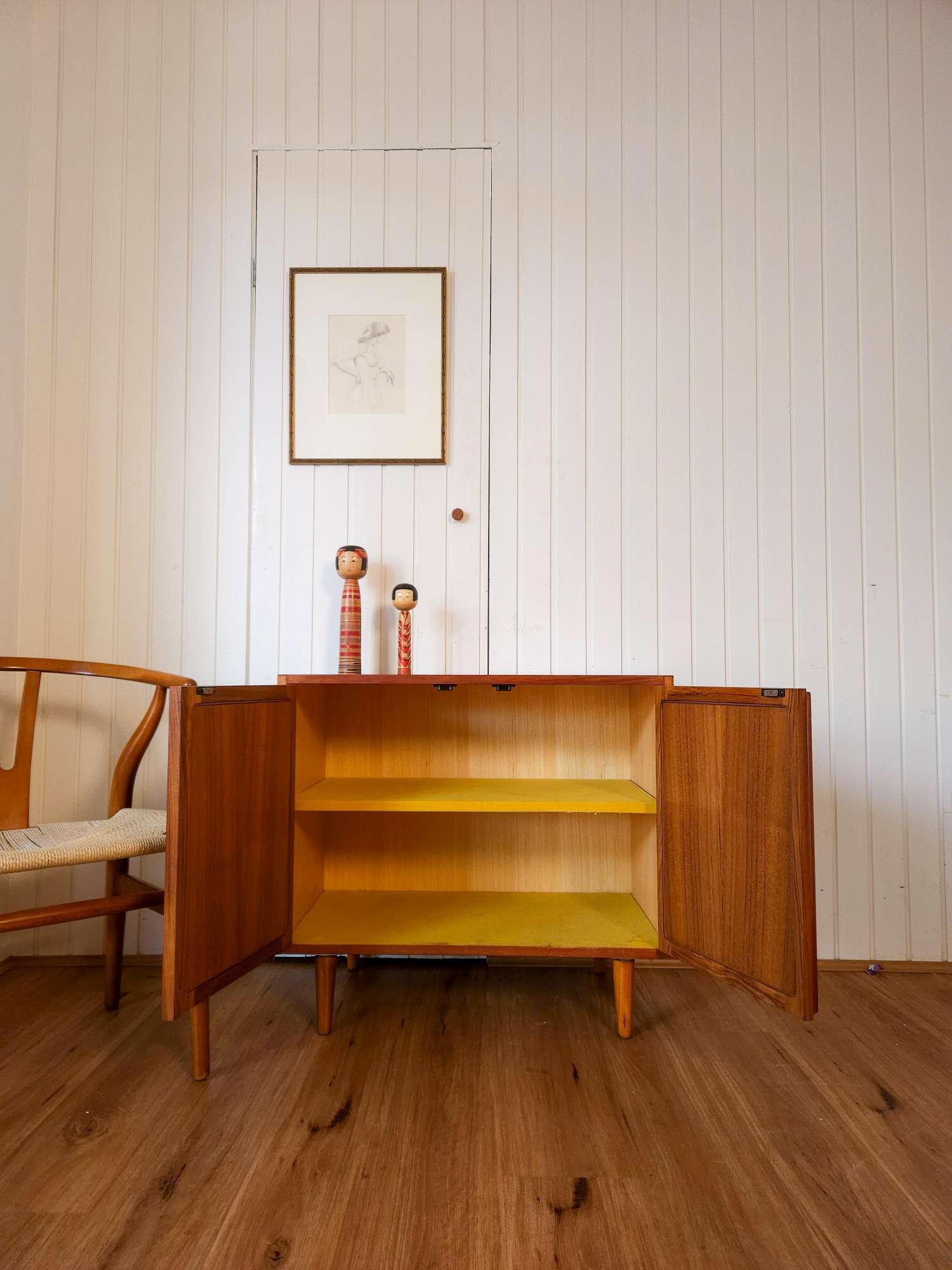 Lovely warm teak grain with bold profile doors. Felt lined shelf and tapered timber legs.
