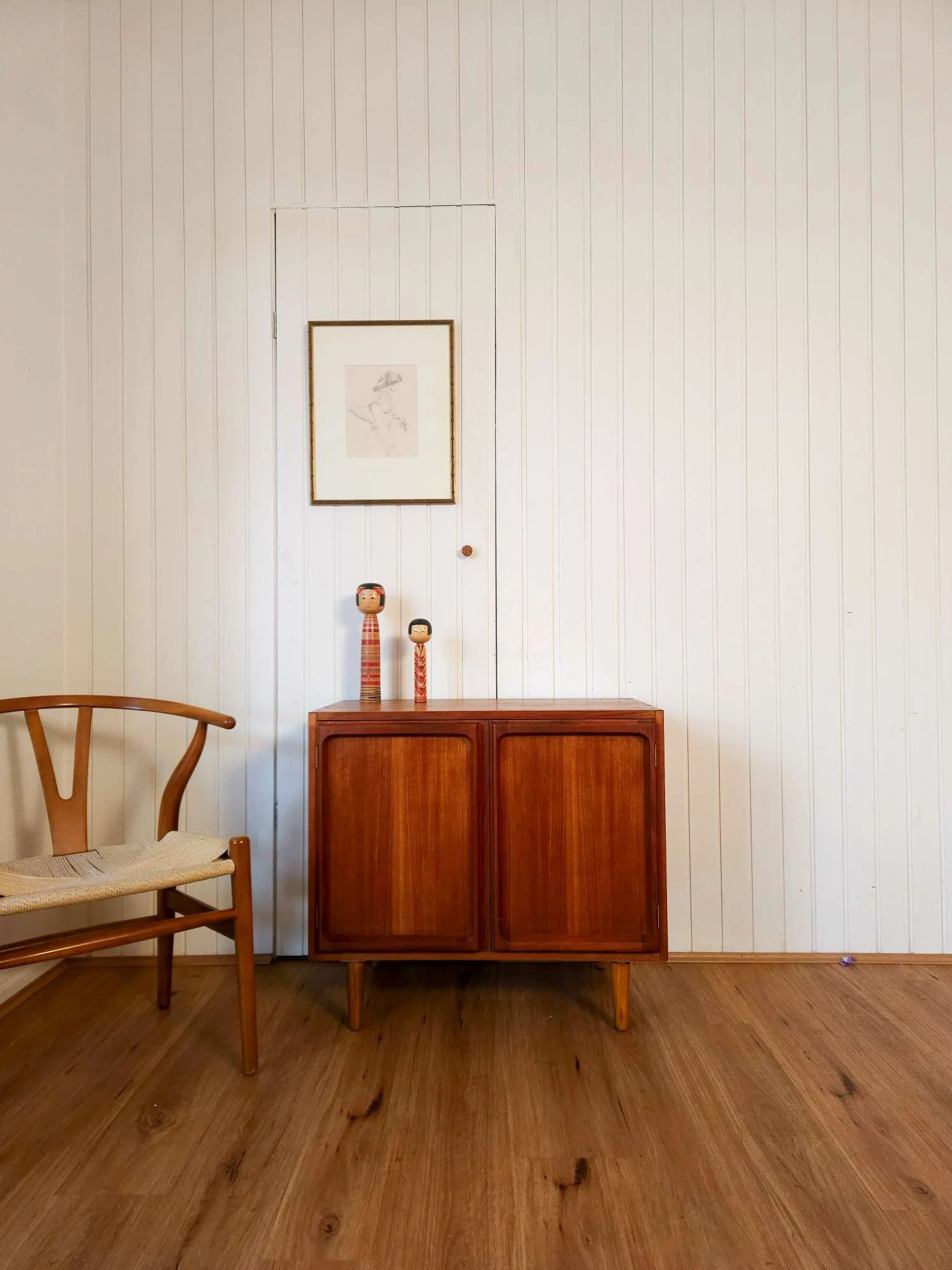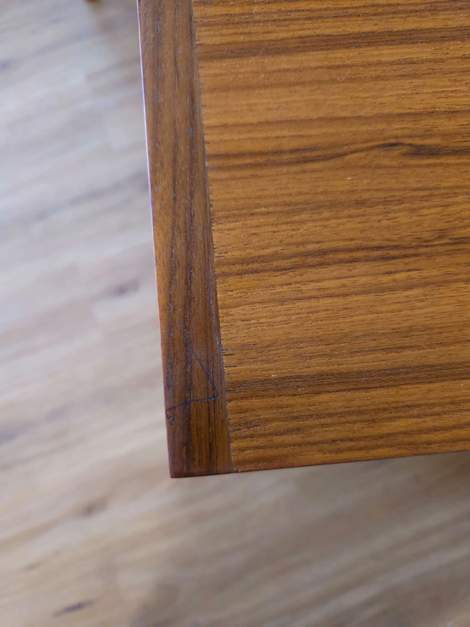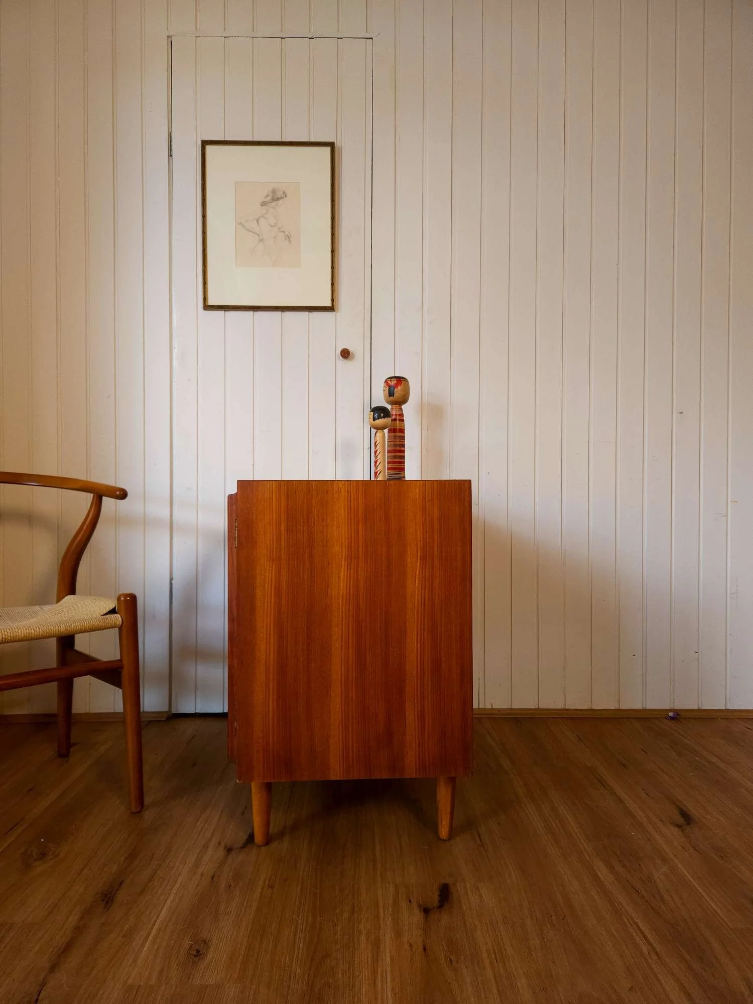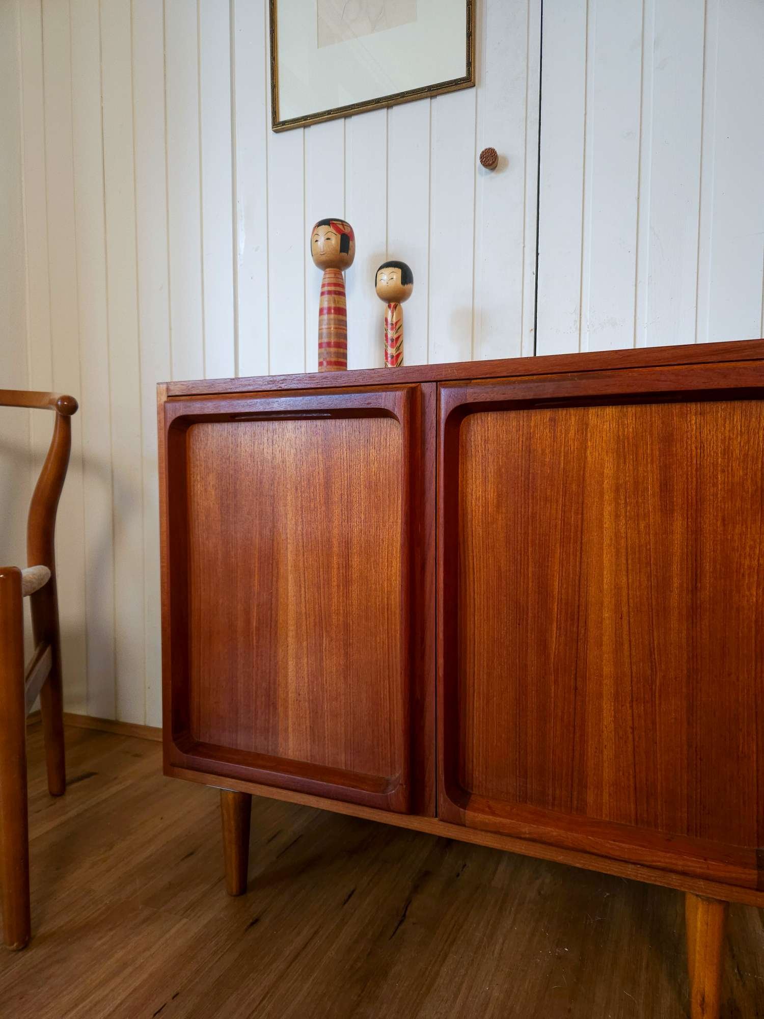 Lovely warm teak grain with bold profile doors. Felt lined shelf and tapered timber legs.